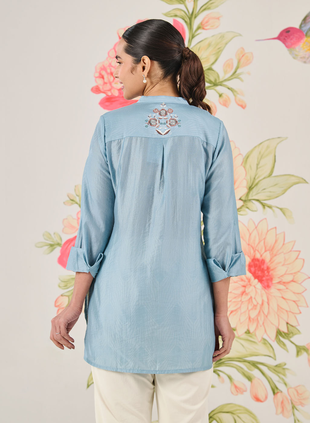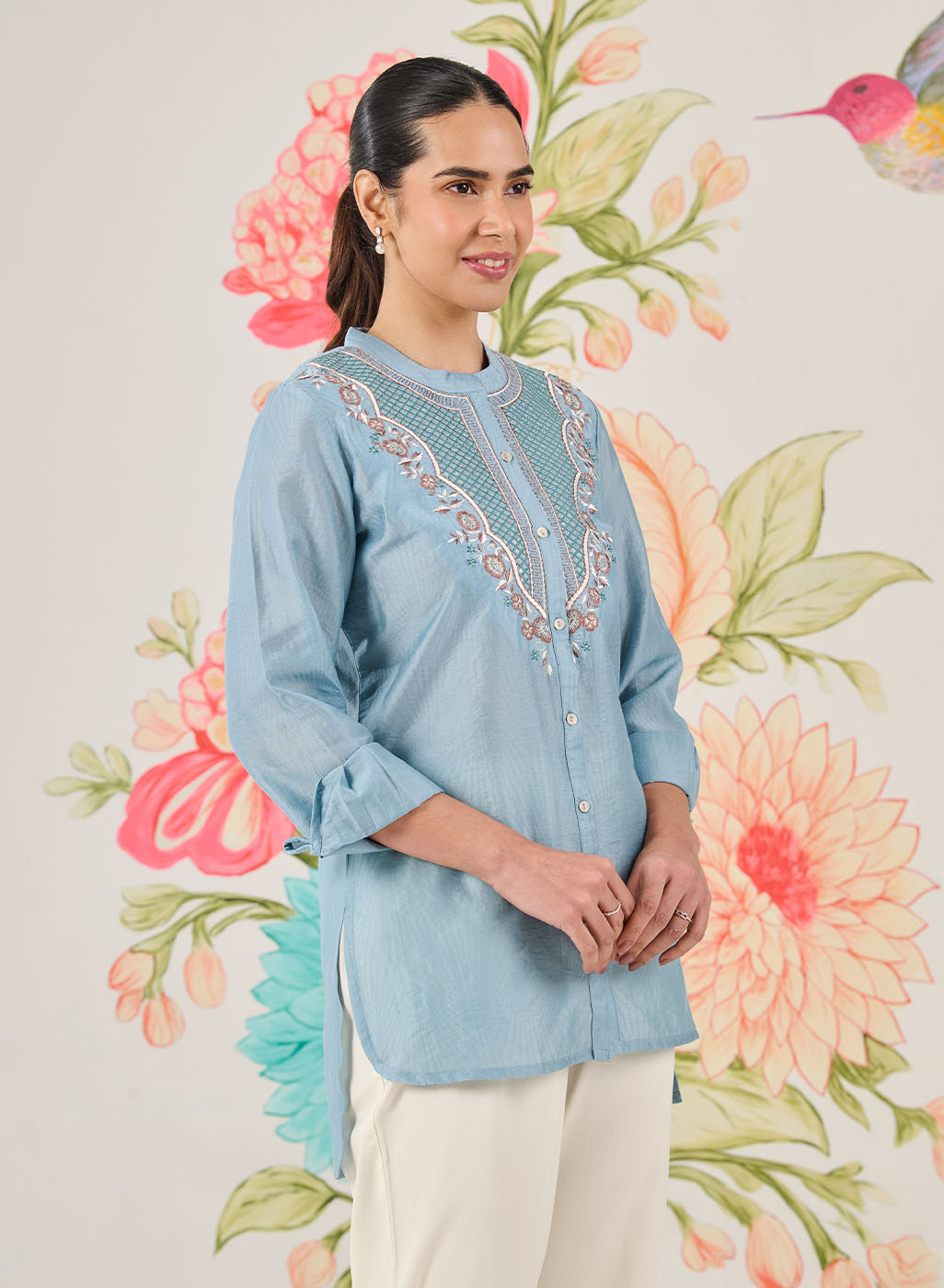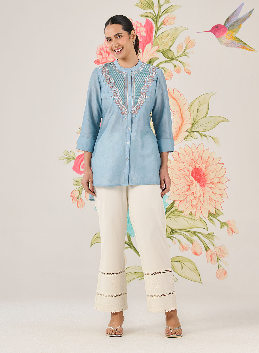 Feminine, polished and summery, this light blue shirt is perfect for everyday plans that need a little refinement. Delicate resham embroidery with sequin and zari highlights adds interest, while the lightweight fabric keeps it comfortable all day.