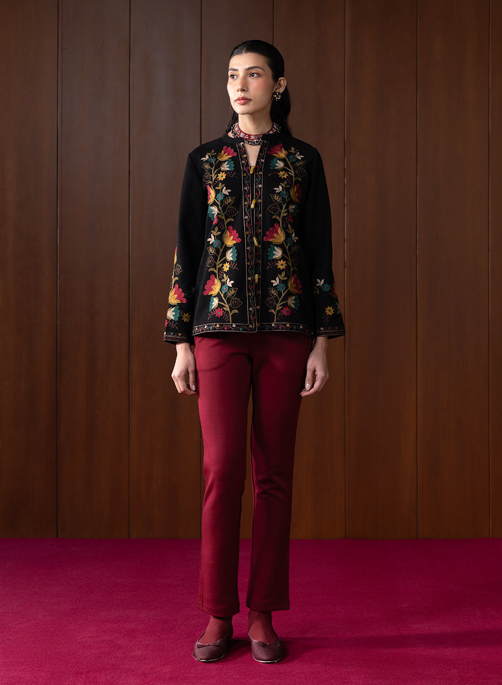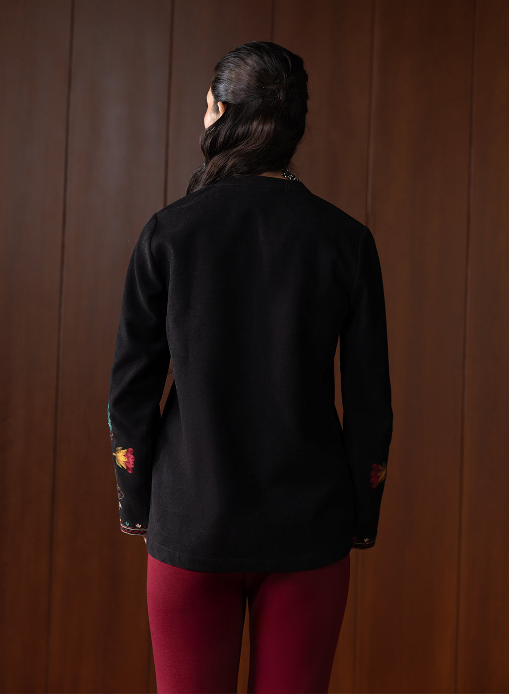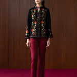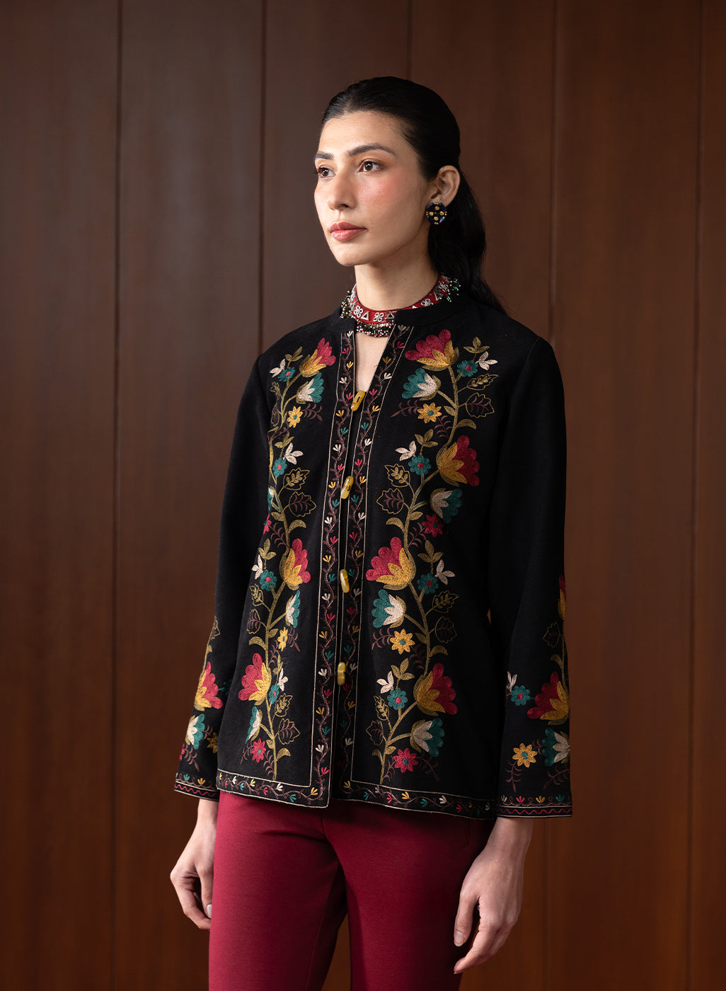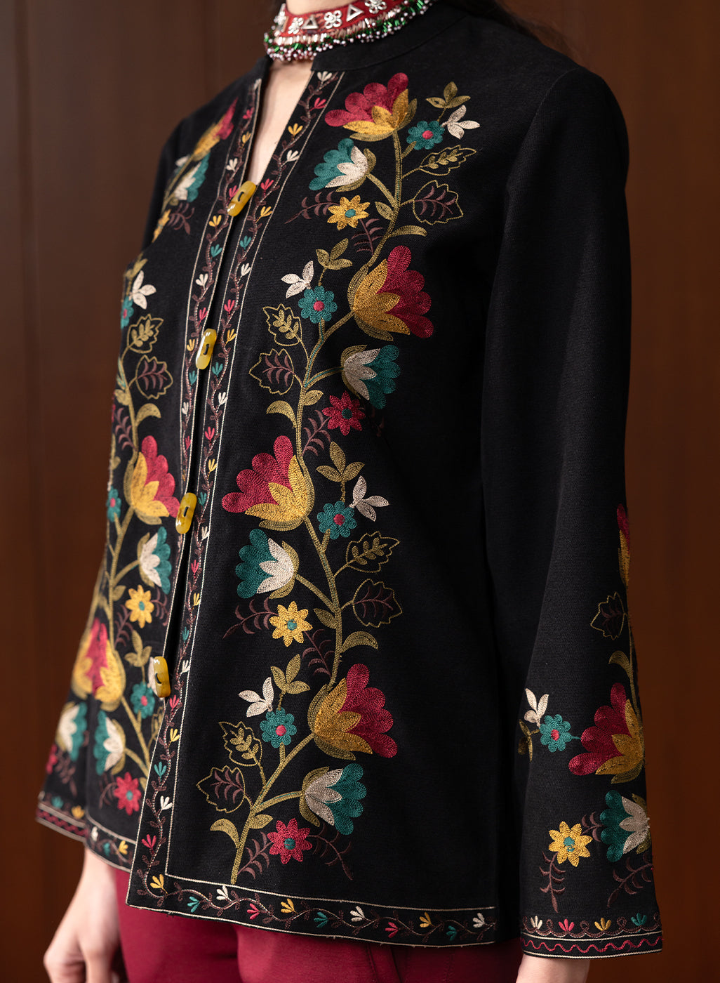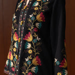 Elegant and versatile, this black embroidered jacket exudes bold sophistication. Inspired by the intricate charm of Kashmiri kadhai, its vibrant resham embroidery brings a burst of colour against the deep black base, making it perfect for elevating both everyday looks and festive evenings. The soft cord fabric keeps you warm and comfortable while ensuring your style stays effortlessly elevated.