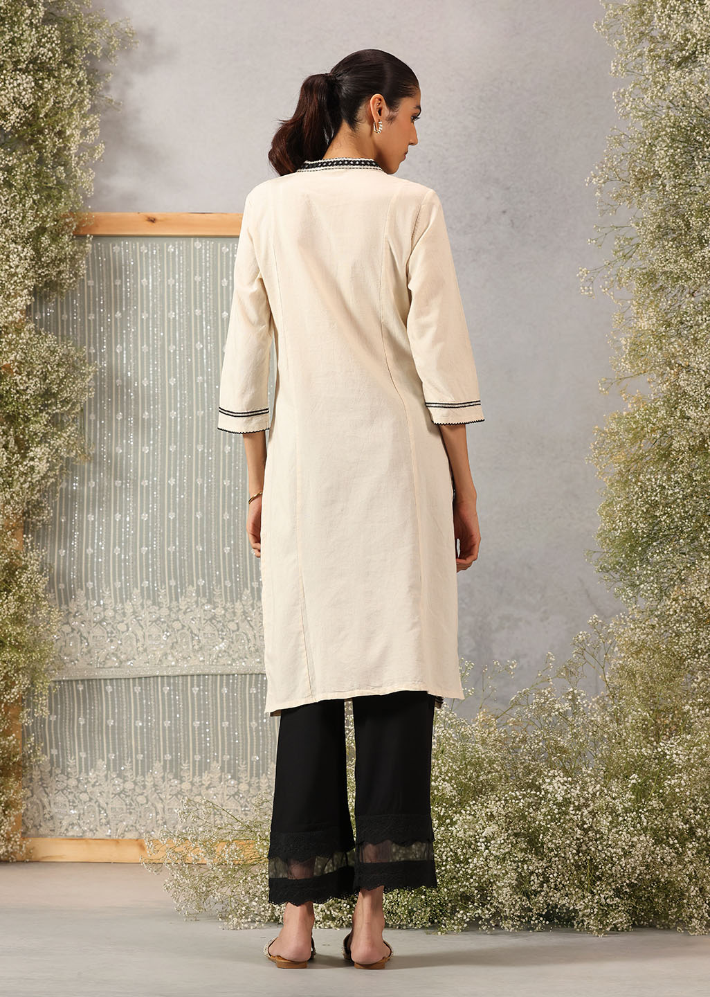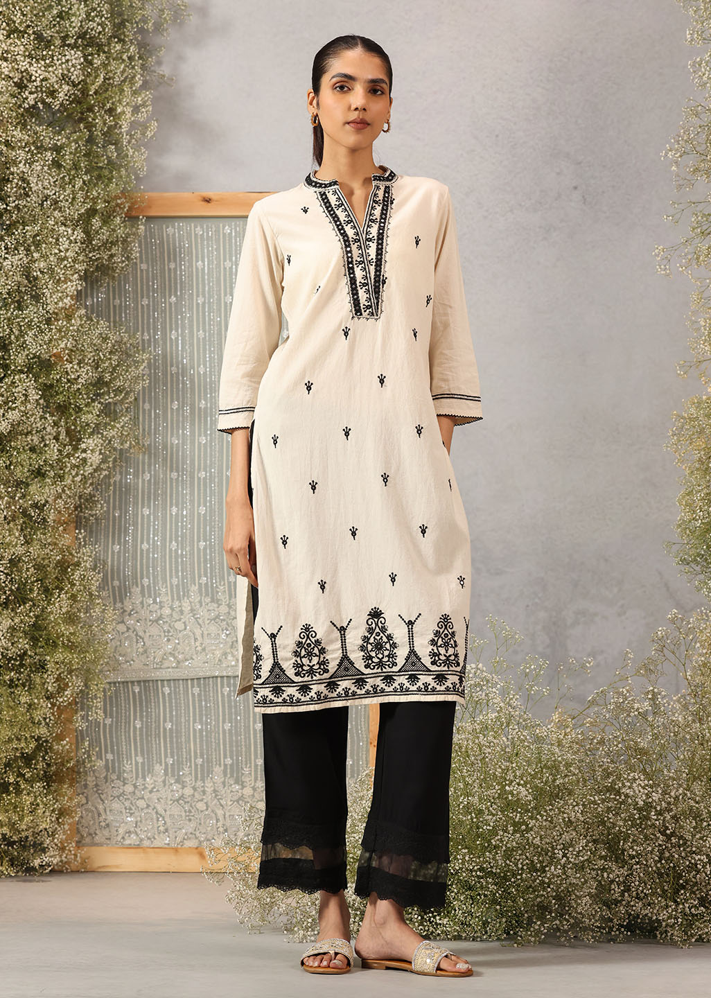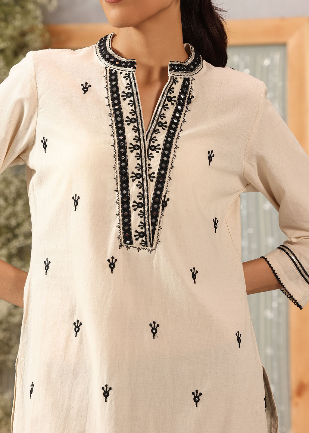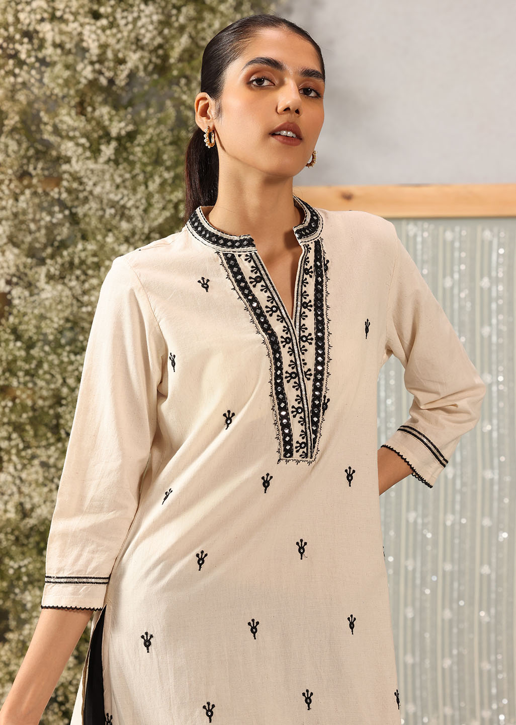 Elevate everyday dressing with this timeless white kurta, enriched by deep black embroidery that brings a quiet sophistication to your wardrobe. The straight silhouette, framed by a neat mandarin collar, features intricate mirror work that glimmers subtly amidst beautiful thread highlight. A versatile piece that balances tradition and ease in equal measure.