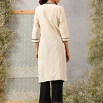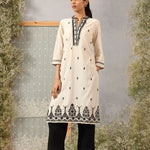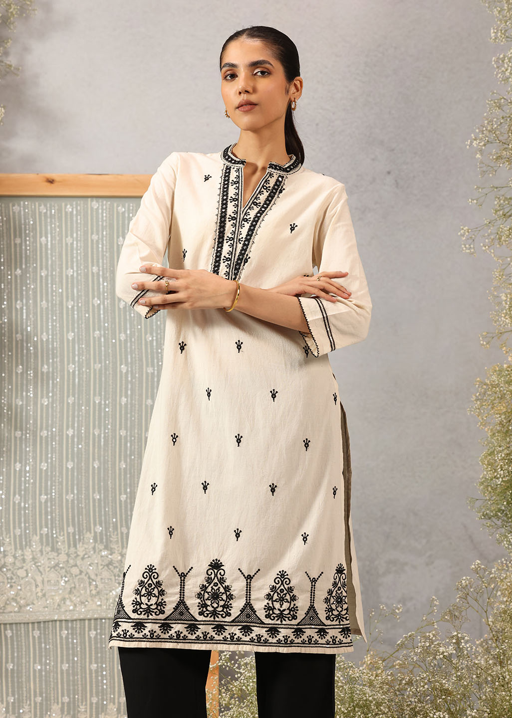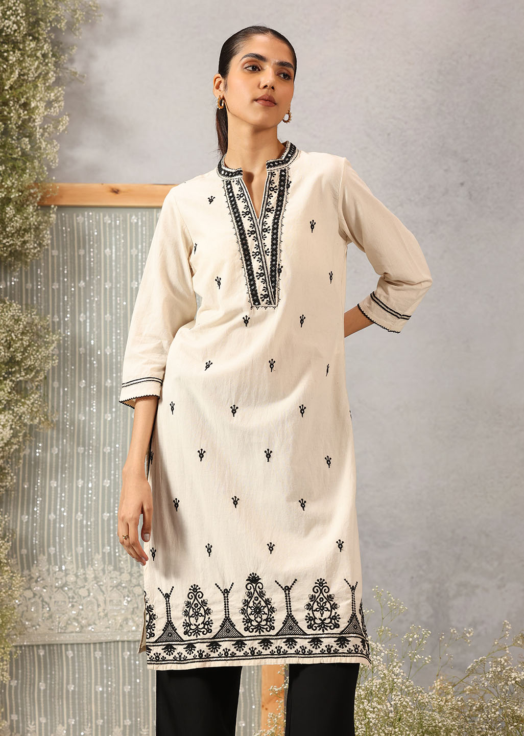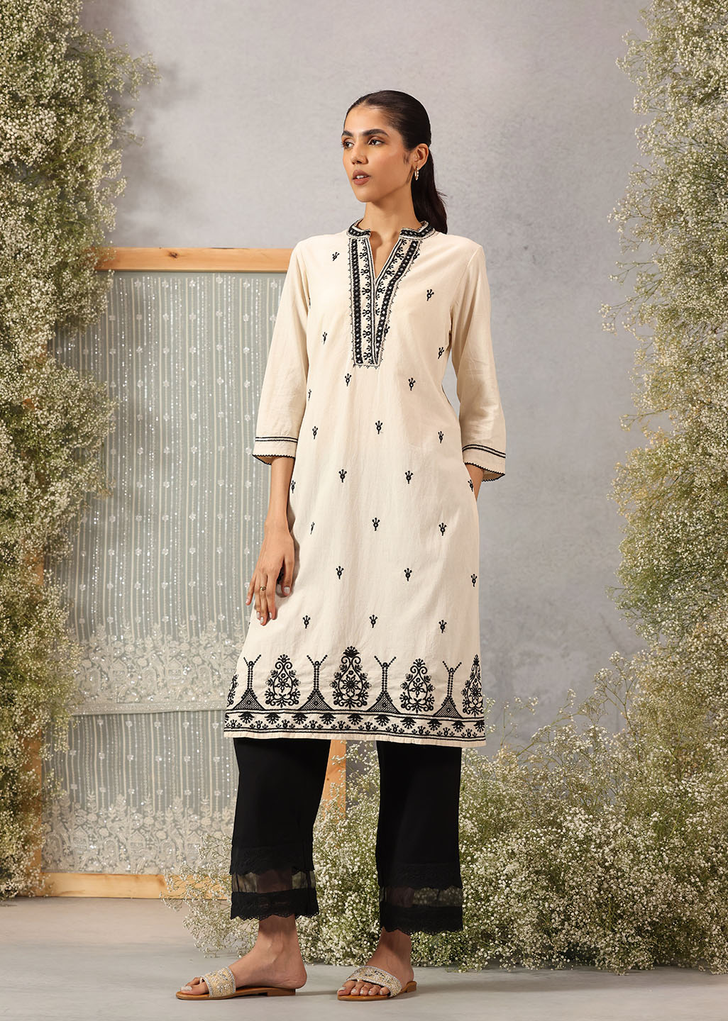 Elevate everyday dressing with this timeless white kurta, enriched by deep black embroidery that brings a quiet sophistication to your wardrobe. The straight silhouette, framed by a neat mandarin collar, features intricate mirror work that glimmers subtly amidst beautiful thread highlight. A versatile piece that balances tradition and ease in equal measure.