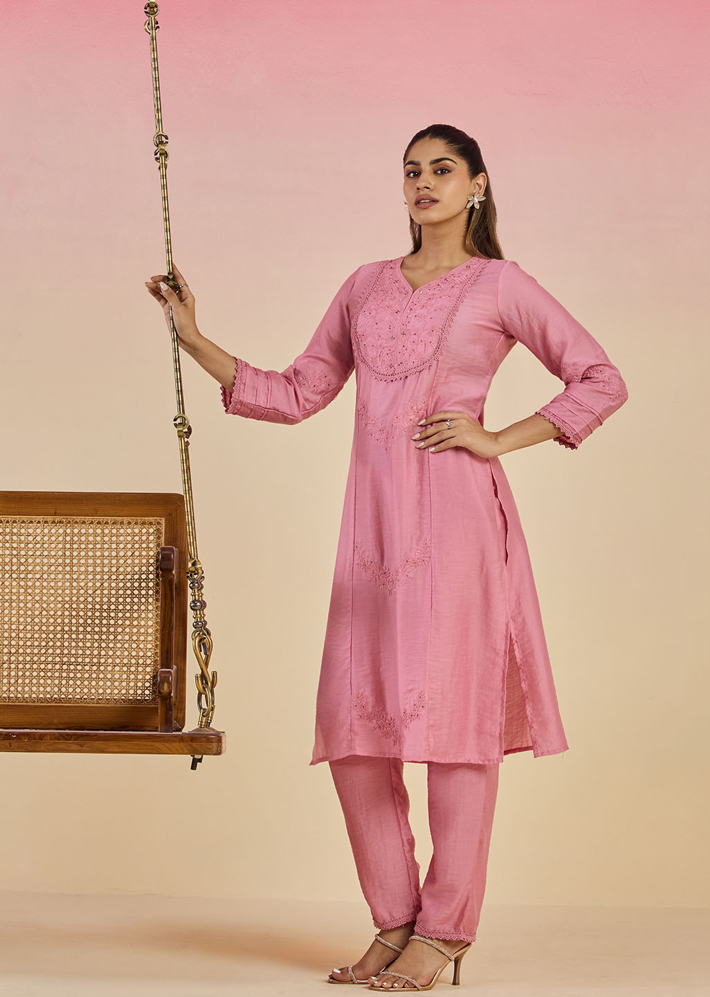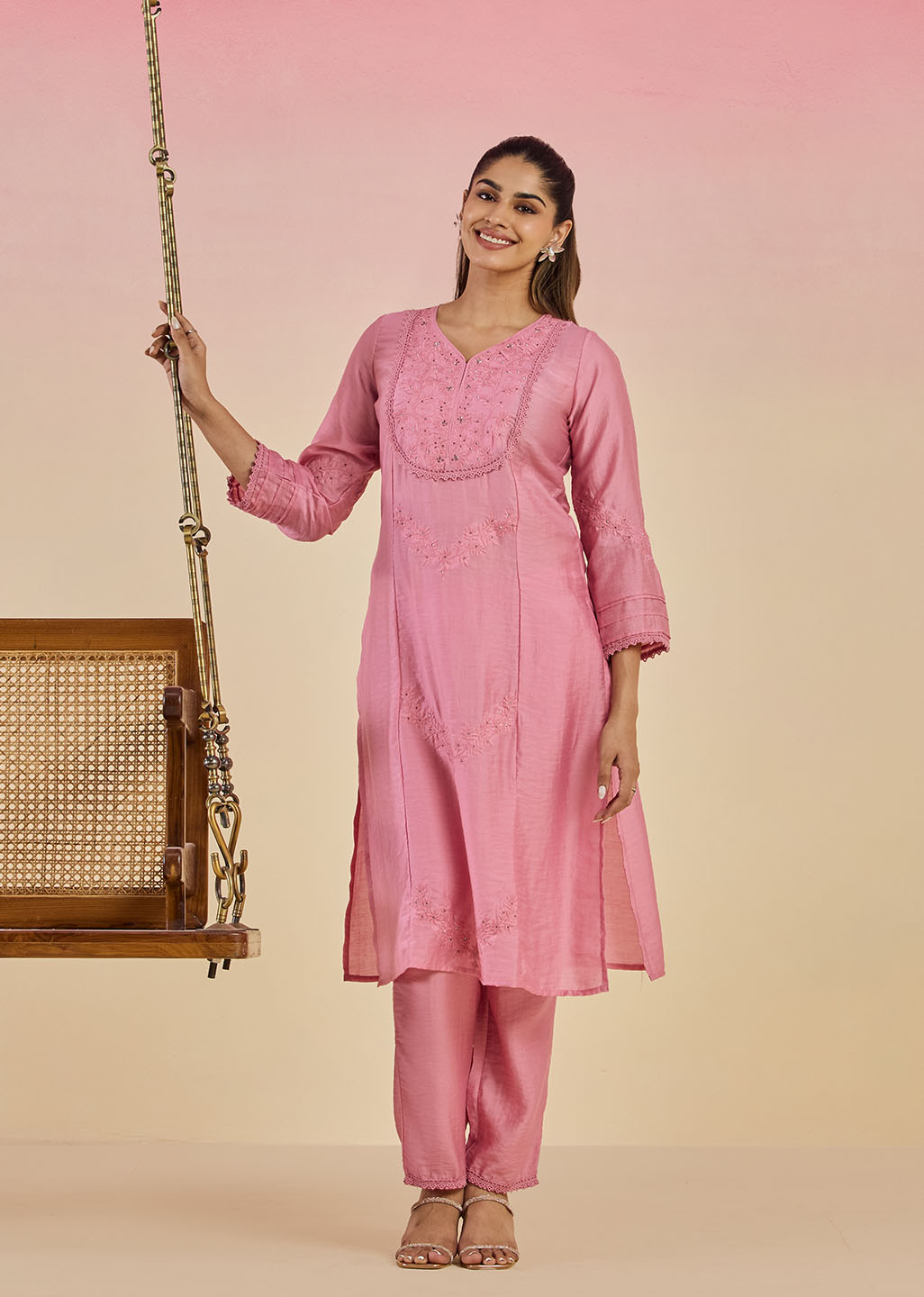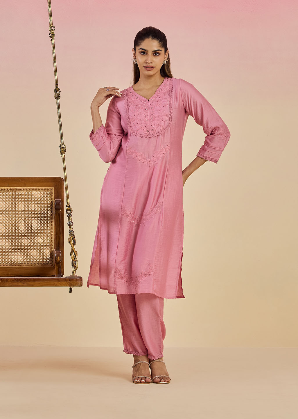 A celebration of understated grandeur, this soft pink kurta set is crafted in a luminous viscose satin that moves like a dream. Intricately adorned with tonal threadwork and rhinestone sparkle, the embroidery gently blooms across the front, sleeves, and back. The kurta features detaled accents like scalloped lace around the yoke and pleated cuffs. Paired with straight pants this is a silhouette designed for comfort and worn best when tradition meets ease.
