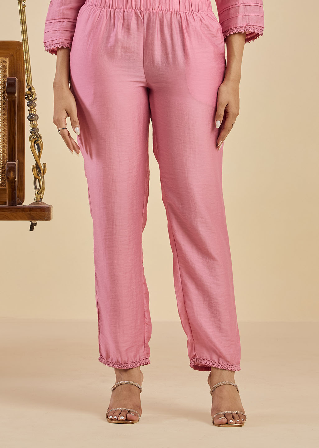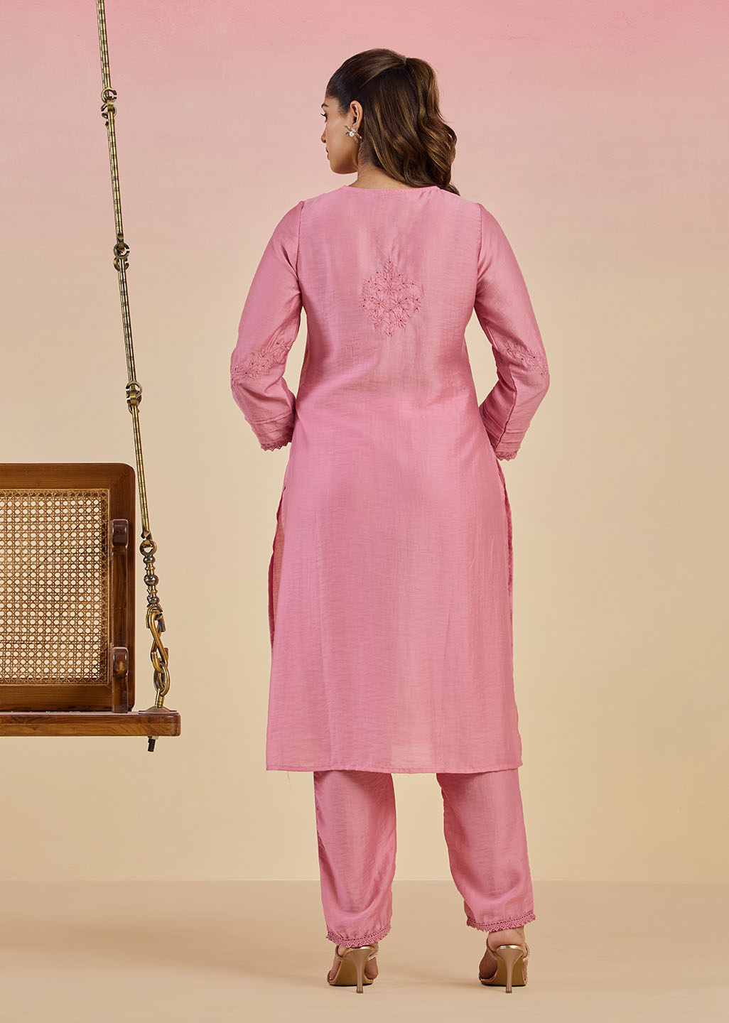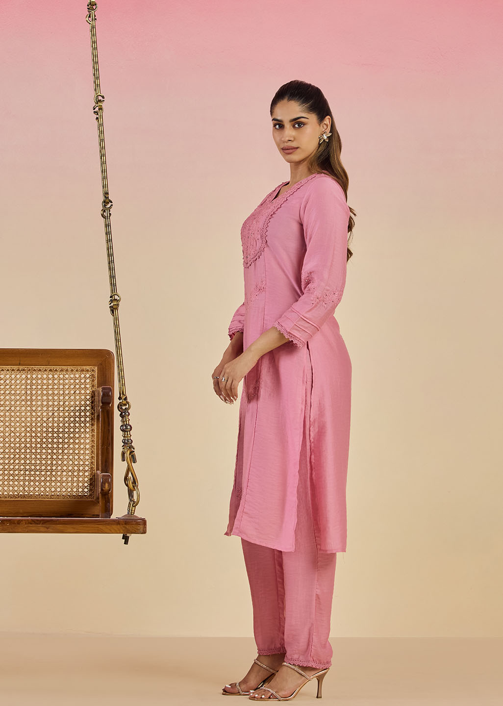A celebration of understated grandeur, this soft pink kurta set is crafted in a luminous viscose satin that moves like a dream. Intricately adorned with tonal threadwork and rhinestone sparkle, the embroidery gently blooms across the front, sleeves, and back. The kurta features detaled accents like scalloped lace around the yoke and pleated cuffs. Paired with straight pants this is a silhouette designed for comfort and worn best when tradition meets ease.
