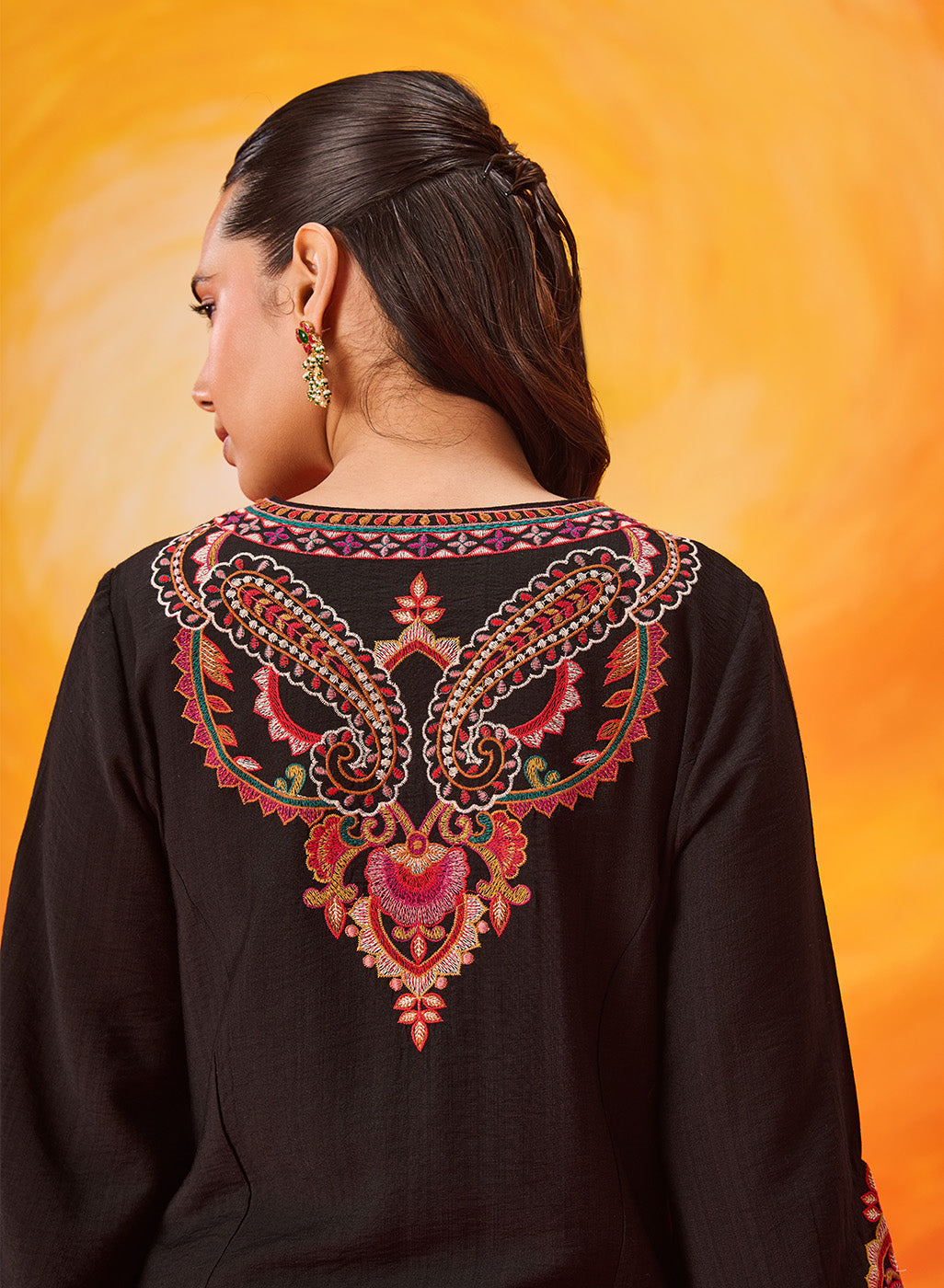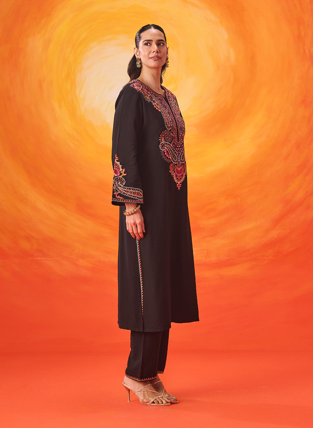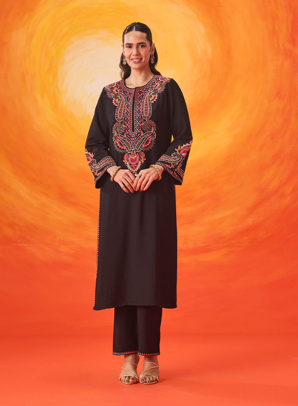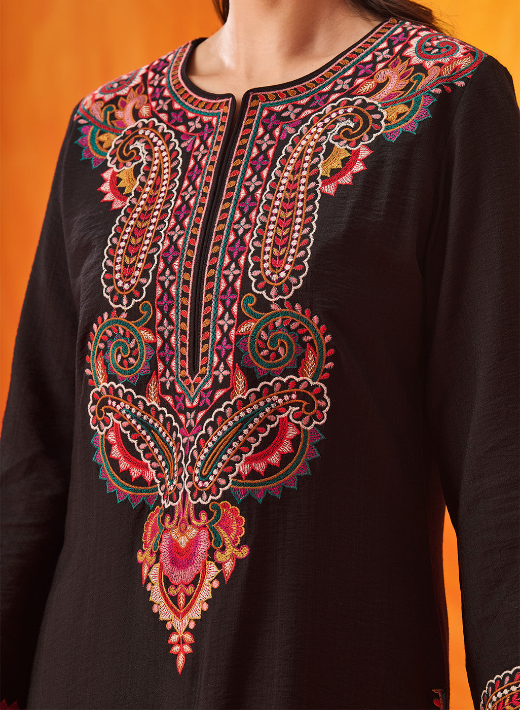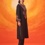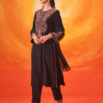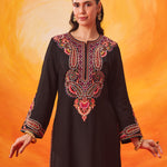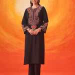 Set against a deep black base, the multicolour Kashmiri-inspired embroidery stands out beautifully, adding depth and richness to this timeless silhouette. The clean lines of the kurta are softened with the detailed threadwork, making it an elegant choice for both day and evening occasions.