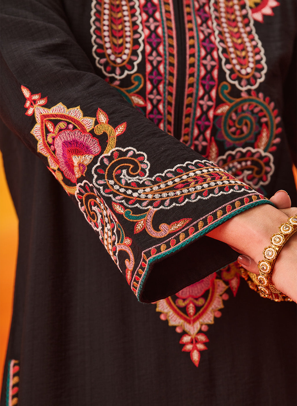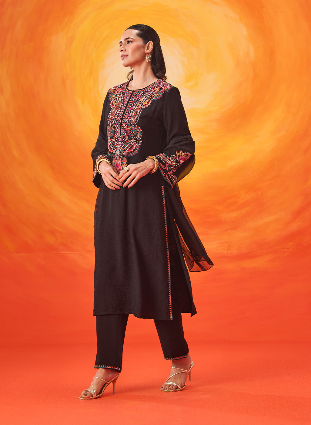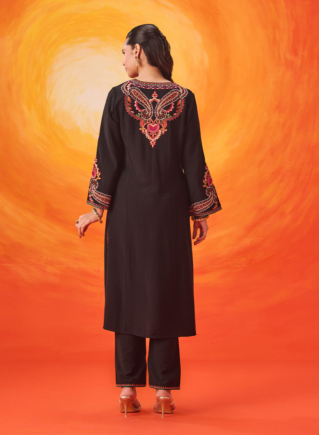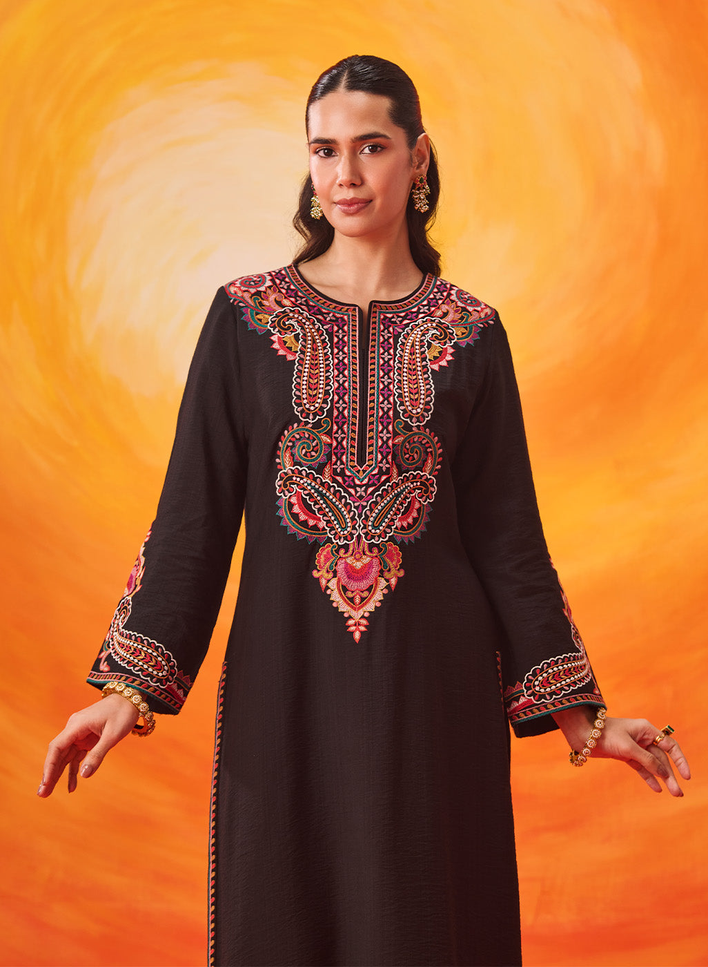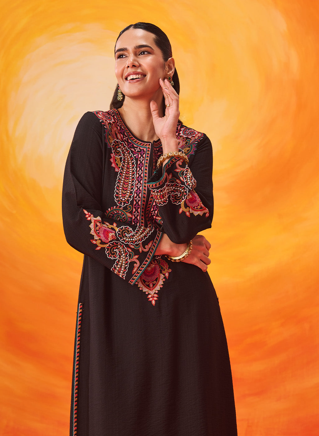 Set against a deep black base, the multicolour Kashmiri-inspired embroidery stands out beautifully, adding depth and richness to this timeless silhouette. The clean lines of the kurta are softened with the detailed threadwork, making it an elegant choice for both day and evening occasions.