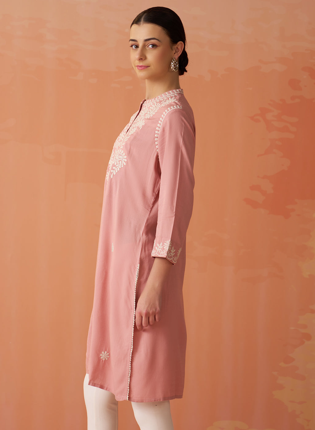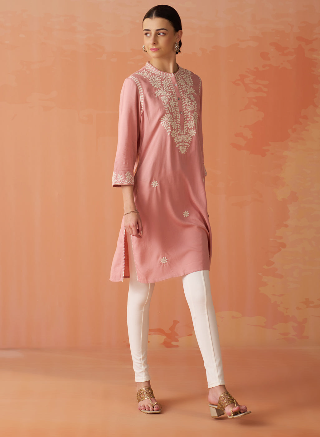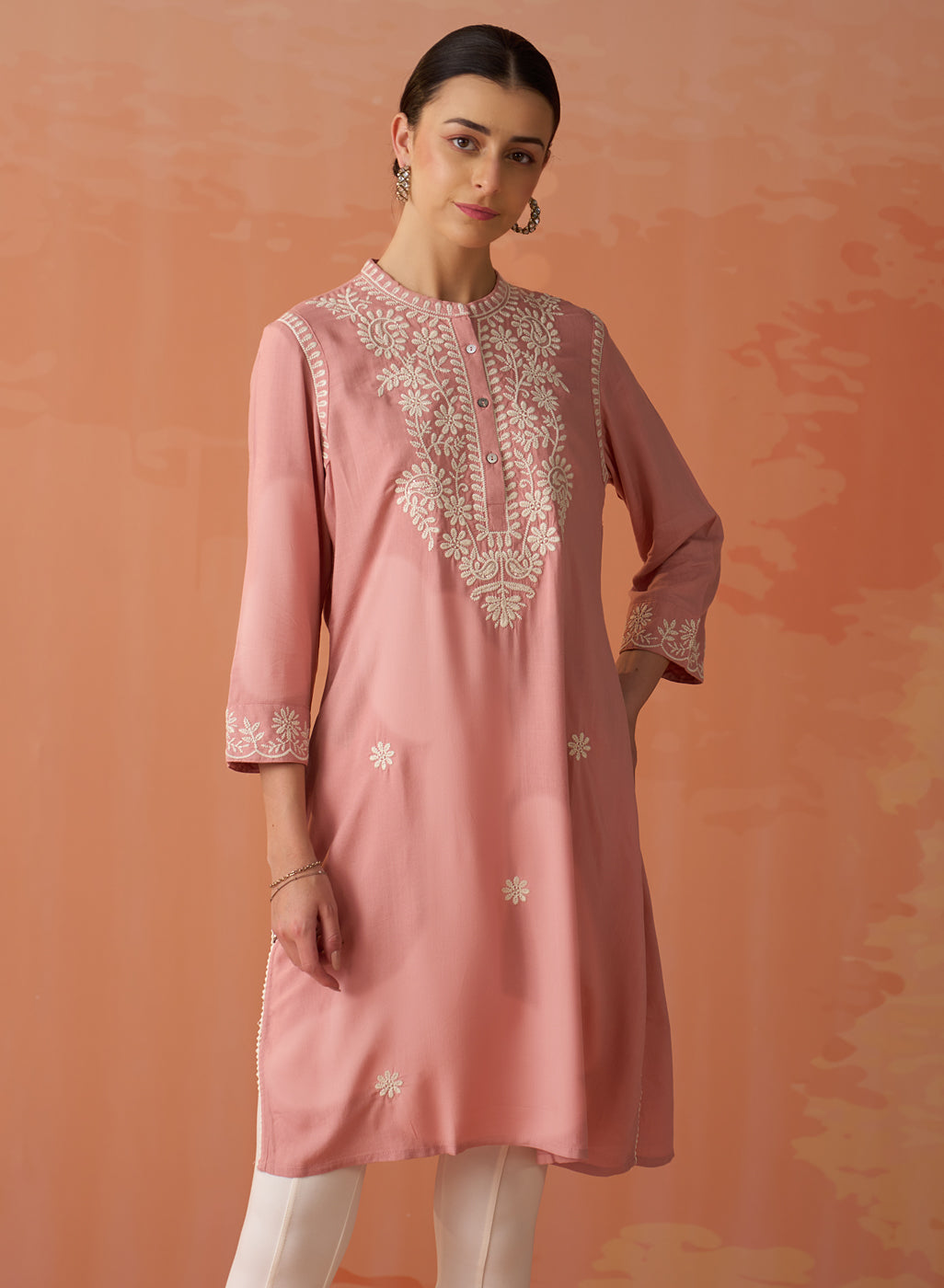 • The graceful mandarin collar and elegant 3/4th sleeves effortlessly harmonise with the tunic's straight silhouette, imbuing it with a sense of refined sophistication.