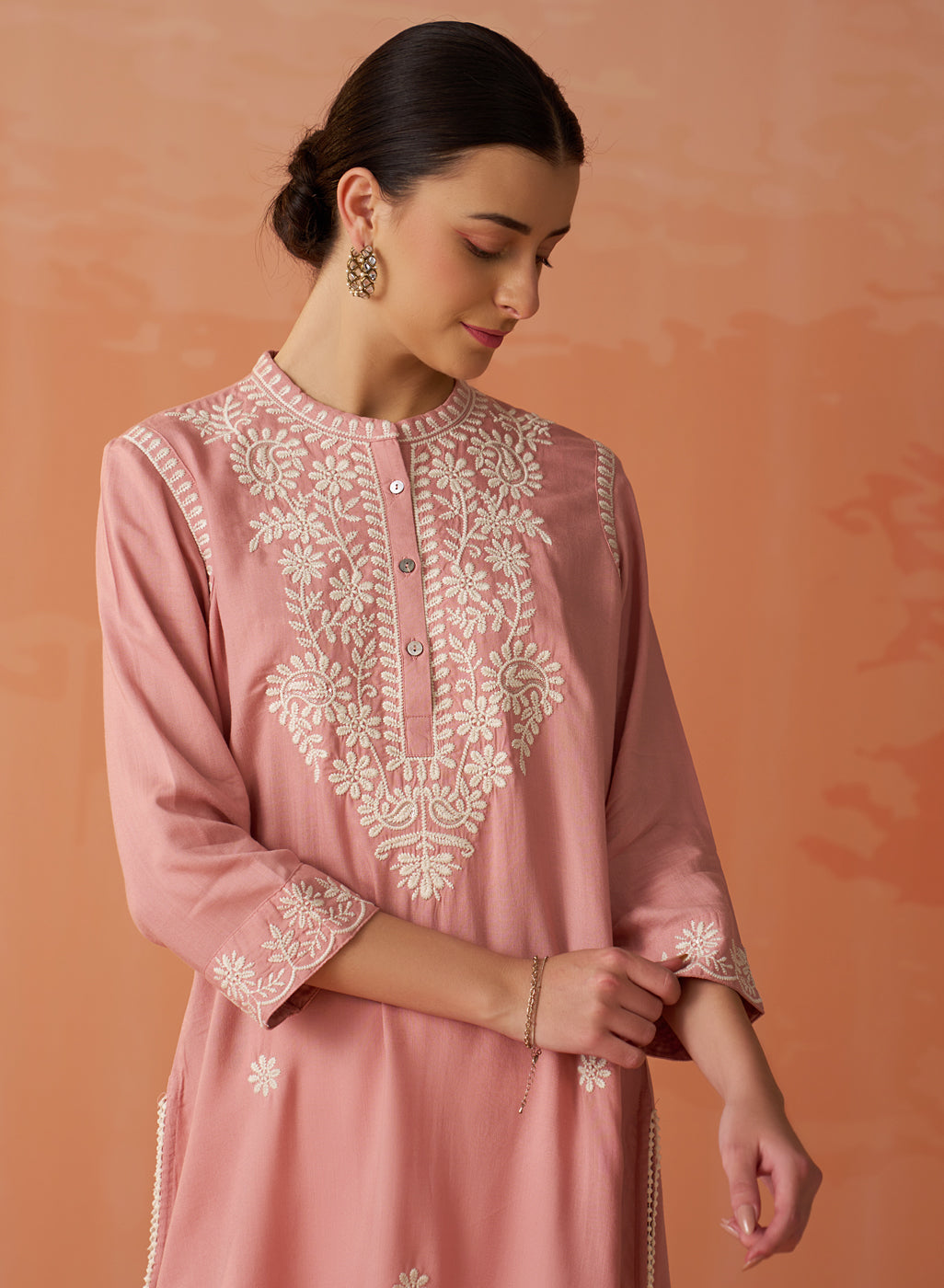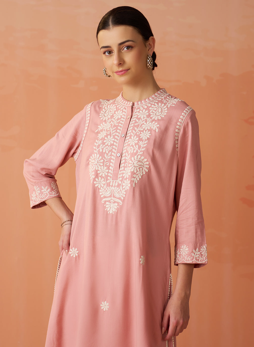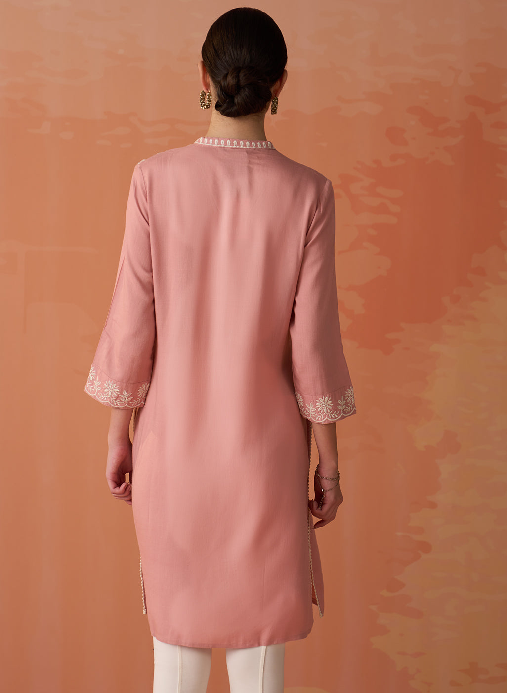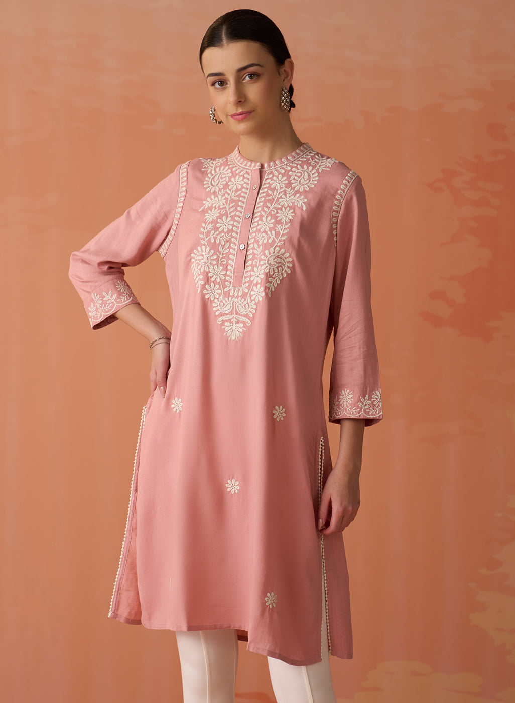 • The graceful mandarin collar and elegant 3/4th sleeves effortlessly harmonise with the tunic's straight silhouette, imbuing it with a sense of refined sophistication.