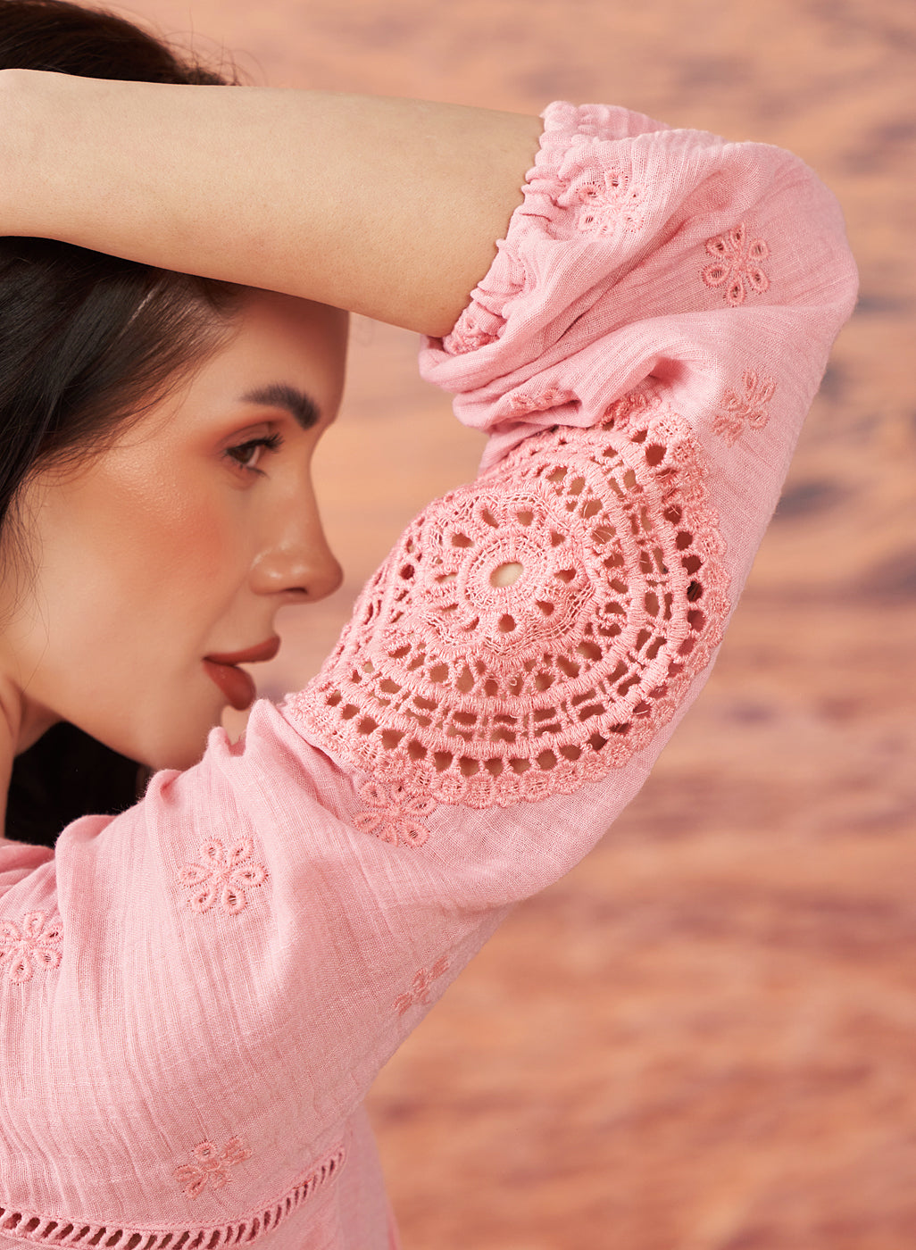 •The kurti’s defining feature is its delicate monochrome embroidery, which showcases Schiffli-inspired thread work with intricate cutwork.