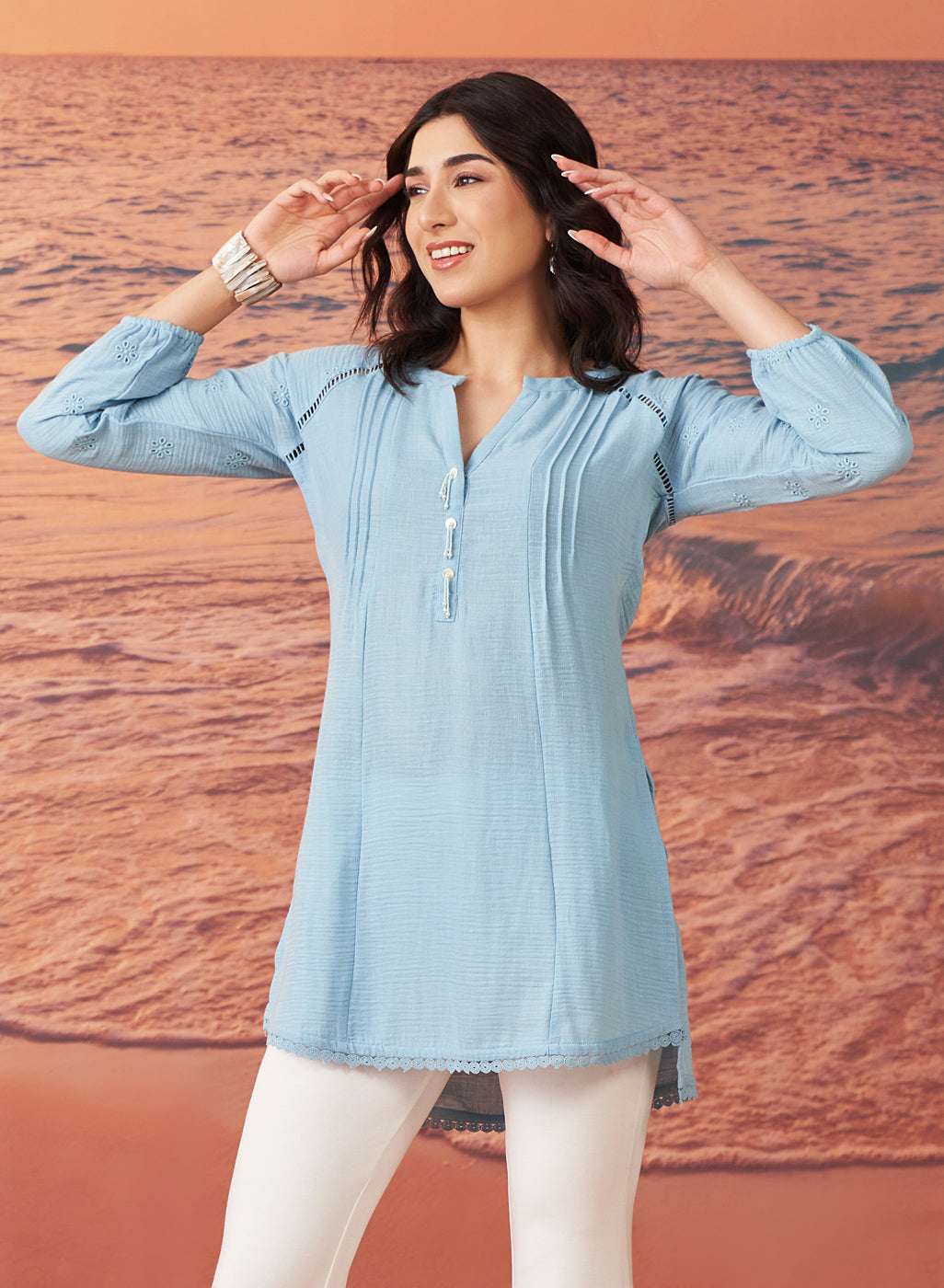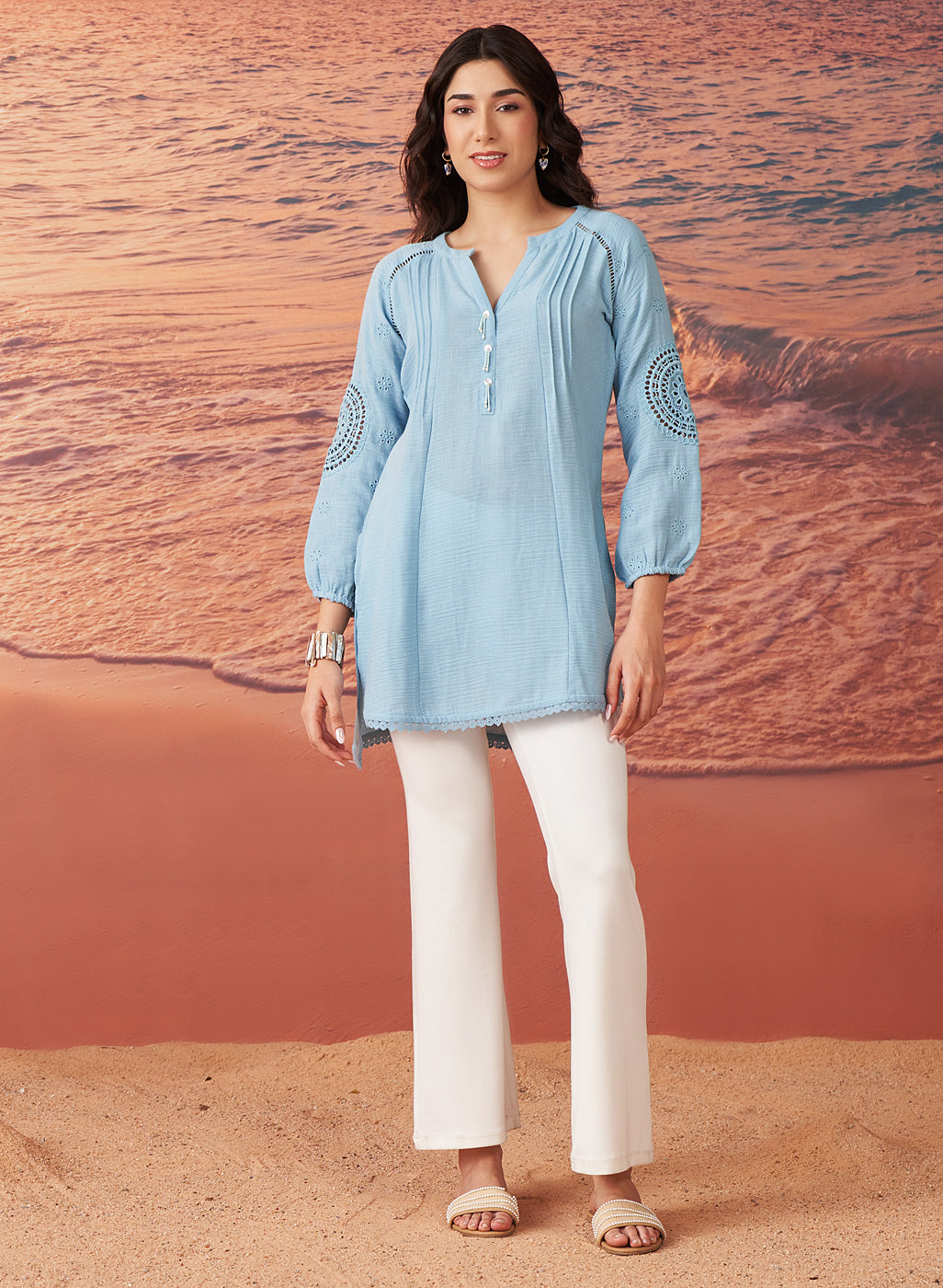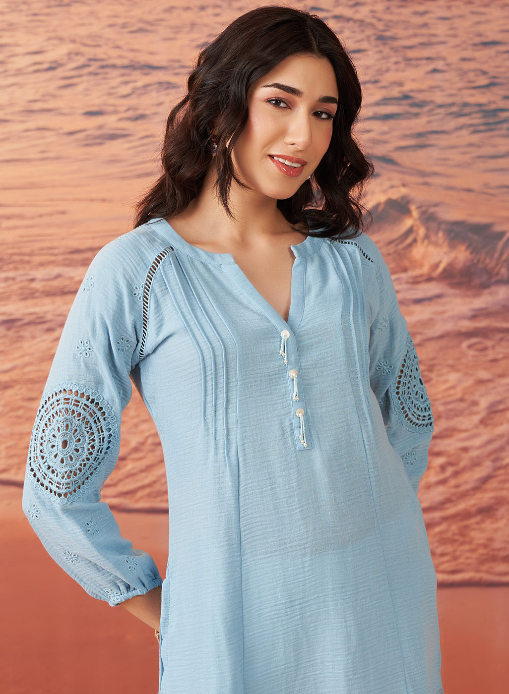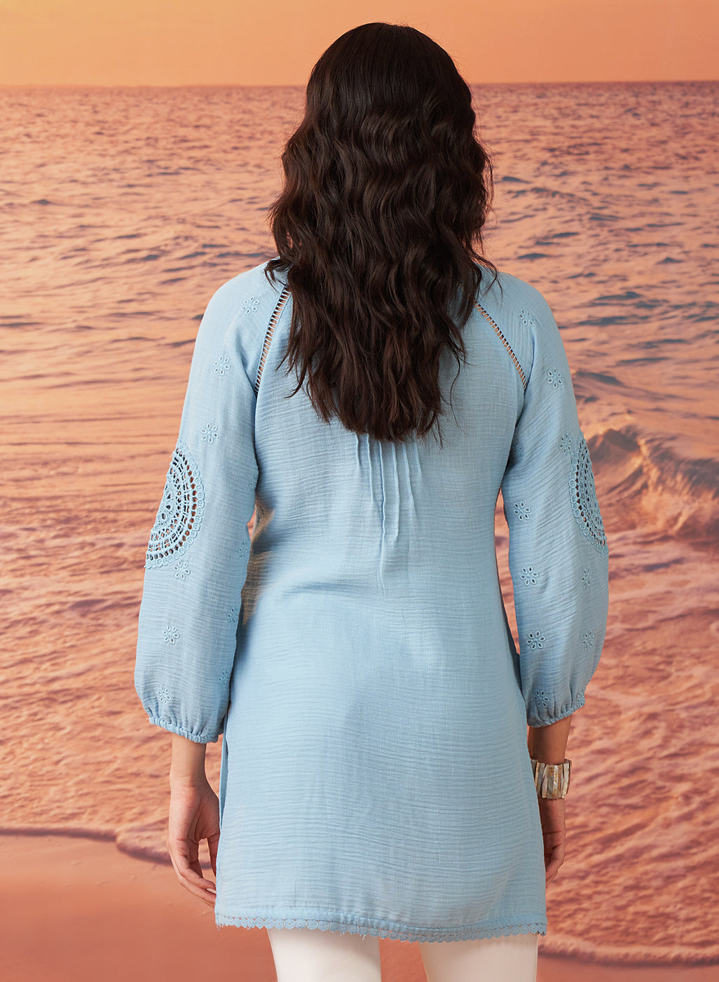 •The kurti’s defining feature is its delicate monochrome embroidery, which showcases Schiffli-inspired thread work with intricate cutwork.