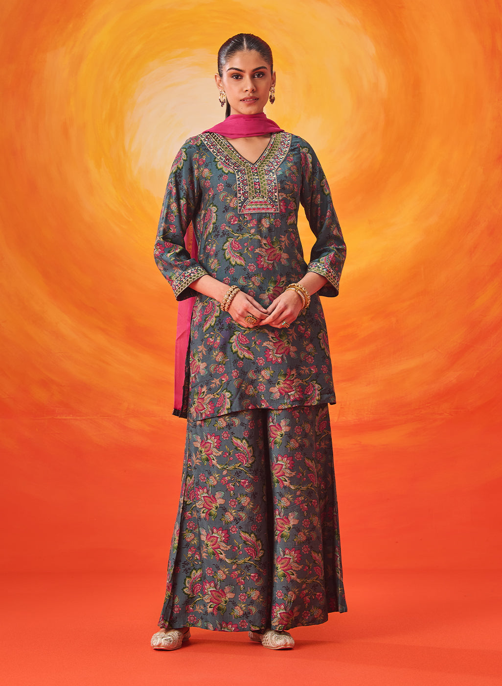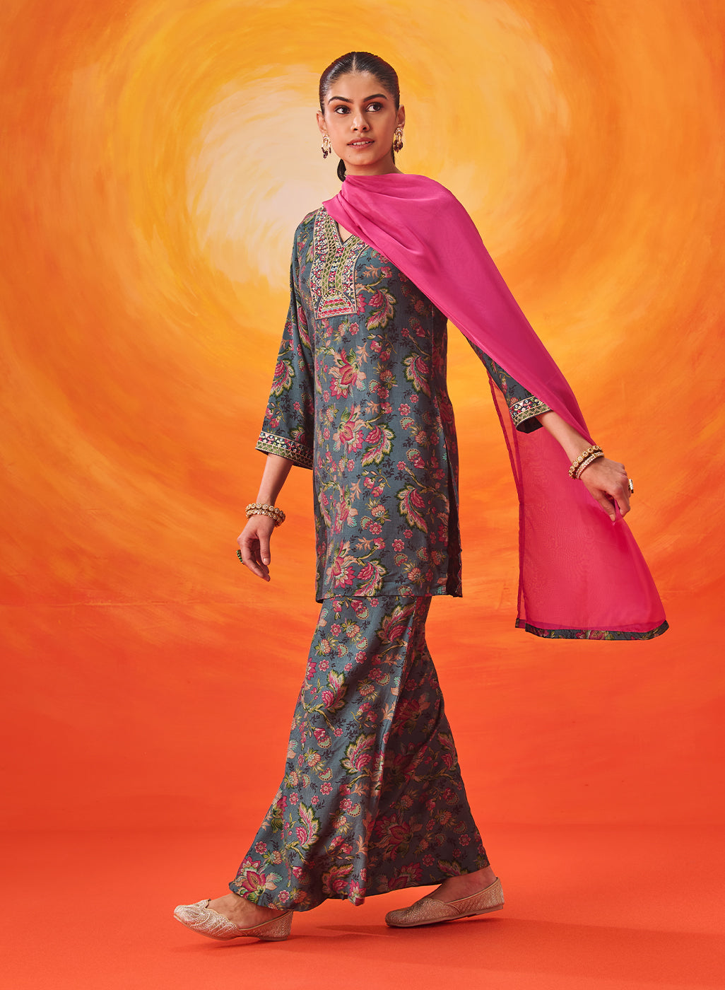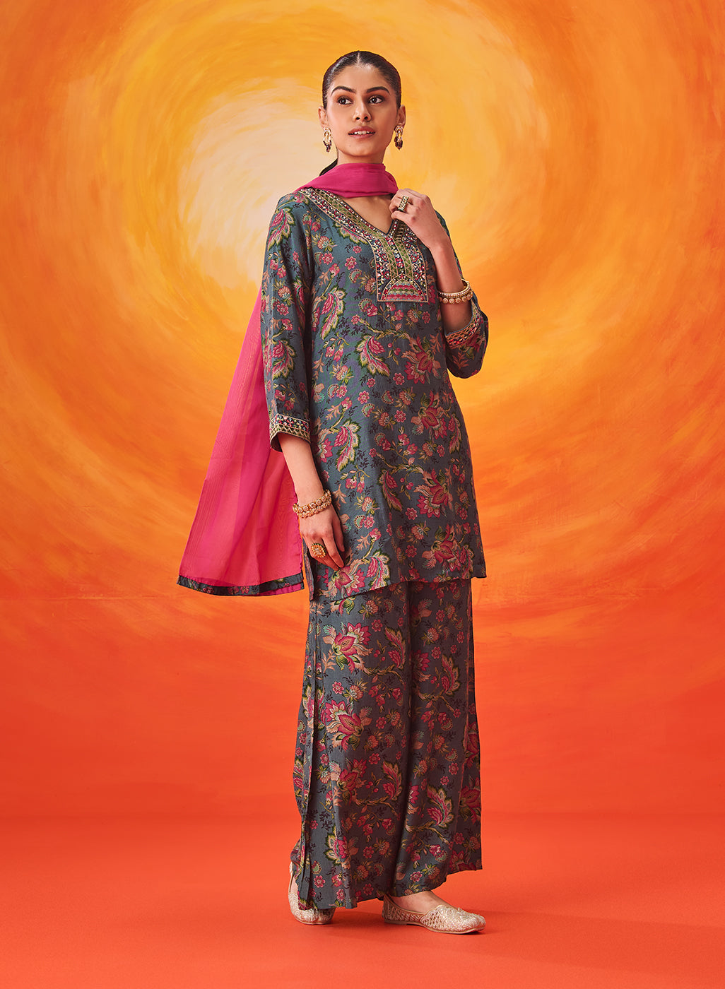 Saanjh Grey Floral Printed Suit Set with Dupatta