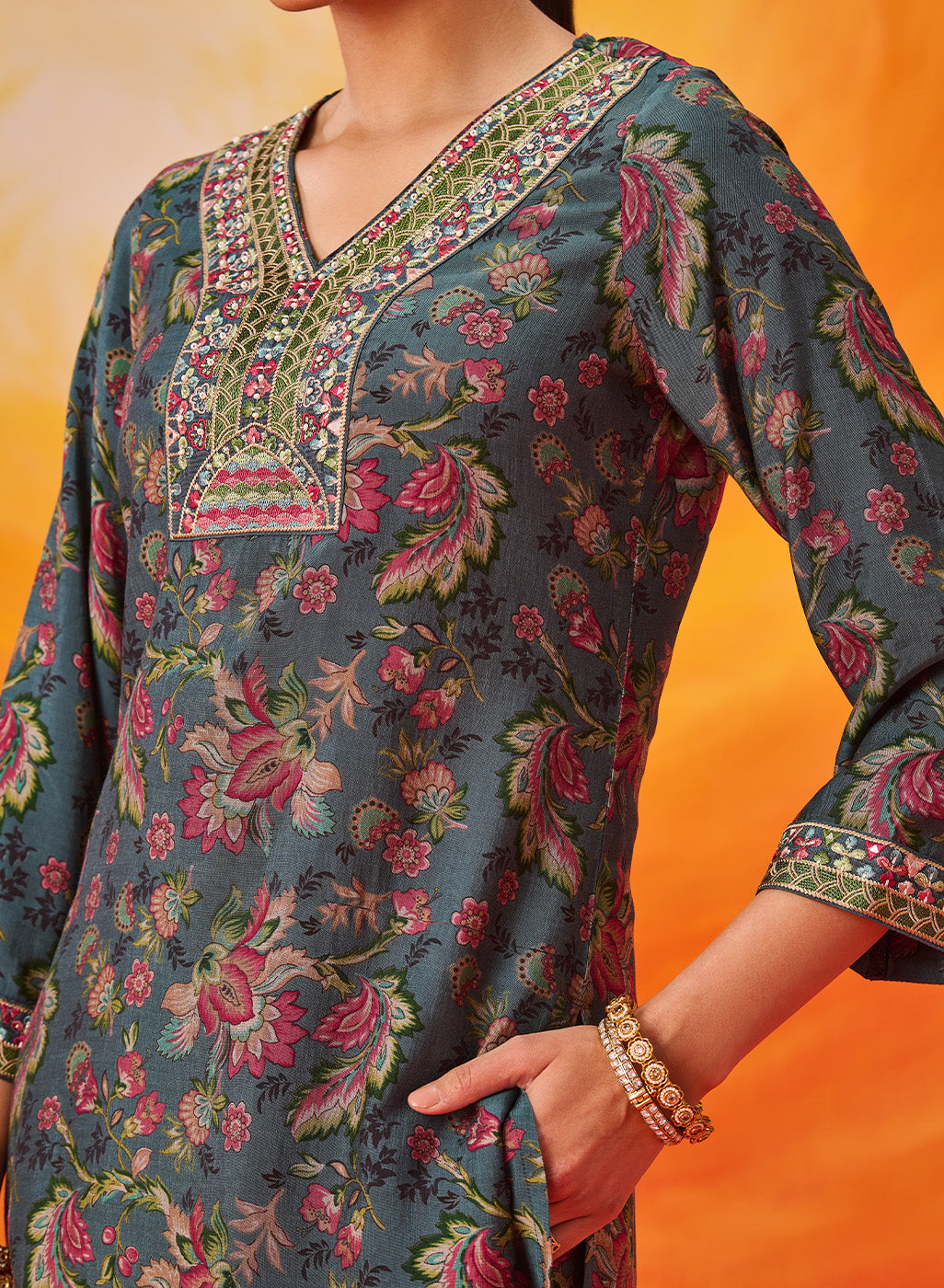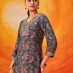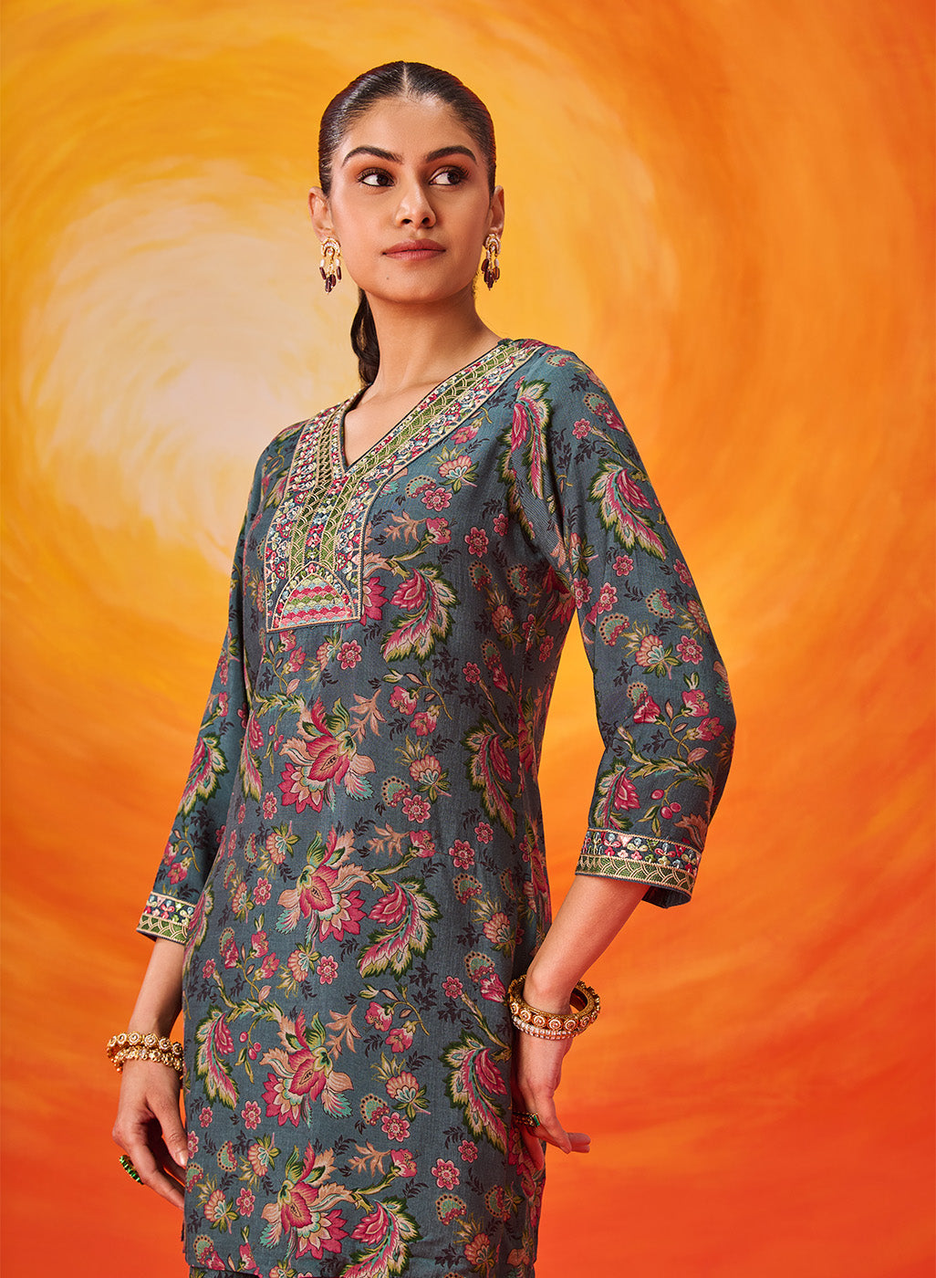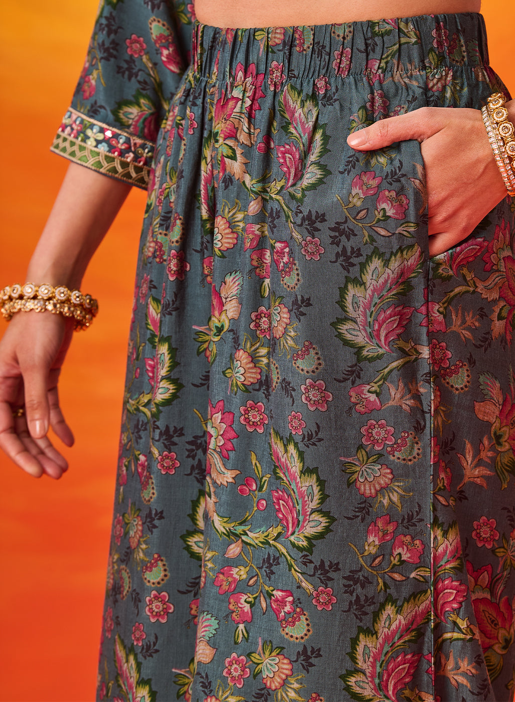 Saanjh Grey Floral Printed Suit Set with Dupatta