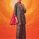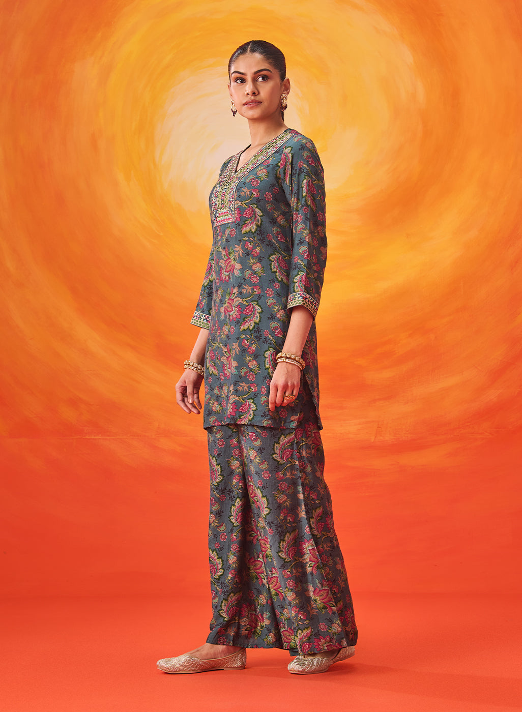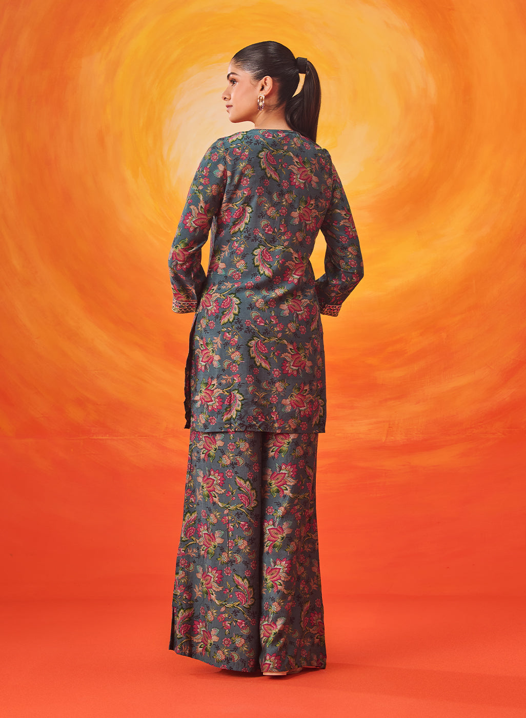 • Straight kurta paired with coordinating all-over printed palazzo pants.