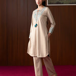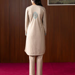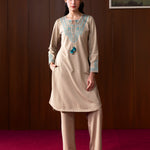 A warm beige kurta set that blends subtlety with craft. The teal-toned resham embroidery and sequins bring a quiet vibrance, making this piece feel earthy, refined, and beautifully detailed. Perfect for days when you want effortless winter elegance.