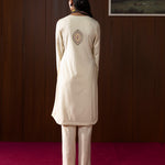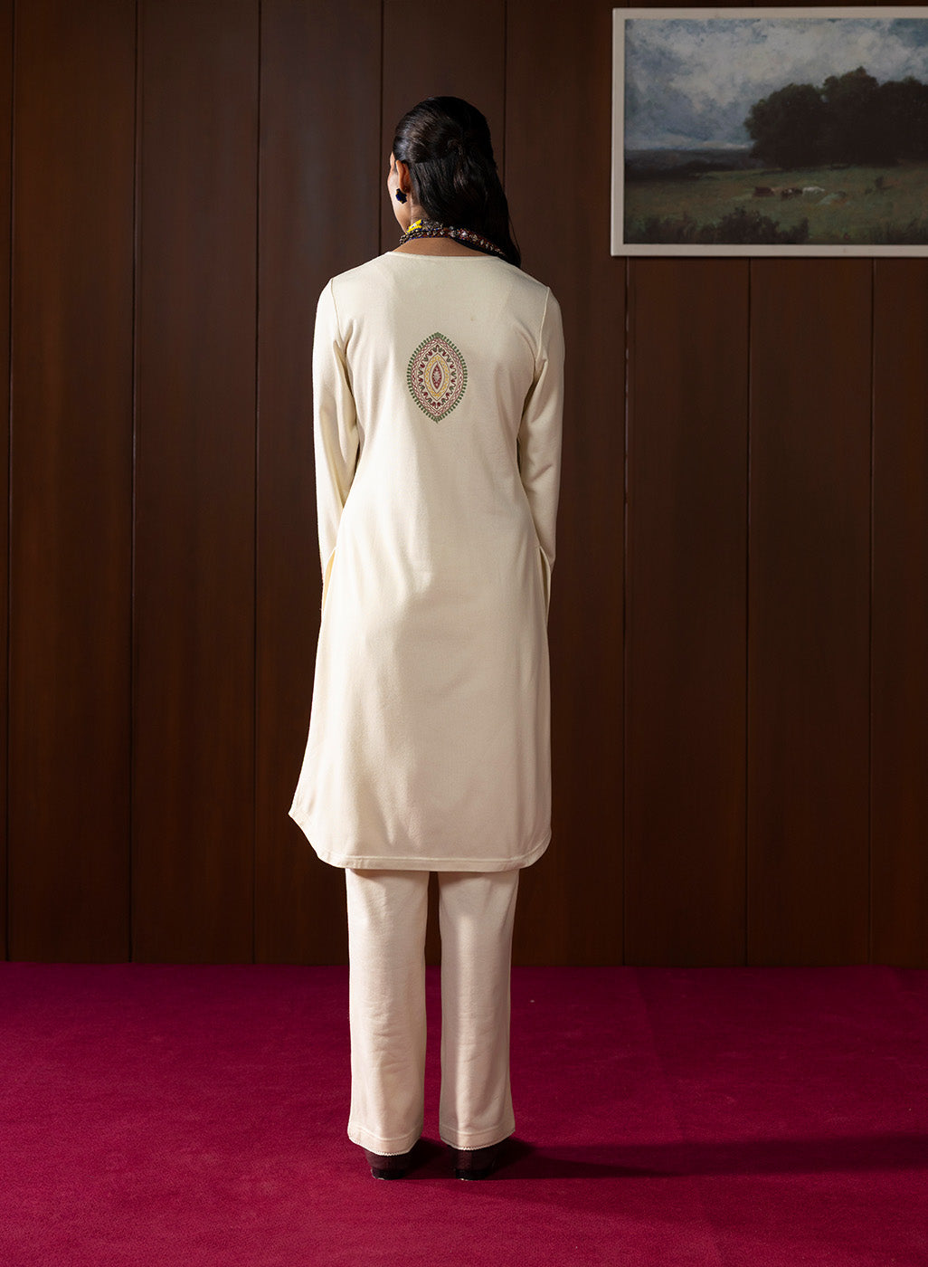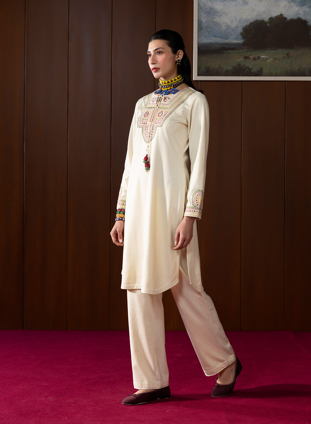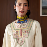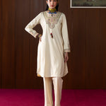 An elegant ivory kurta set that feels soft, serene, and timeless. The multicoloured resham work adds just the right amount of festive charm, while the subtle sequins give it a gentle winter glow.