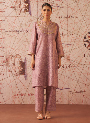 This Sama co-ord set brings a fresh feel, made from soft cotton jacquard that’s breathable and light. The all-over print adds a vibrant touch to the piece. The dori embroidery with sequin highlights give a handcrafted charm.