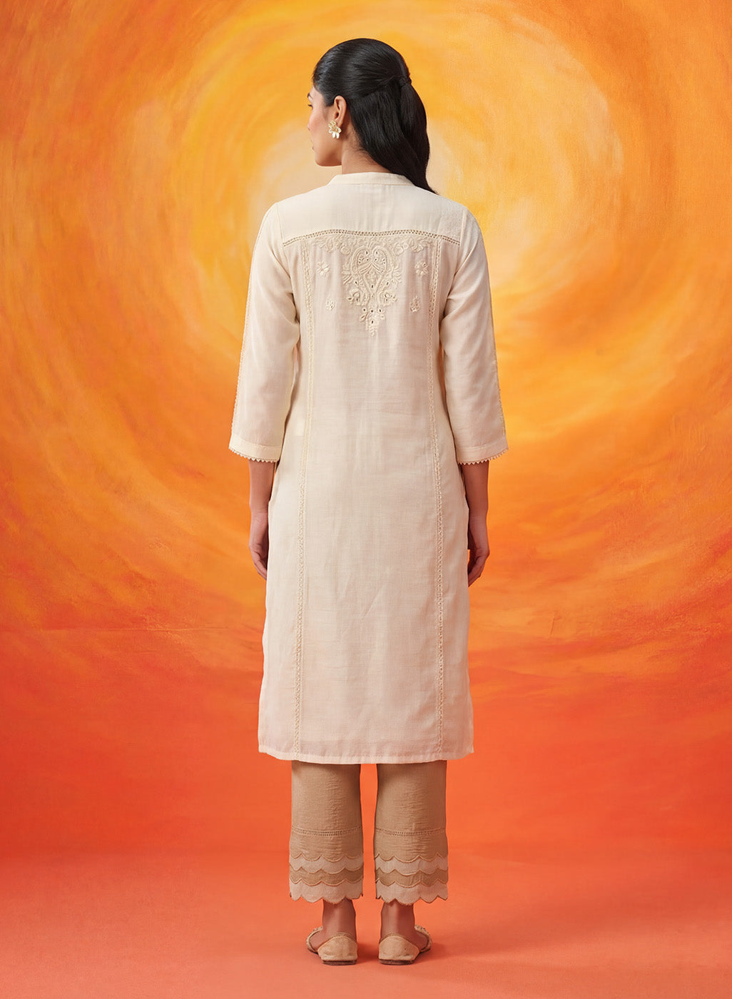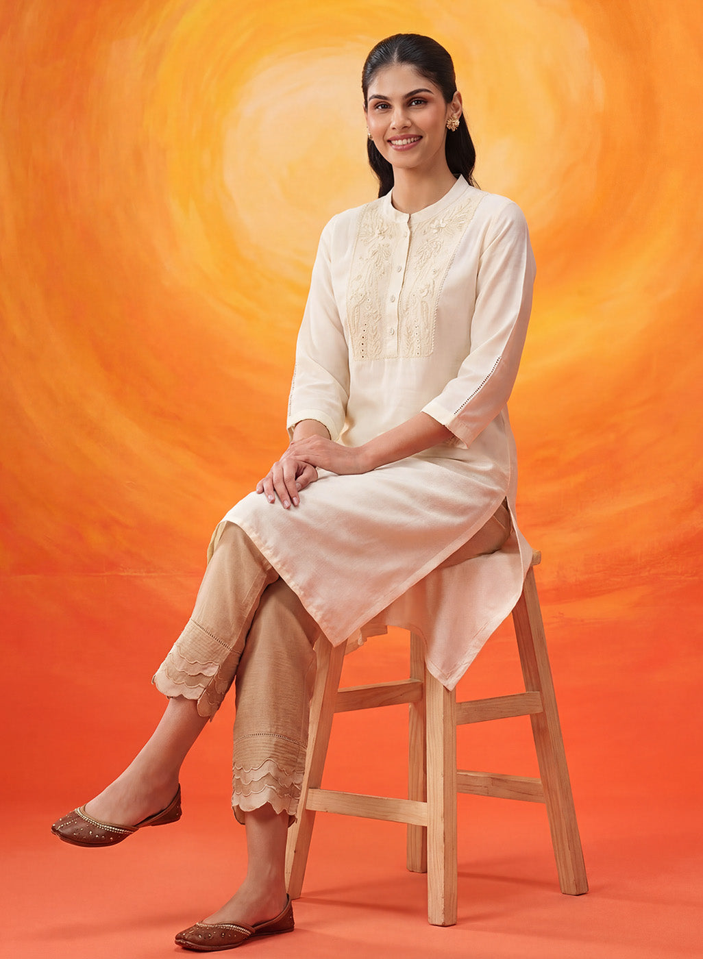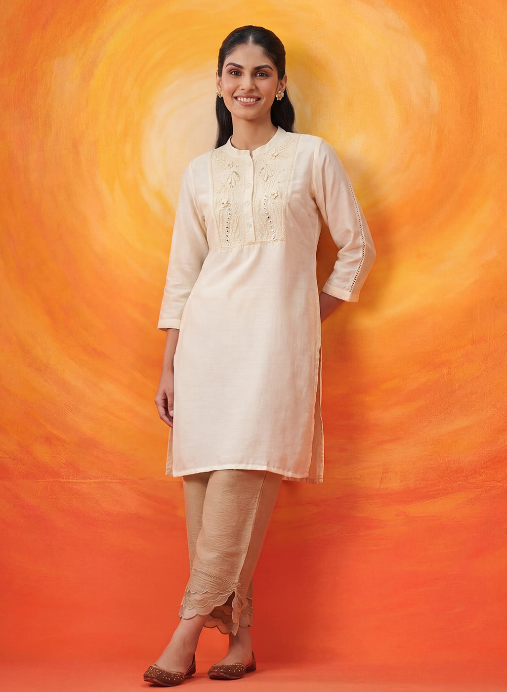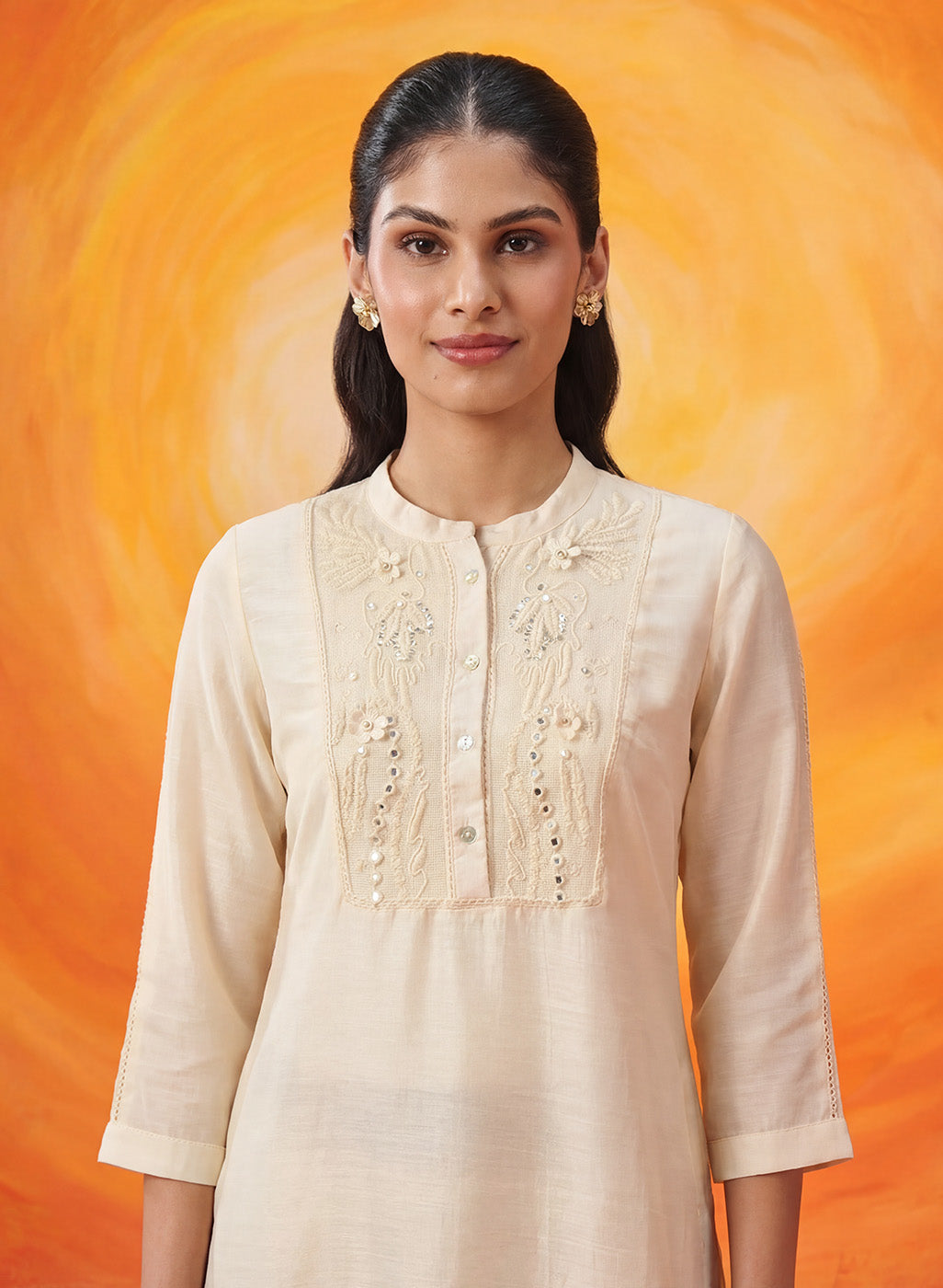 Understated, elegant, and beautiful, this ivory kurti celebrates the charm of simplicity. Crafted in soft silk, it lets delicate detailing take centre stage, where fine dori embroidery, subtle sequins, and 3D floral accents come together in a look that feels refined yet effortless.