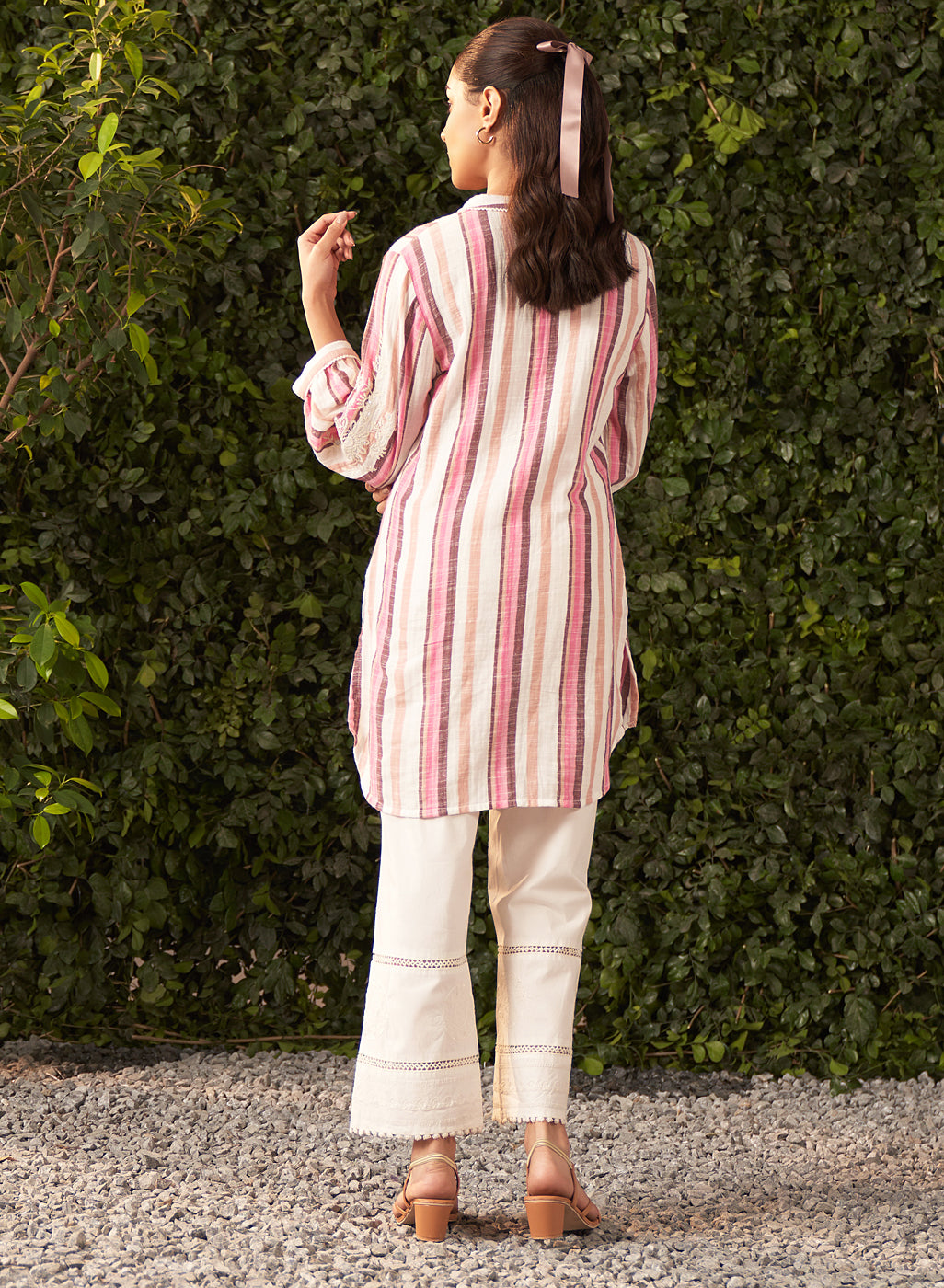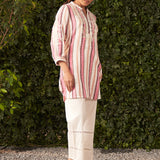 •The all-over stripe print is enhanced by intricate thread embroidery with zari highlights, adding a touch of shimmer to its classic design.