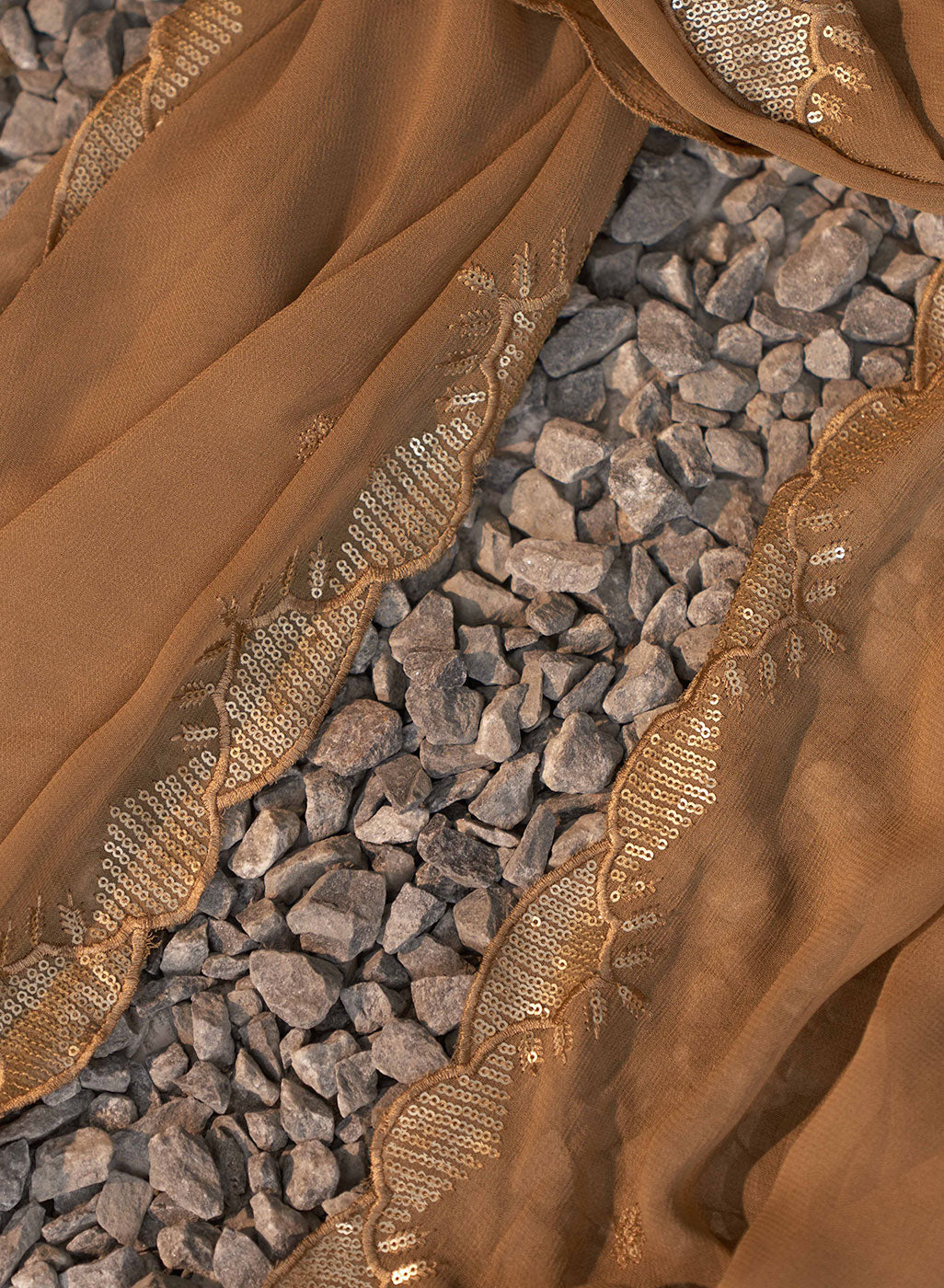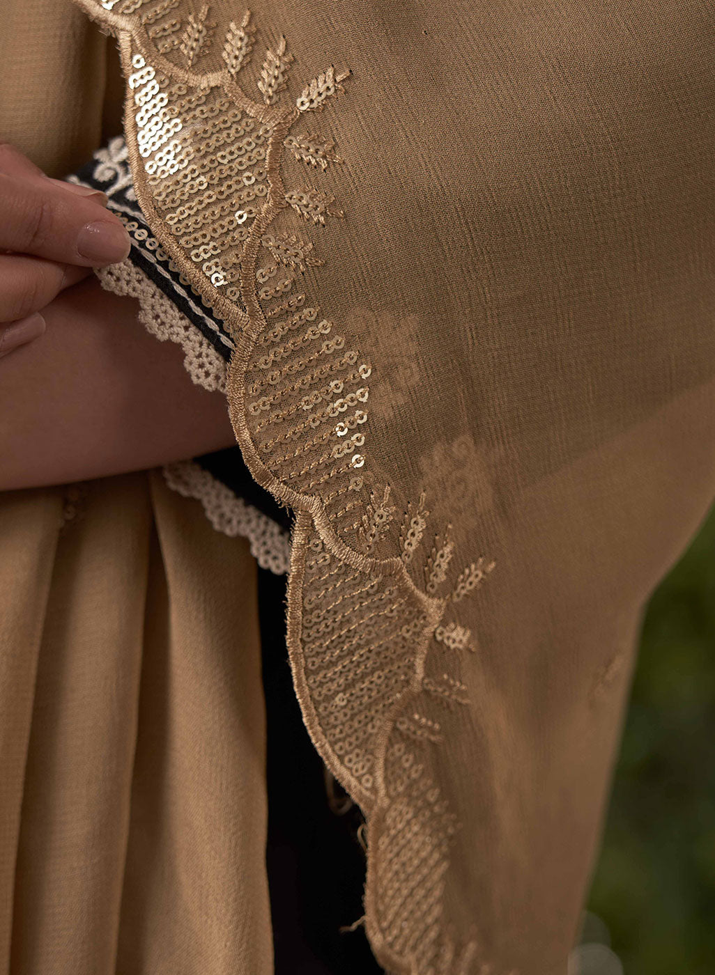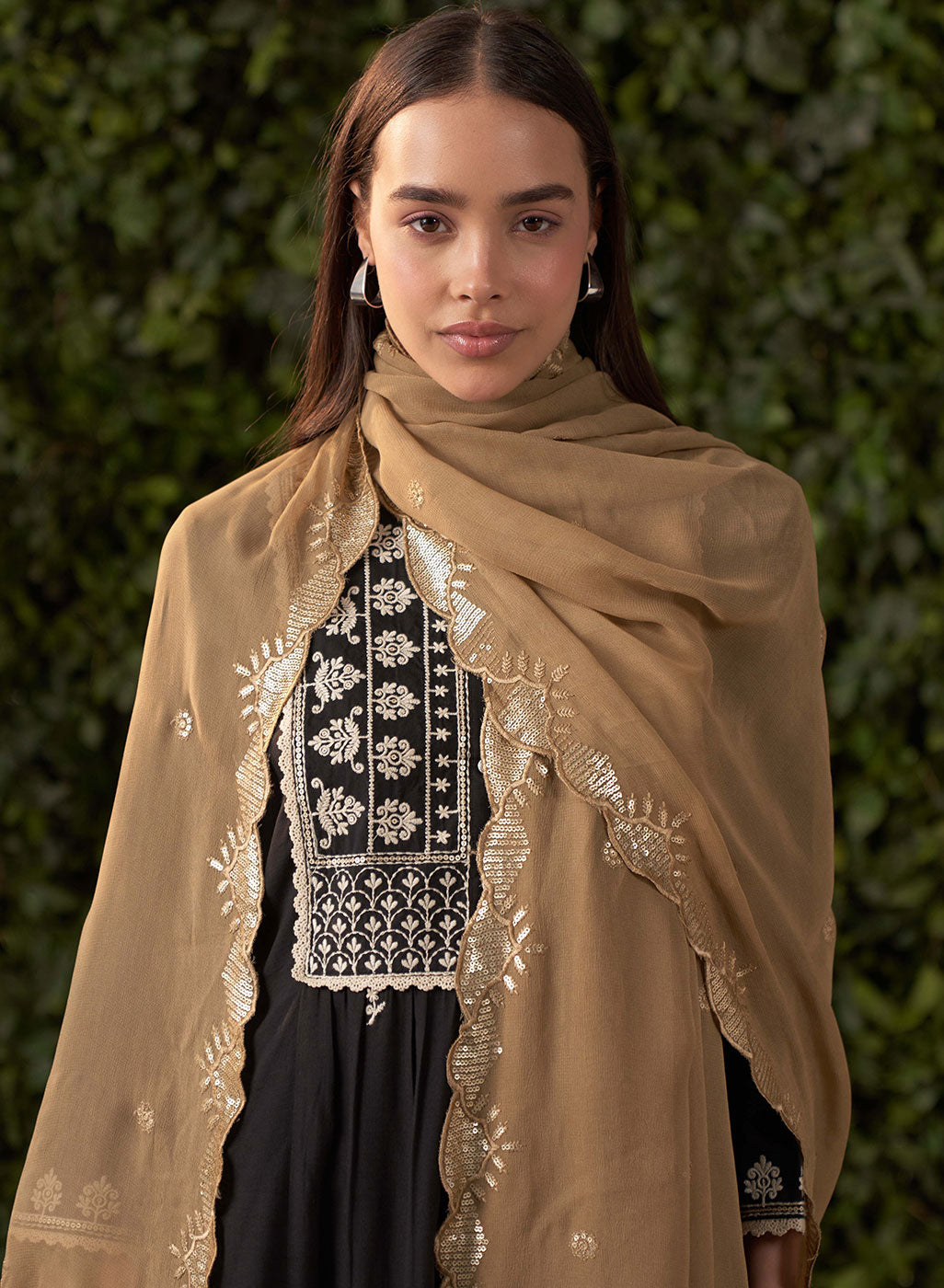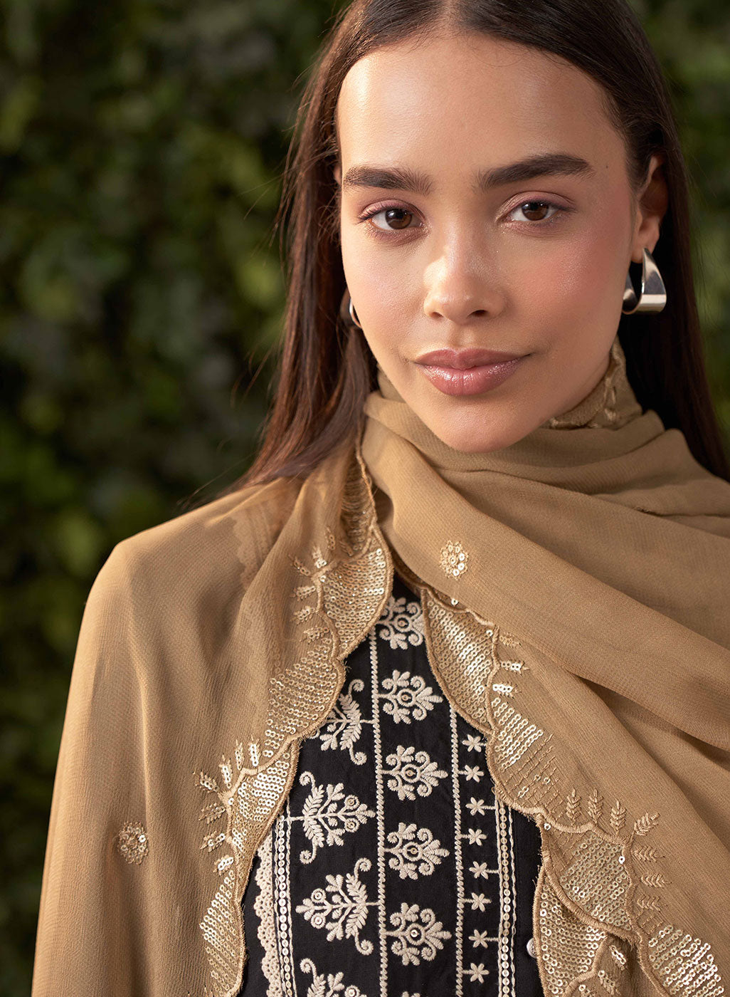 Radiant and timeless—our Sitara Dupatta is where tradition meets quiet glamour. Crafted from a lightweight, breathable georgette that flows like a dream, it carries the ease of comfort with the beauty of fine detail. Sequin work sparkles subtly against resham embroidery, catching light like flickers of stardust. Scalloped edging along the length adds a soft, feminine finish. Perfect for when you want to feel grounded in tradition, yet effortlessly luminous.