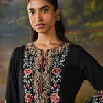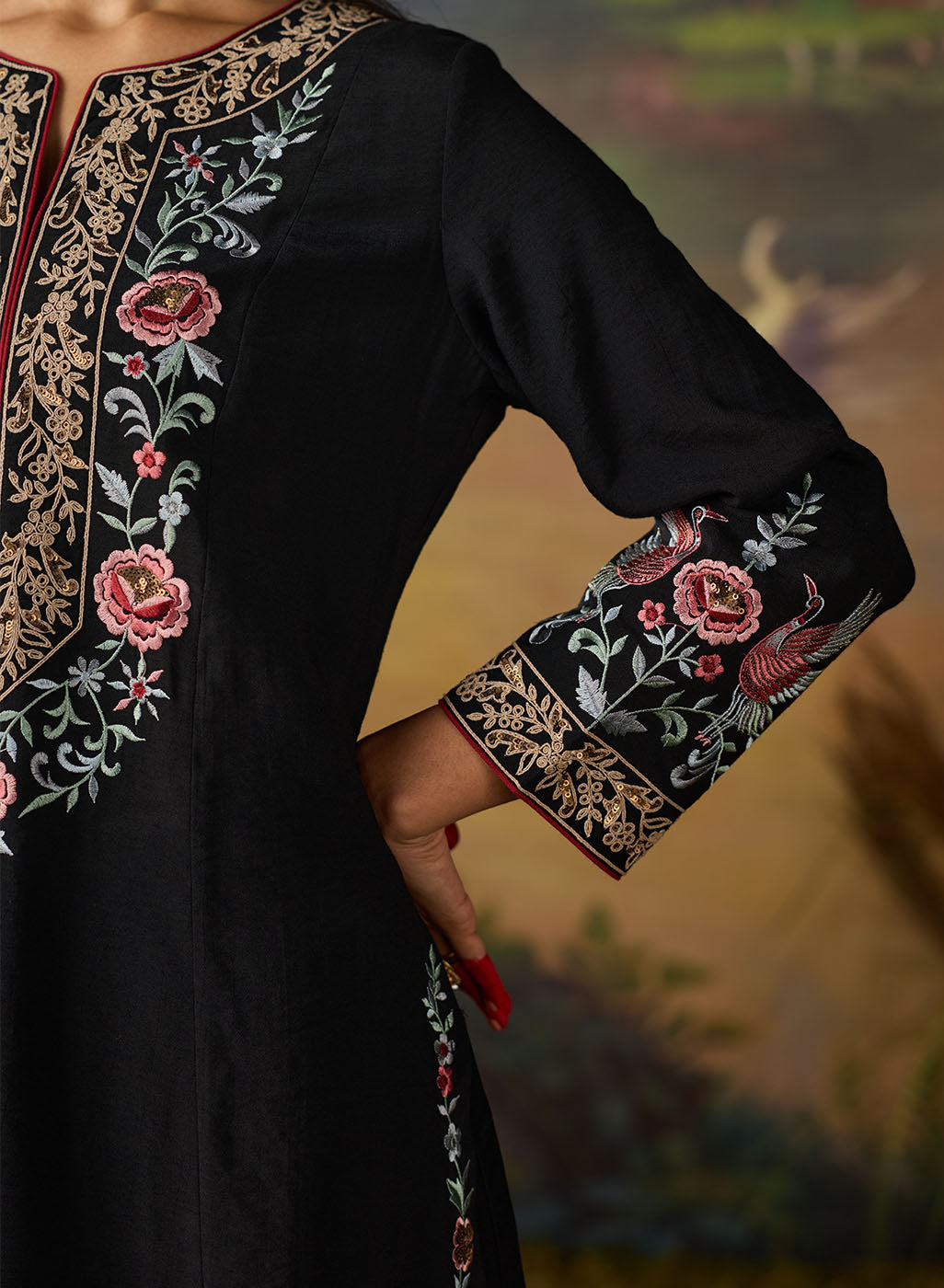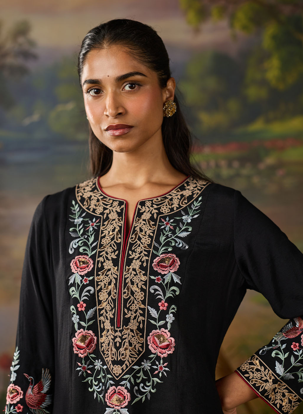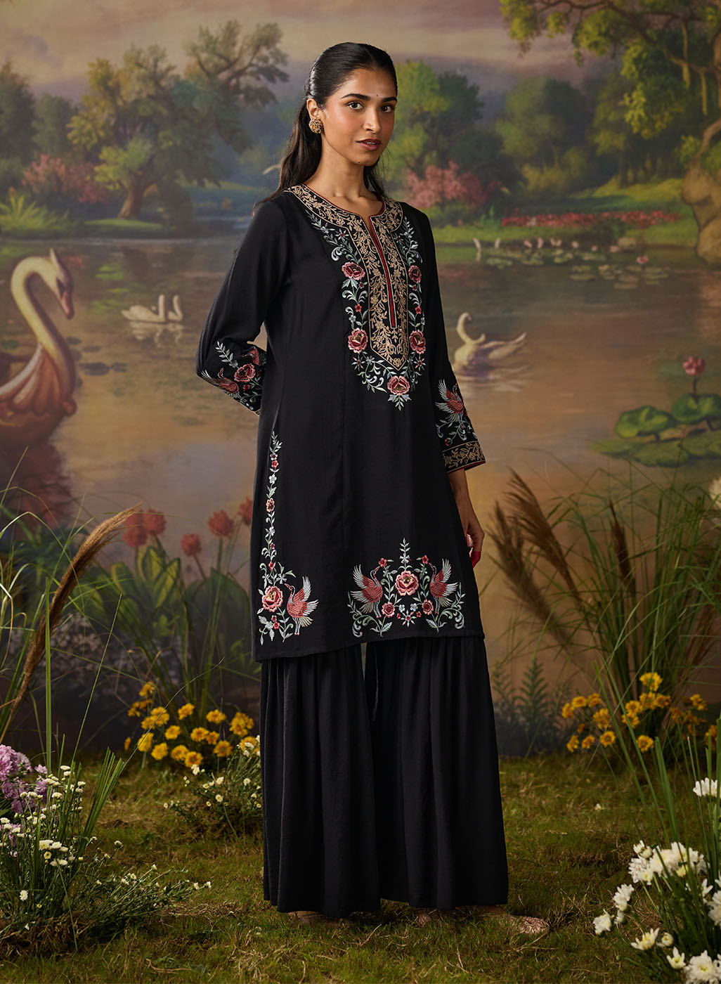 A timeless black co-ord set elevated with rich resham embroidery and playful sharara bottoms. The straight kurta is crafted in a soft, breathable fabric and detailed with intricate embroidery, enhanced with dori work, sequins, and zari highlights. A notched neckline with contrast piping adds a sharp edge, while embroidery details on the side slit, back yoke, and sleeves give it a refined finish. Paired with solid sharara bottoms, designed with gathered ruffles at the thighs and highlighted with bold red piping, the silhouette flares out gracefully at the hem for a festive, statement-making appeal.