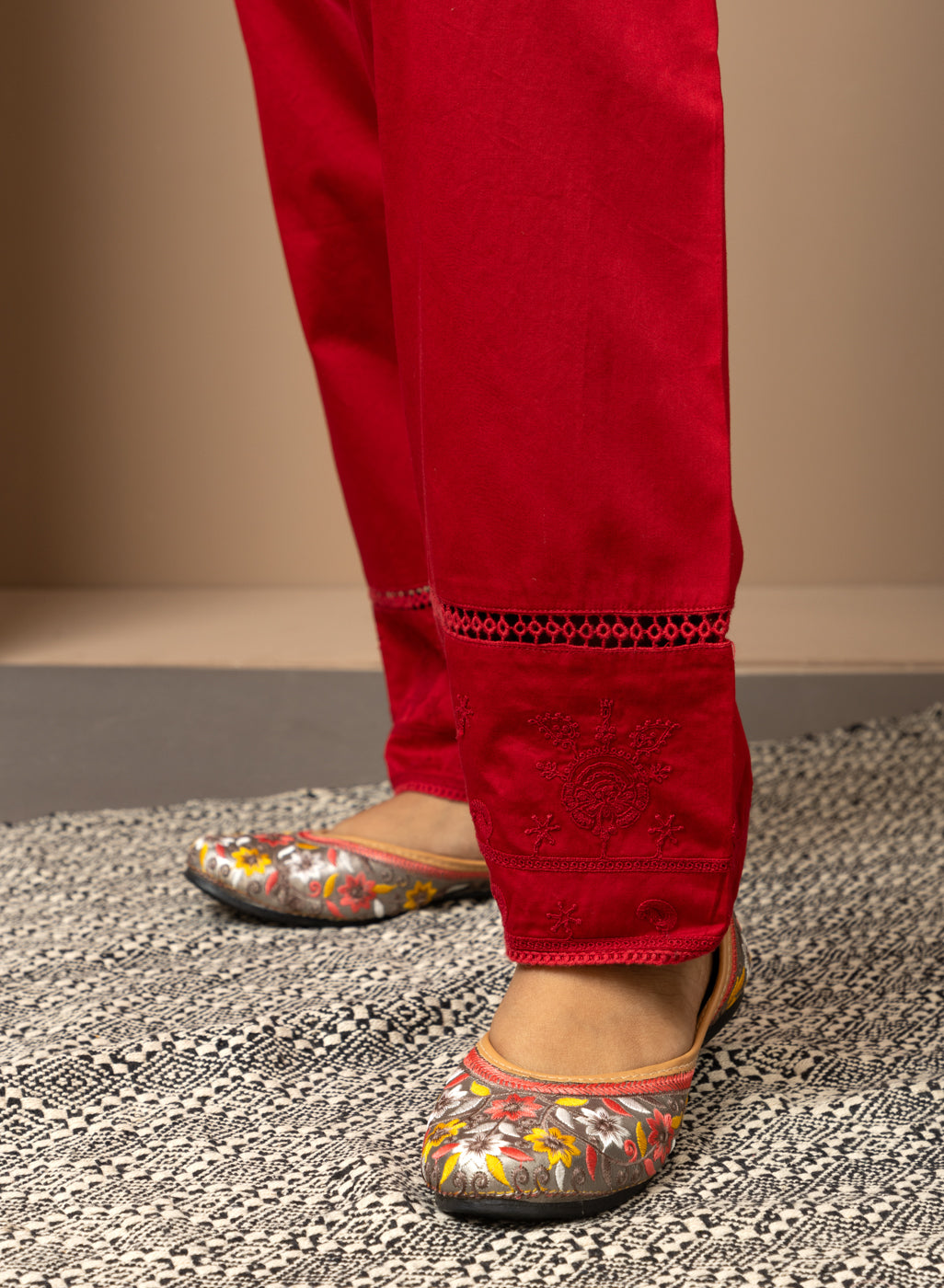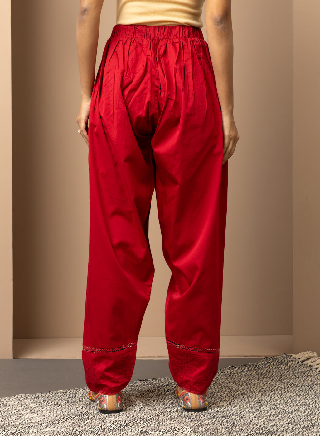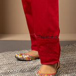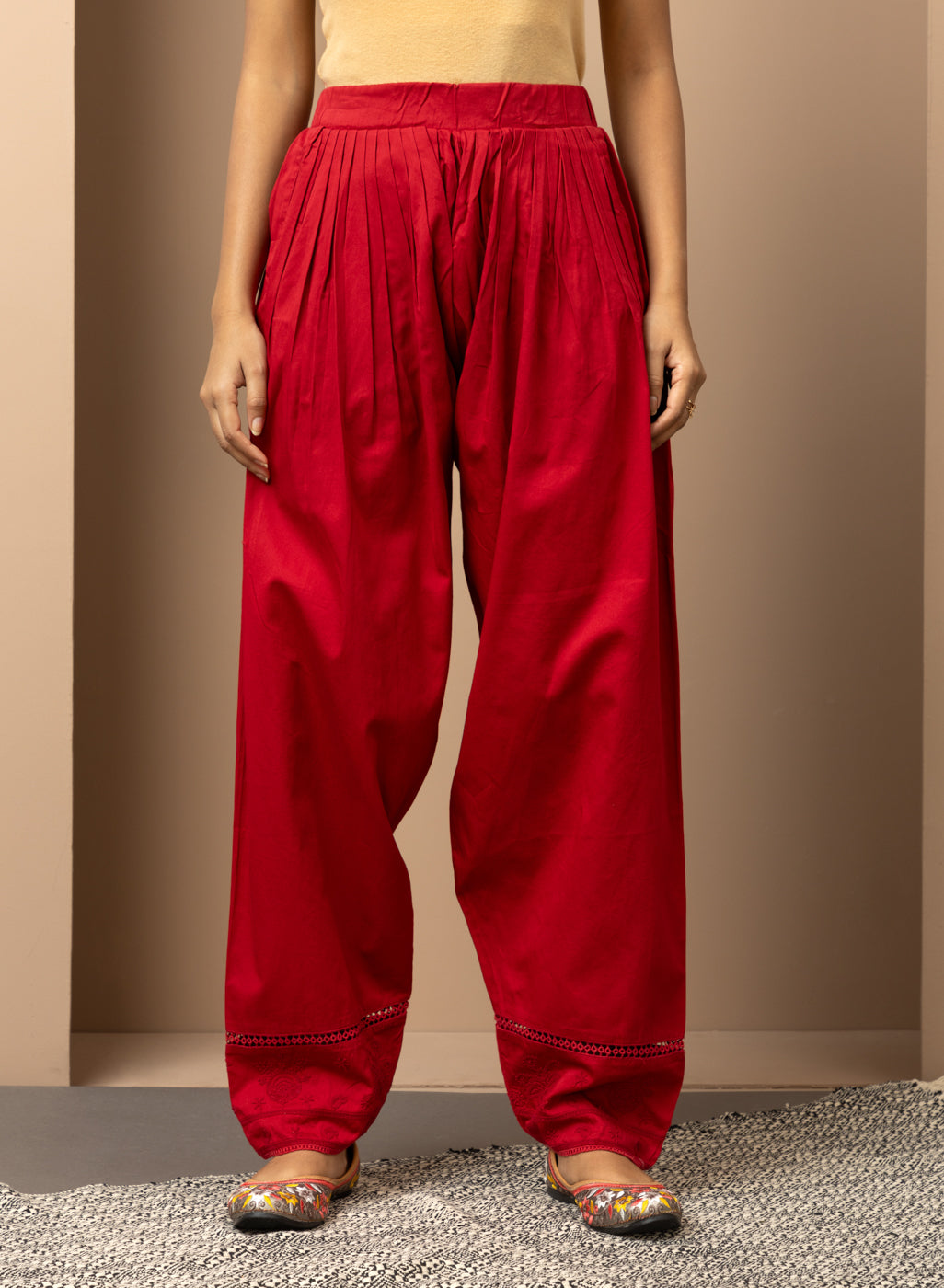 Solid Red Pleated Salwar with Hem Embroidery