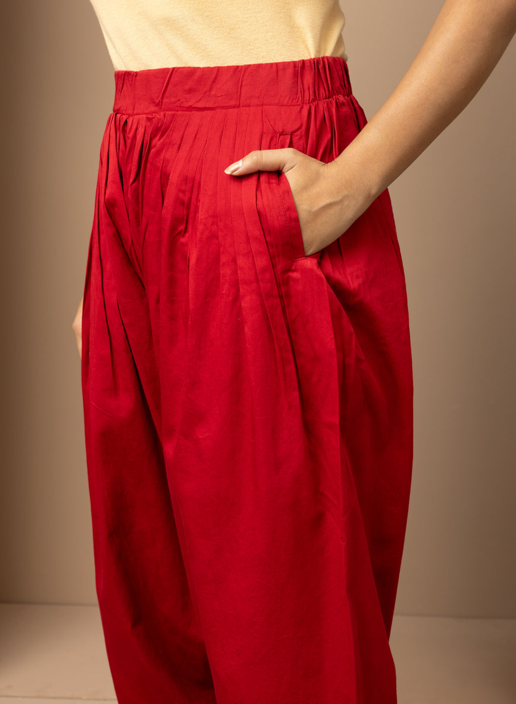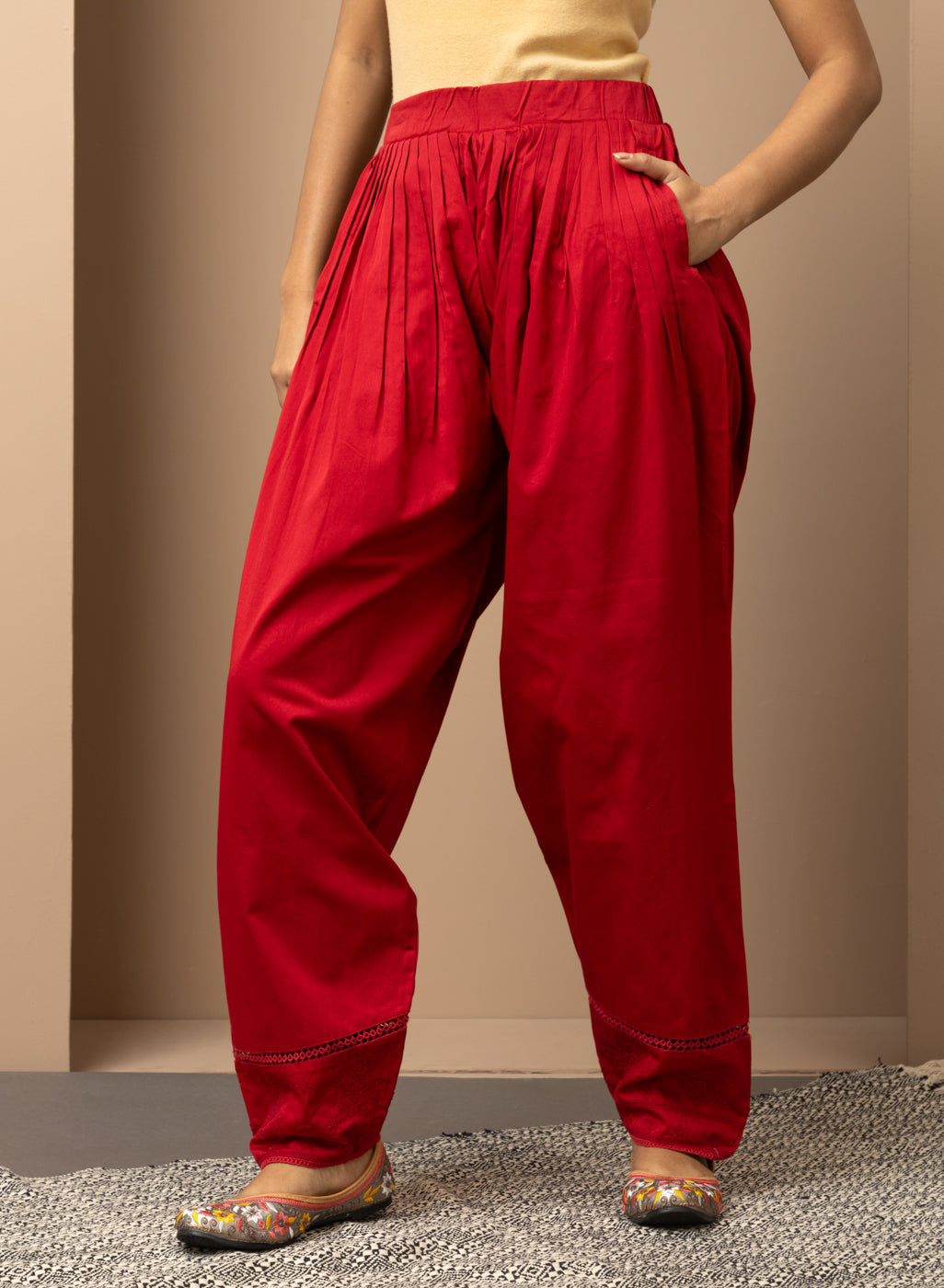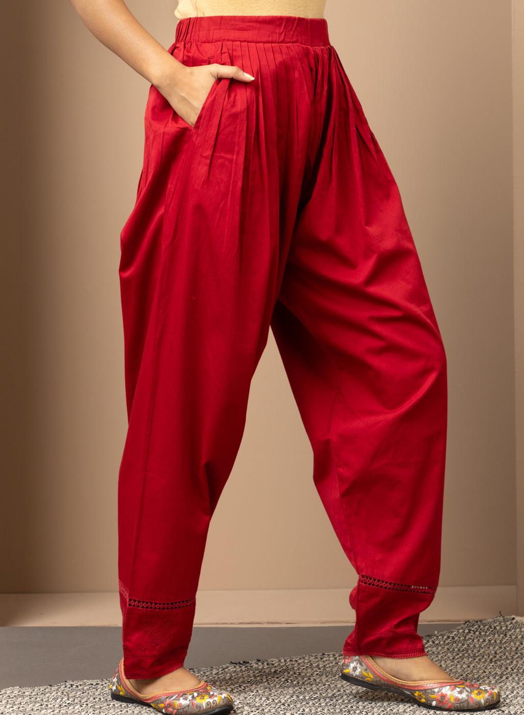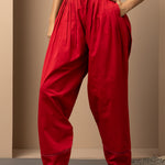 This Solid Red Pleated Salwar is perfect for a traditional look. Accented with hem embroidery, this salwar has a flattering pleated design and comfortable fit, making it an ideal ethnic apparel choice.