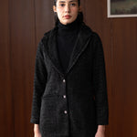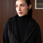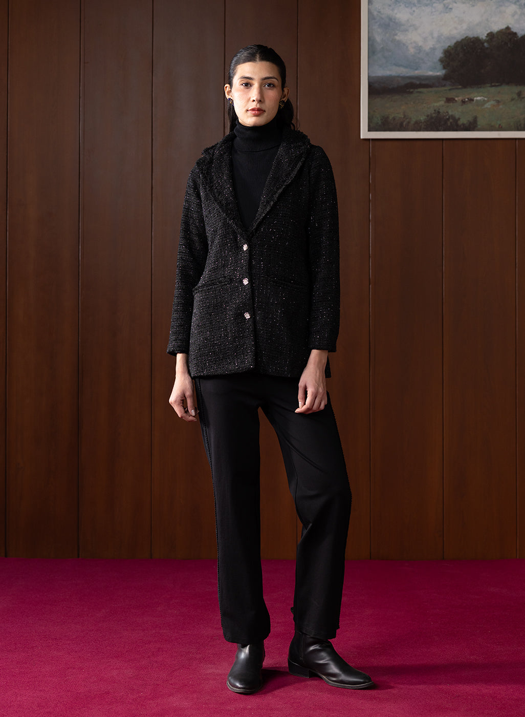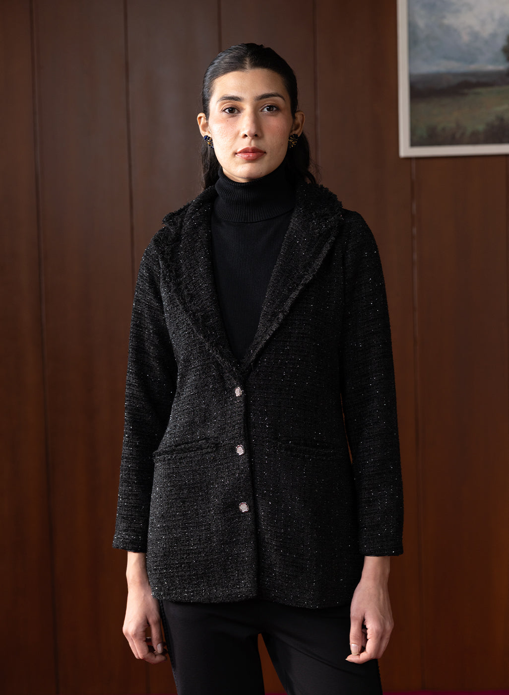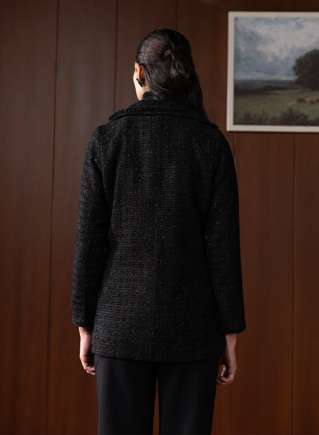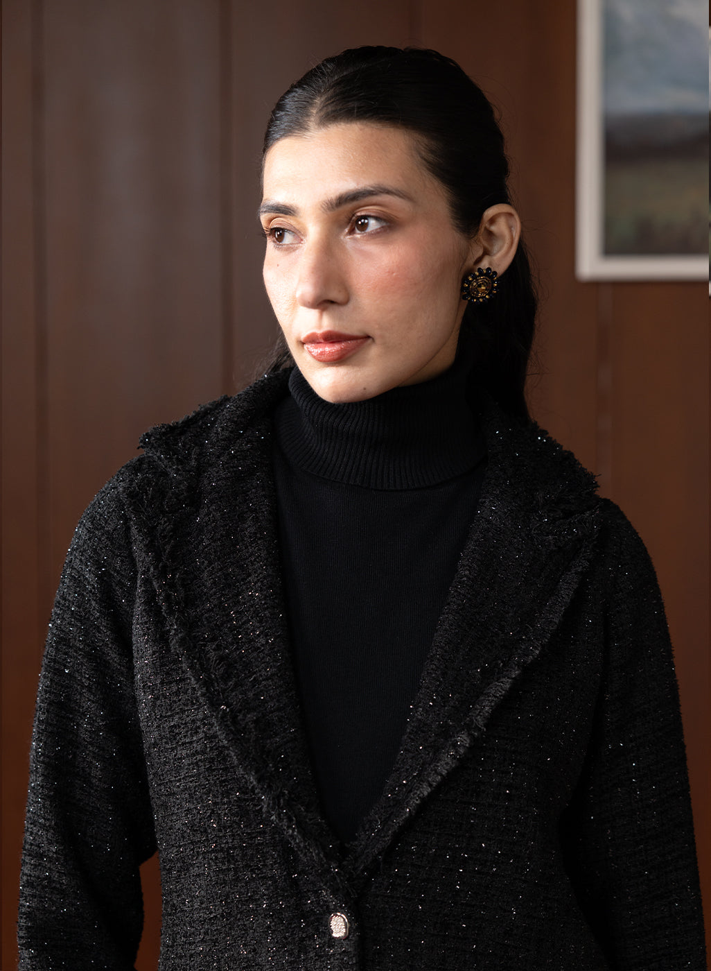 Timeless, polished, and luxurious, this black tweed coat is a winter classic that never goes out of style. Crafted in rich tweed, it blends warmth with refined elegance. The textured finish, soft structure, and subtle sparkle from the metallic buttons give it an elevated appeal—perfect for both everyday chic and evening sophistication.