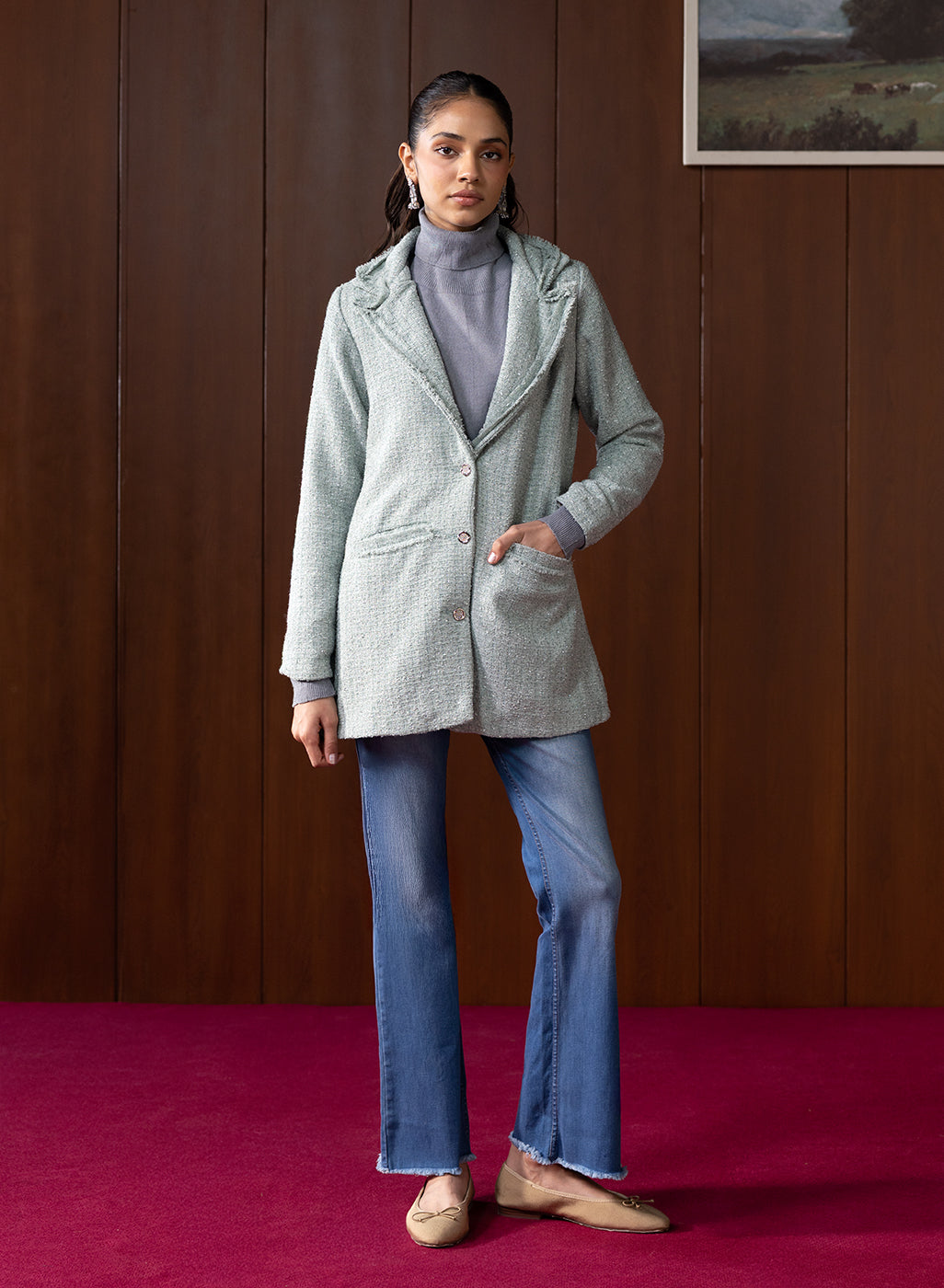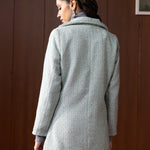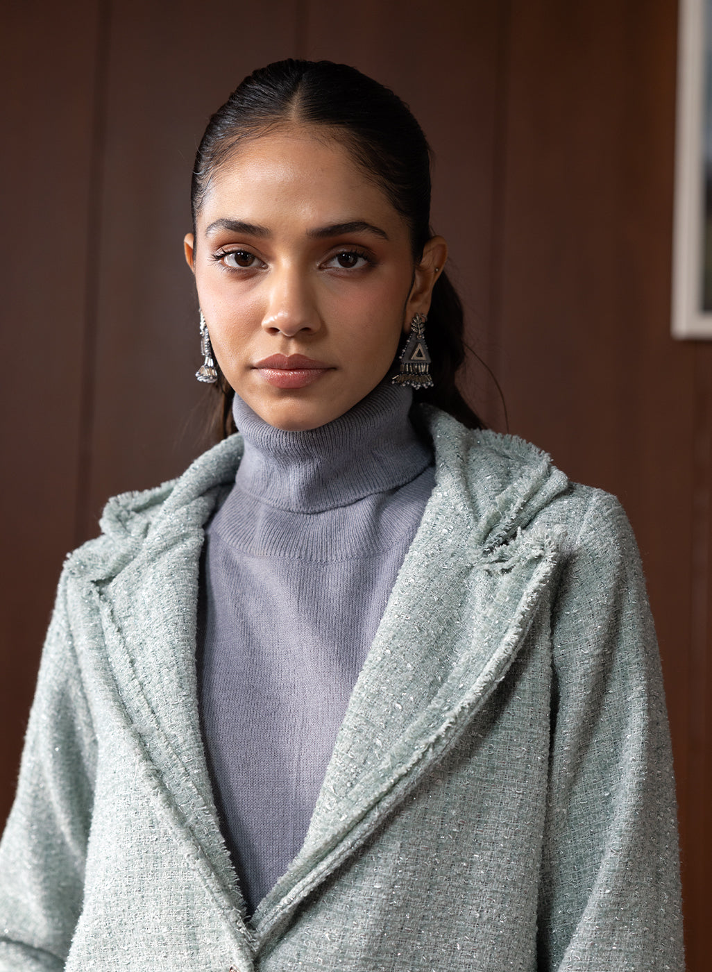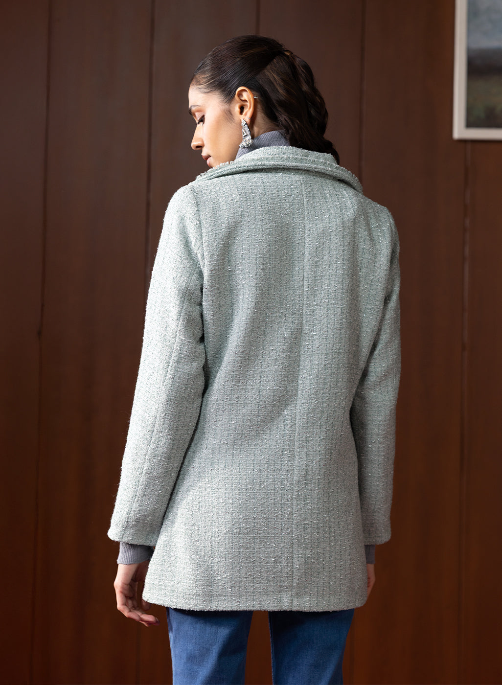 Soft, serene, and refreshingly modern, this mint-green tweed coat brings a gentle pop of colour to winter styling. The textured fabric adds character, while the pastel tone keeps the look effortlessly feminine. Crafted for warmth and elegance, it elevates even the simplest outfit with a polished, put-together charm.