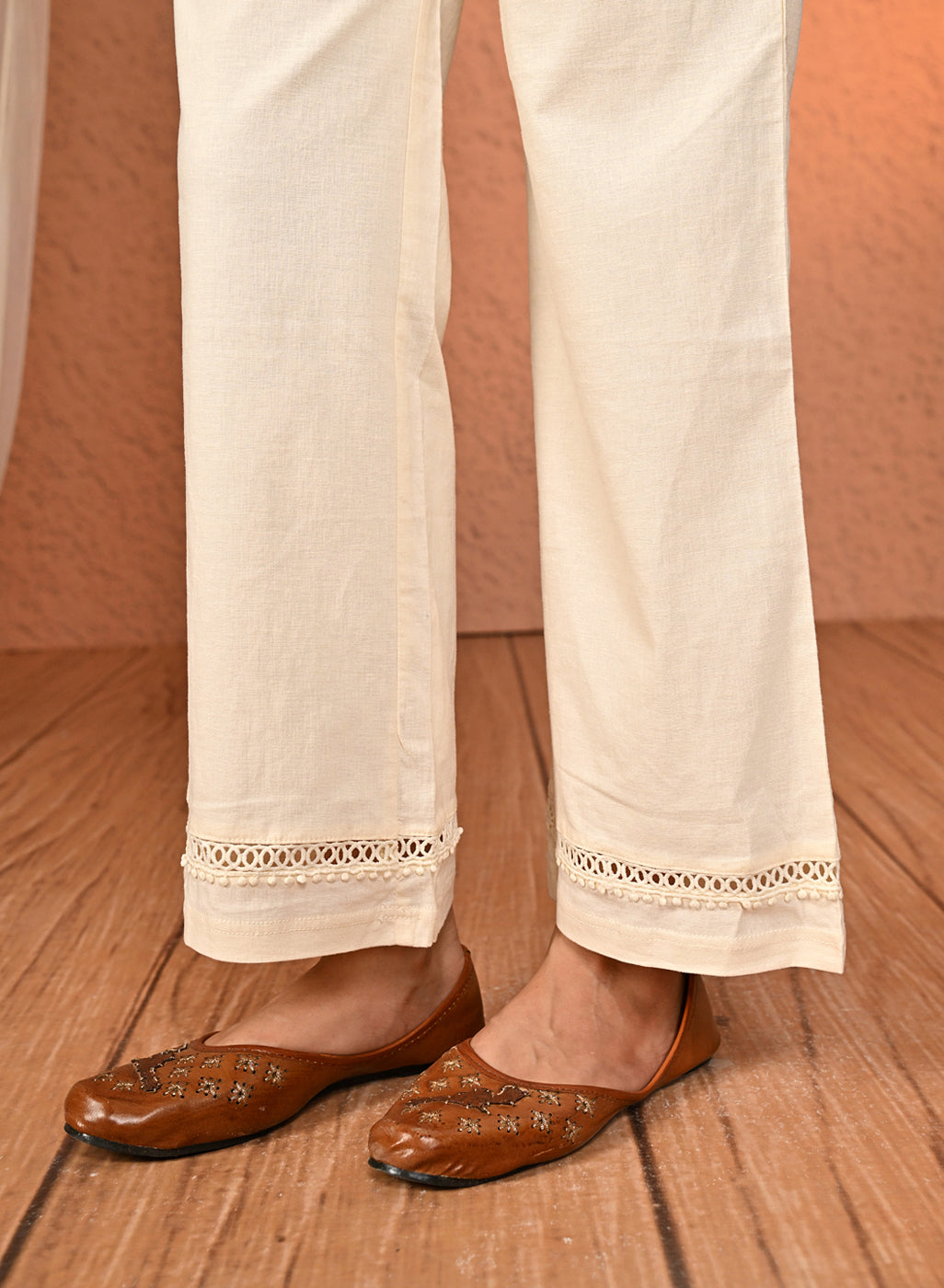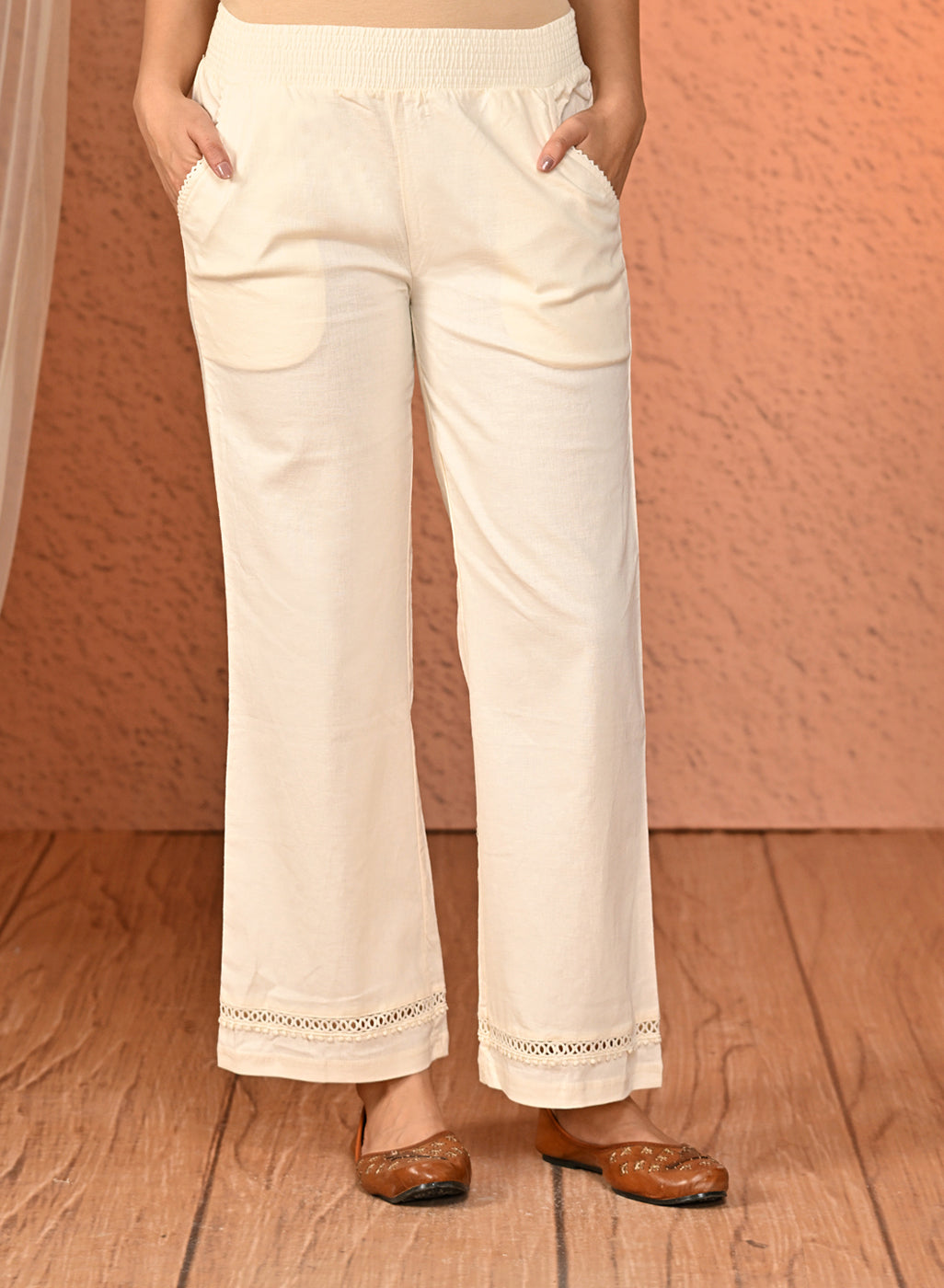 Our Haya Salmon Ivory Cotton Linen Classic Fit Pants for Women offer a perfect balance of comfort and style. Crafted from breathable cotton-linen fabric with a slight stretch, these pants ensure ease of movement and all-day comfort.