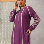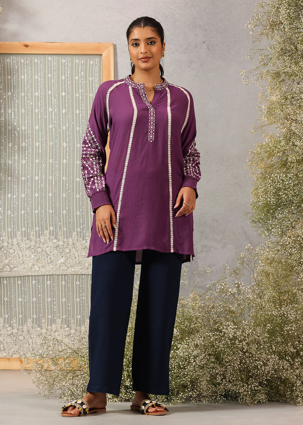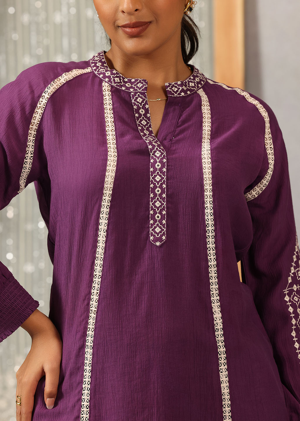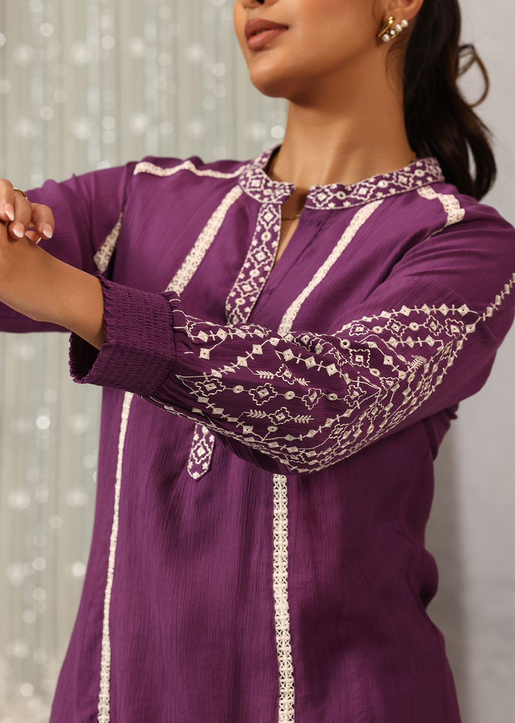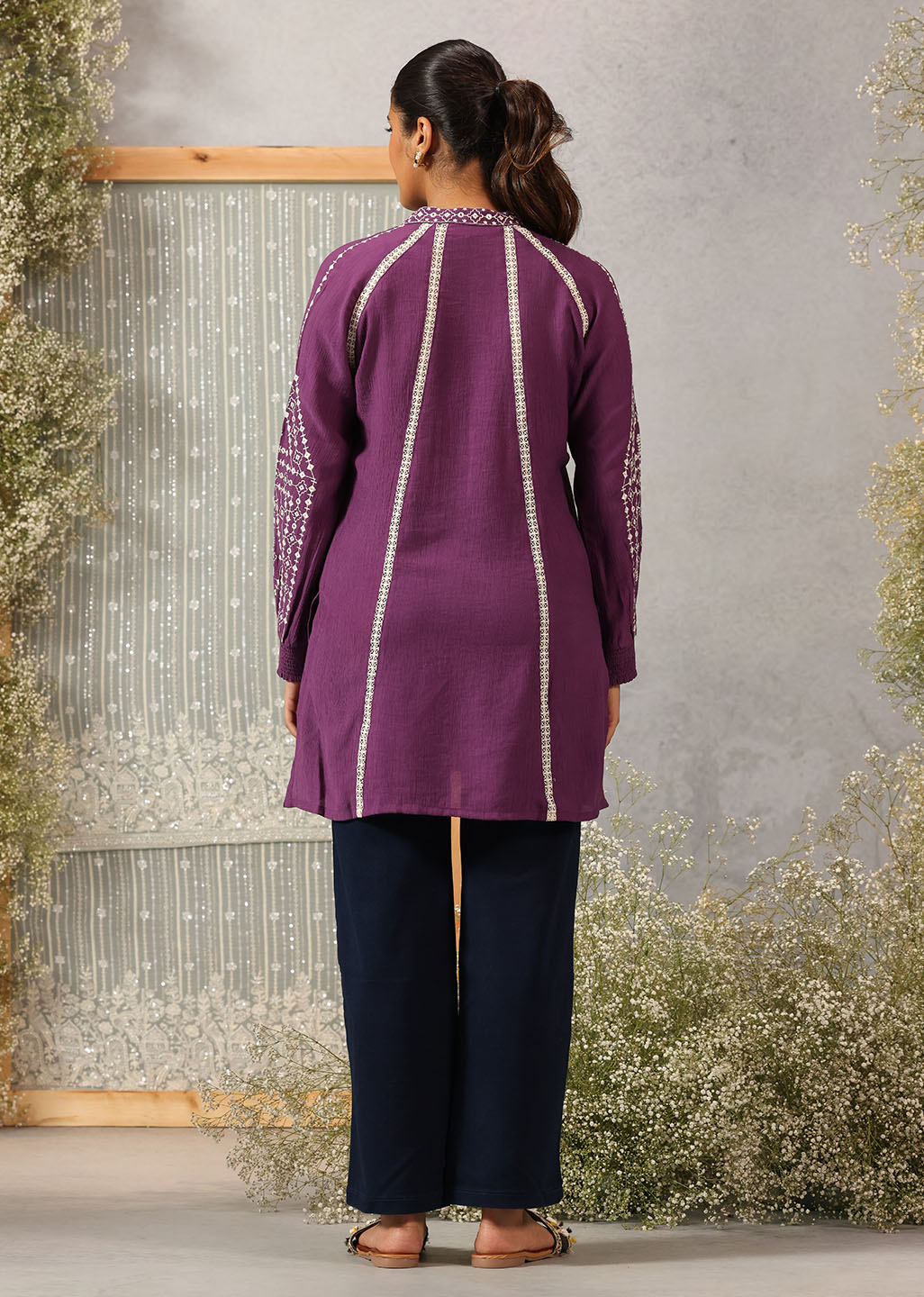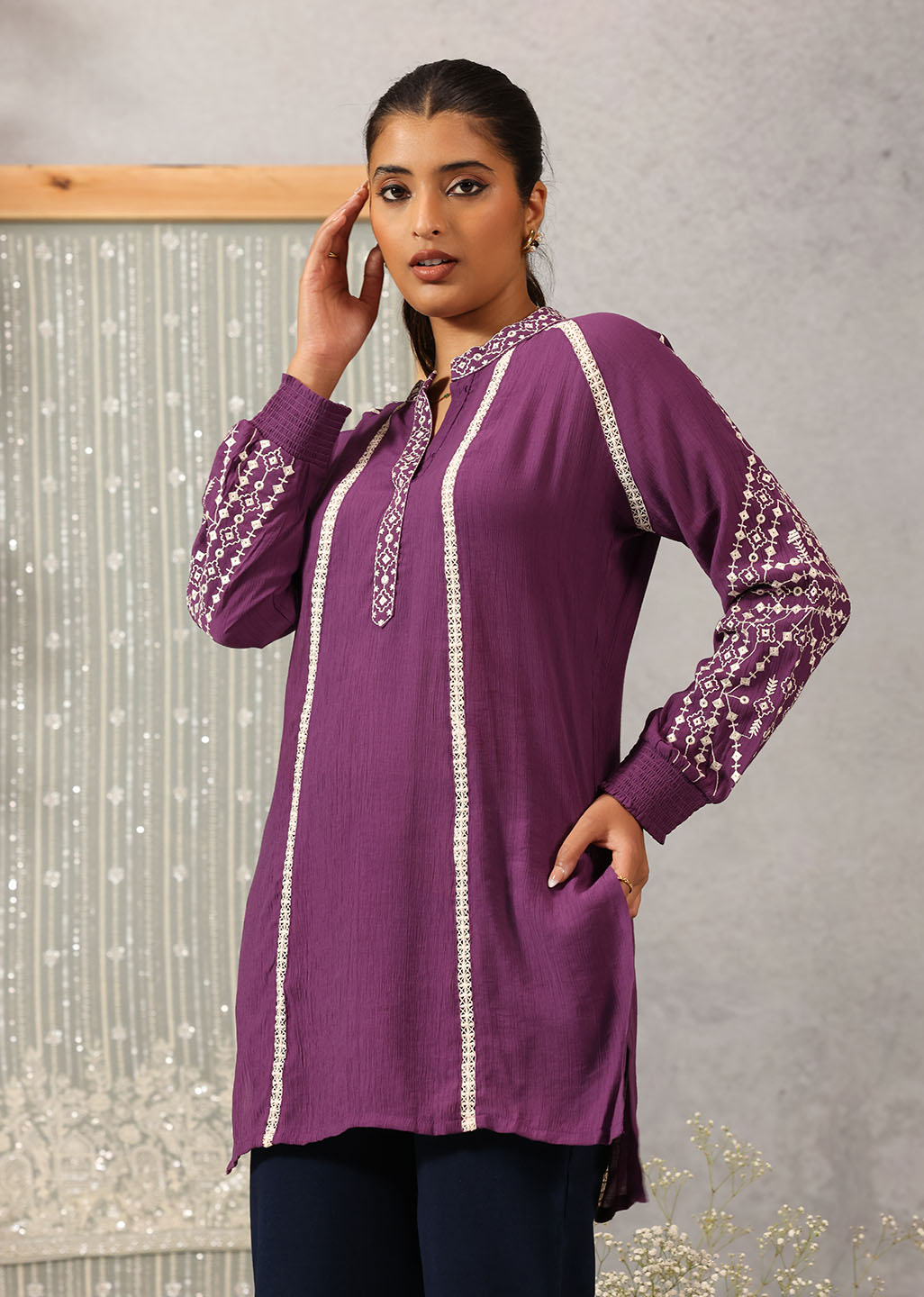 Surur Purple Embroidered Cotton Viscose Crinkled Top for Women