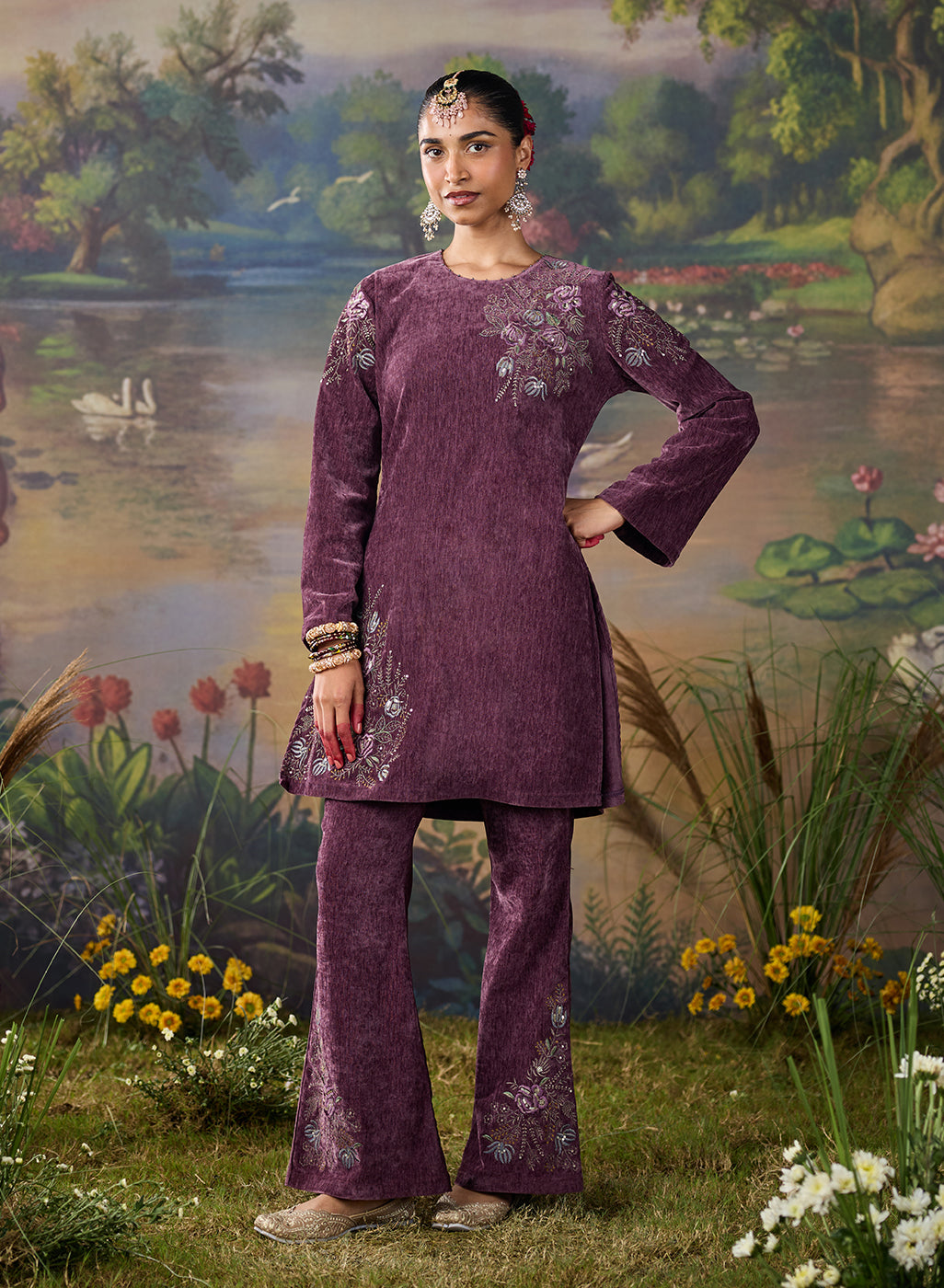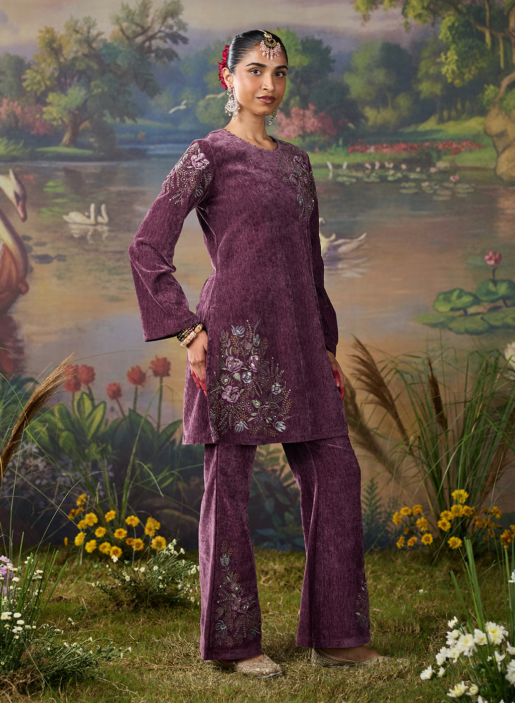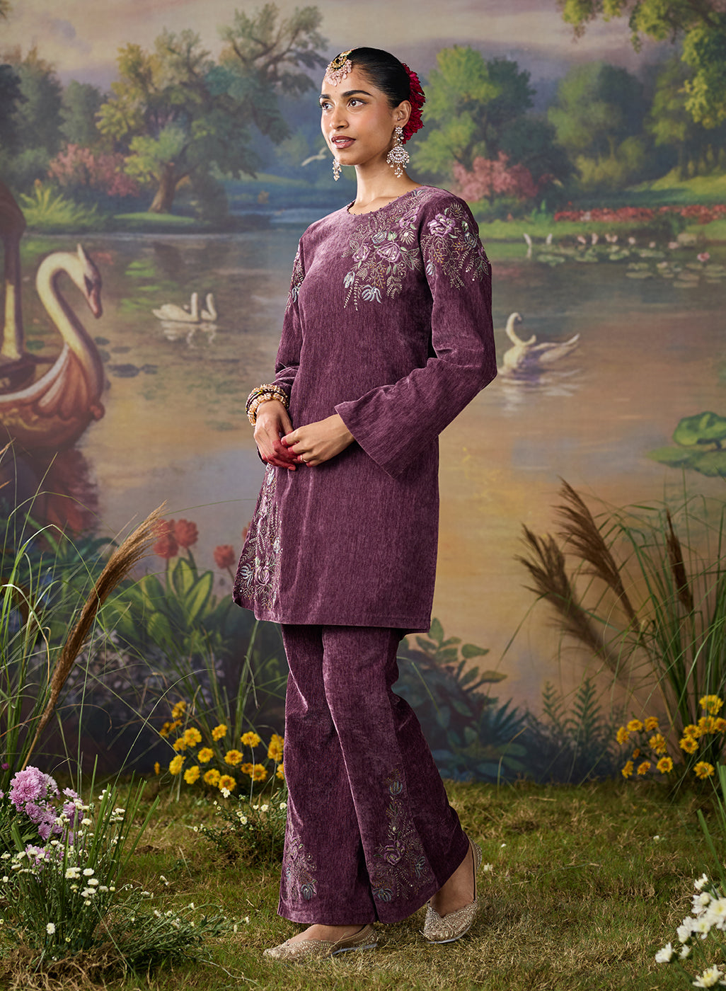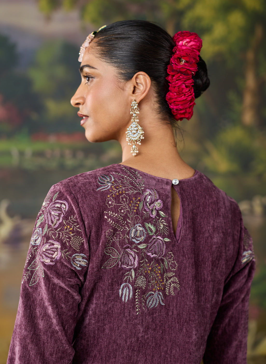 This purple velvet co-ord set embodies understated elegance with a touch of old-world charm. The plush fabric drapes beautifully, catching the light with its natural sheen, while intricate resham embroidery with hints of zari and sequins adds added shimmer. Effortlessly refined yet relaxed in spirit, it's the kind of ensemble that speaks volumes through texture, detail, and quiet sophistication.