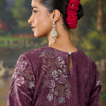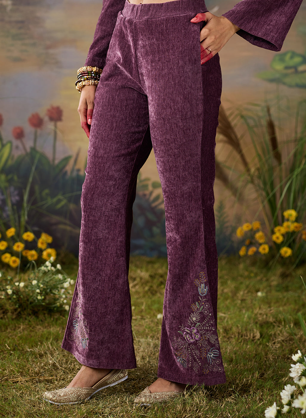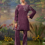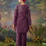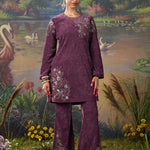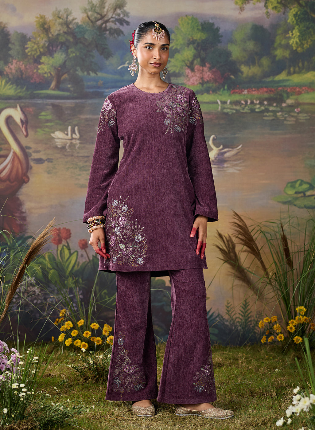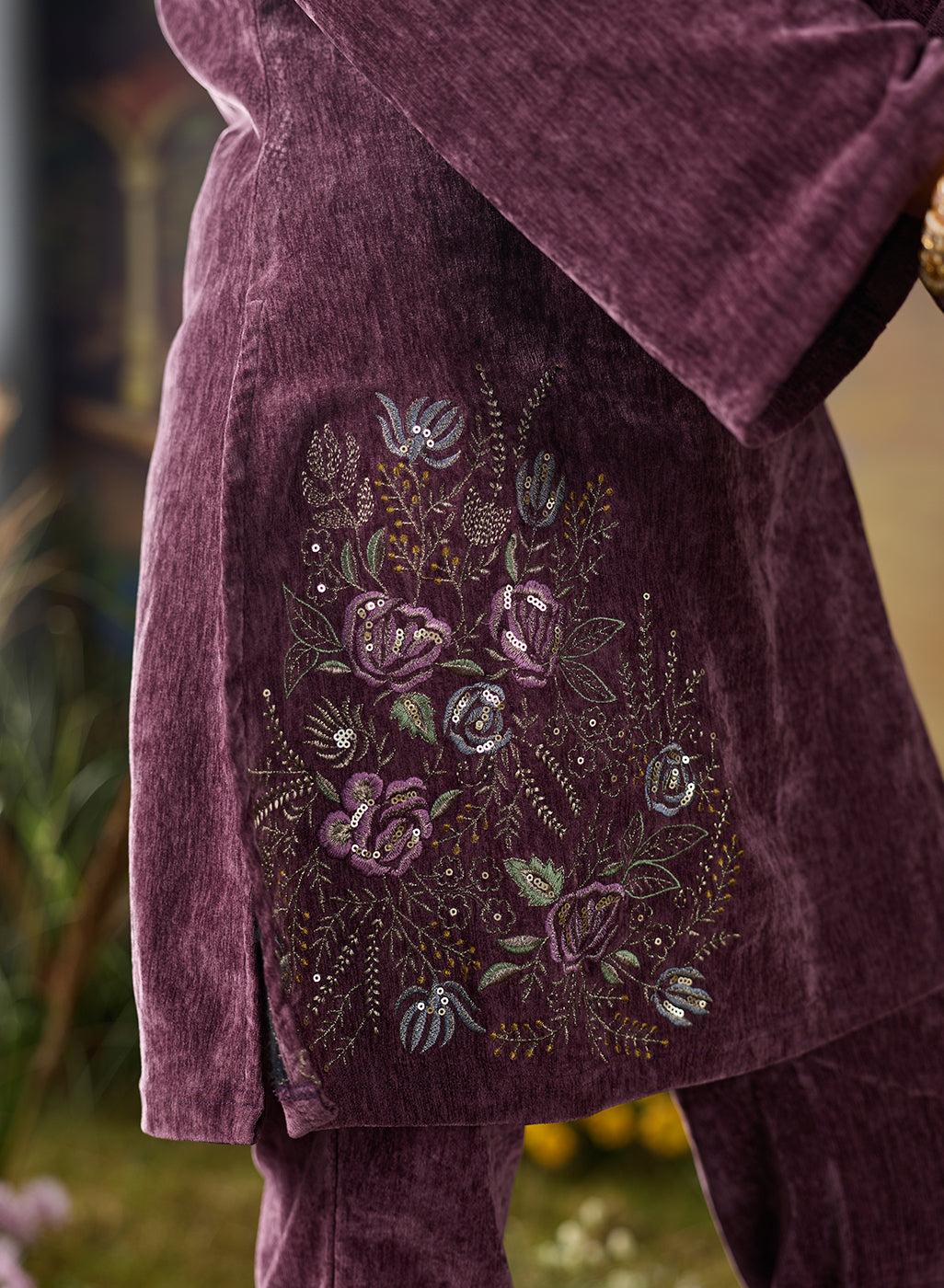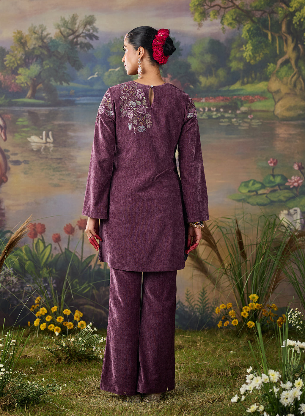 This purple velvet co-ord set embodies understated elegance with a touch of old-world charm. The plush fabric drapes beautifully, catching the light with its natural sheen, while intricate resham embroidery with hints of zari and sequins adds added shimmer. Effortlessly refined yet relaxed in spirit, it's the kind of ensemble that speaks volumes through texture, detail, and quiet sophistication.
