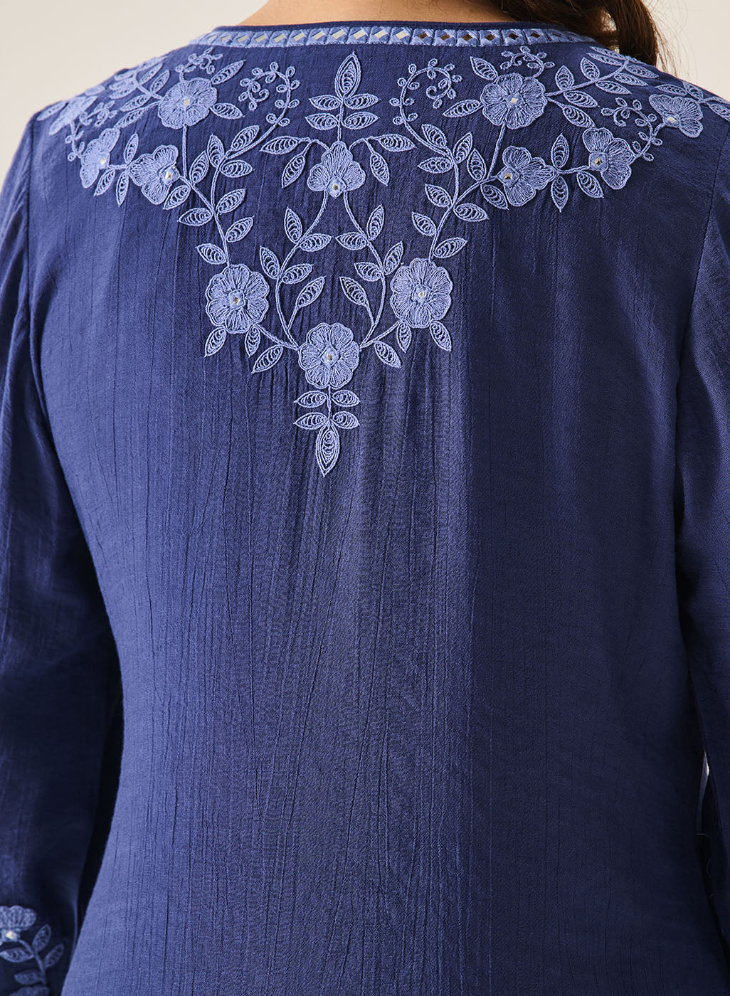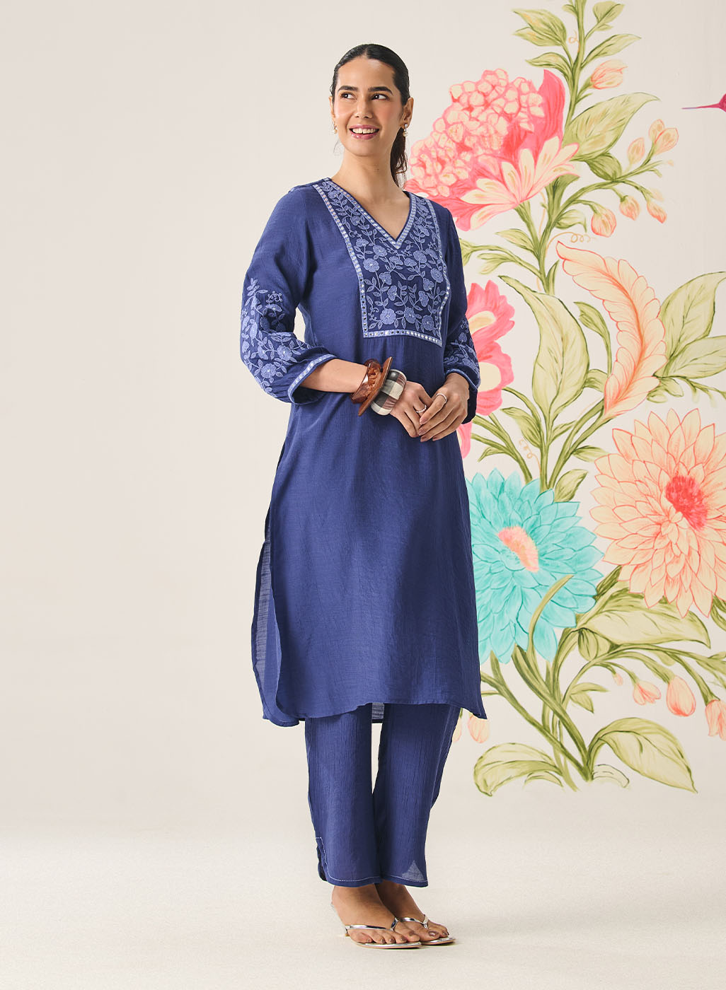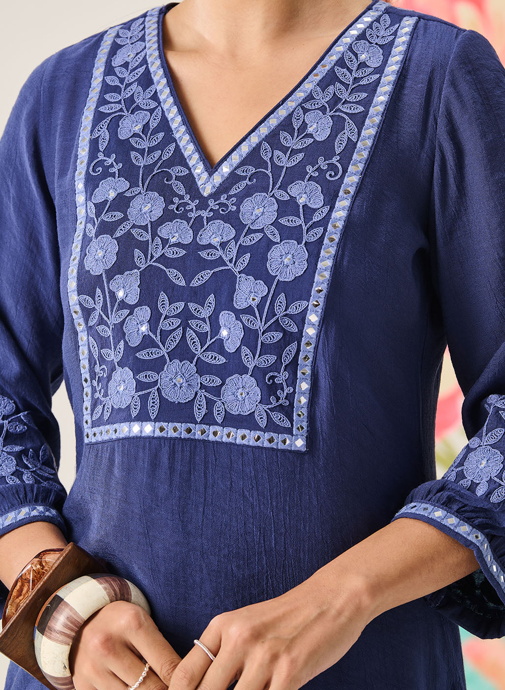Simple and versatile, this blue kurta set blends comfort with intricate detailing. The delicate dori embroidery and mirror accents add interest, making it a great pick for relaxed days and spontaneous plans.