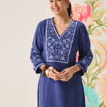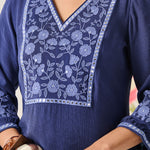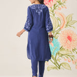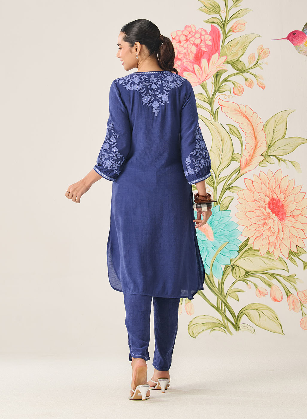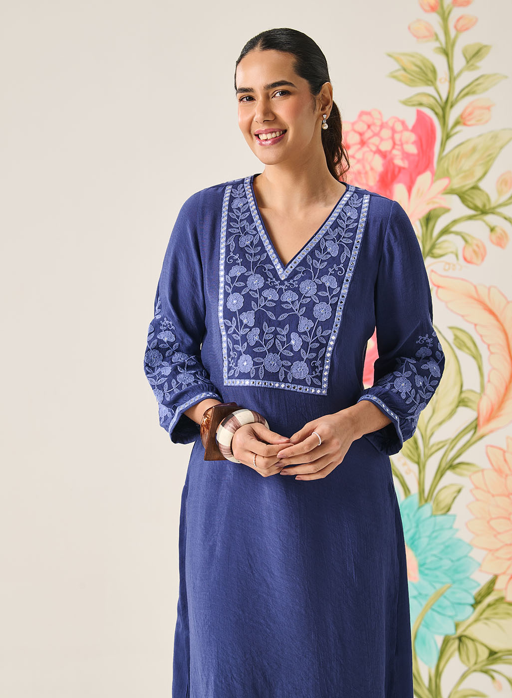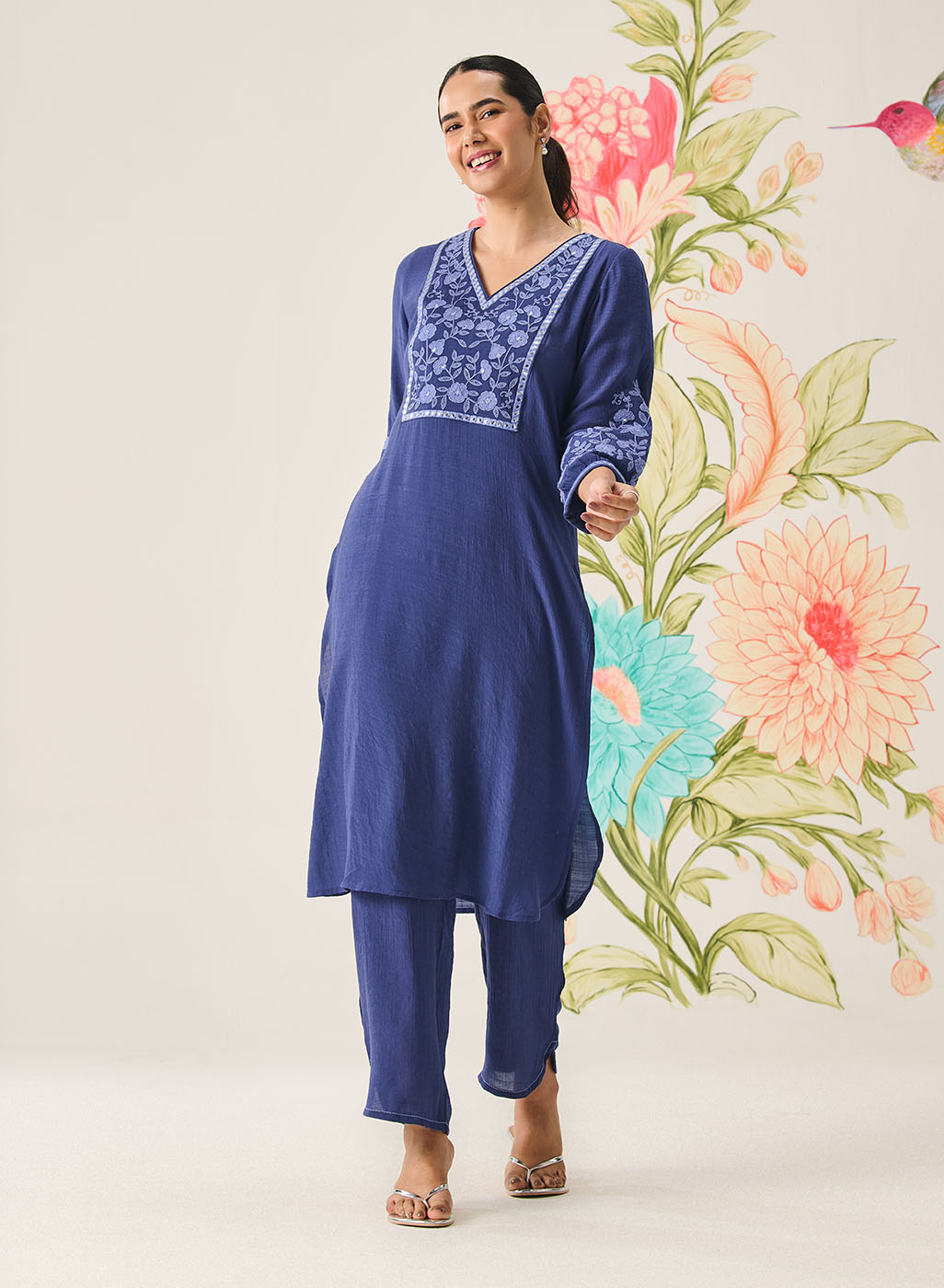 Simple and versatile, this blue kurta set blends comfort with intricate detailing. The delicate dori embroidery and mirror accents add interest, making it a great pick for relaxed days and spontaneous plans.