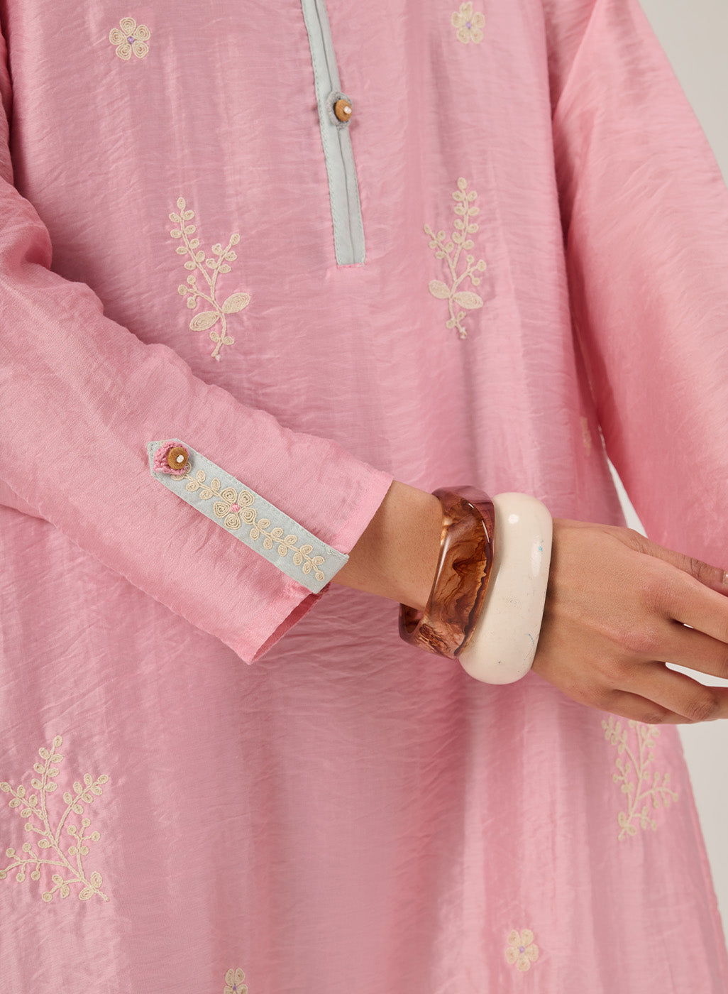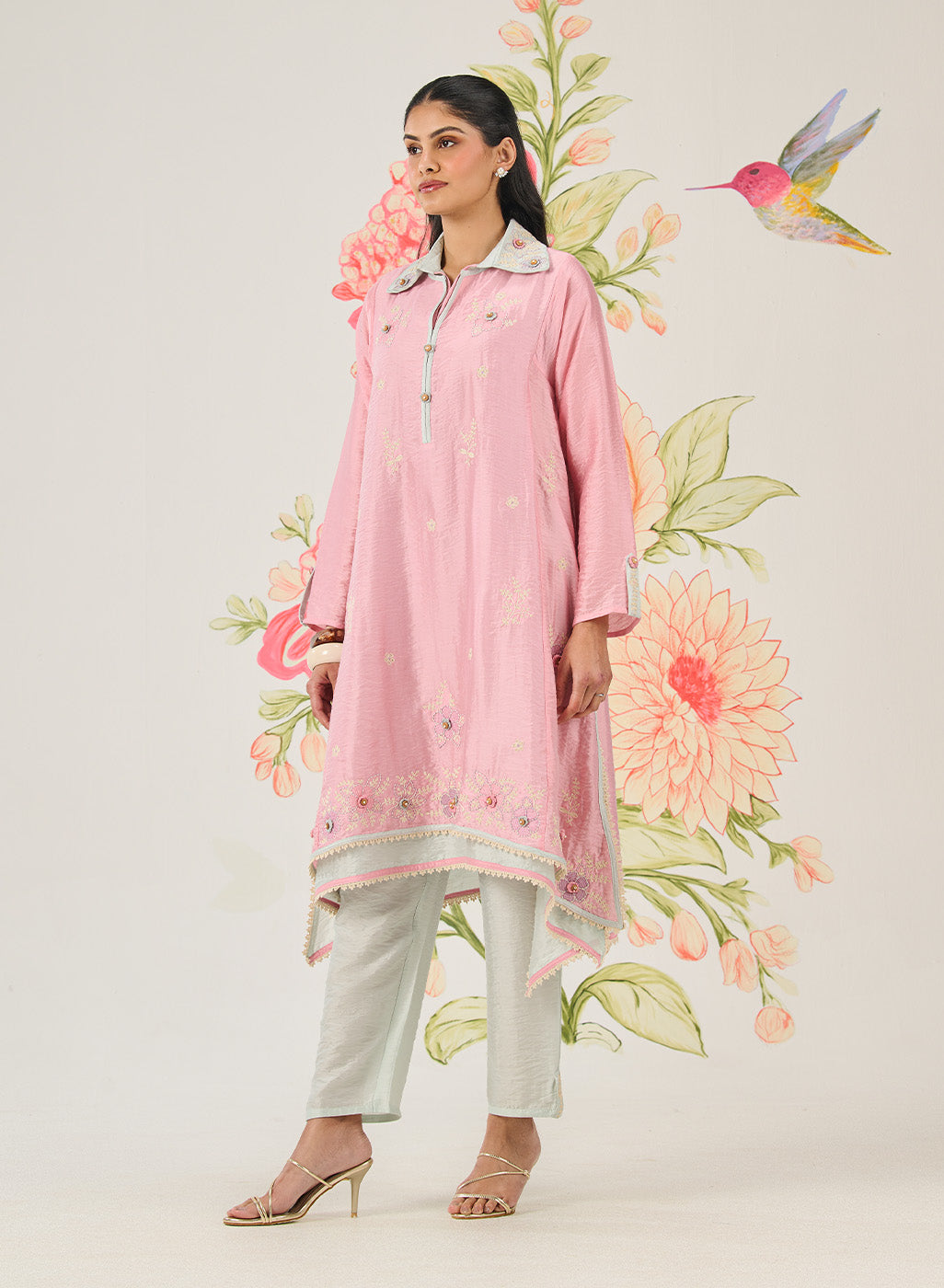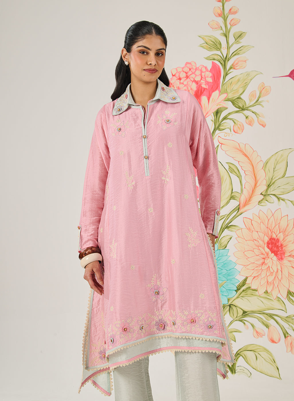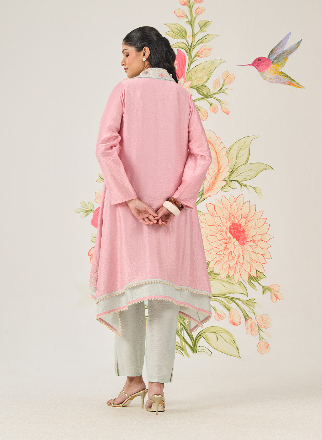 This pink kurta set feels delicate yet confident, where delicate details meet a fluid, modern silhouette. The asymmetrical hem and double-collar neckline create visual interest, while crochet florals and fine embroidery lend it a sense of thoughtful craftsmanship.