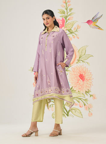 A deep tone, rich with artisanal expression, this purple kurta set feels bold yet balanced. The architectural neckline and asymmetrical hemline bring modern structure, while hand-finished embroidery and crochet florals soften the look with artisanal warmth.