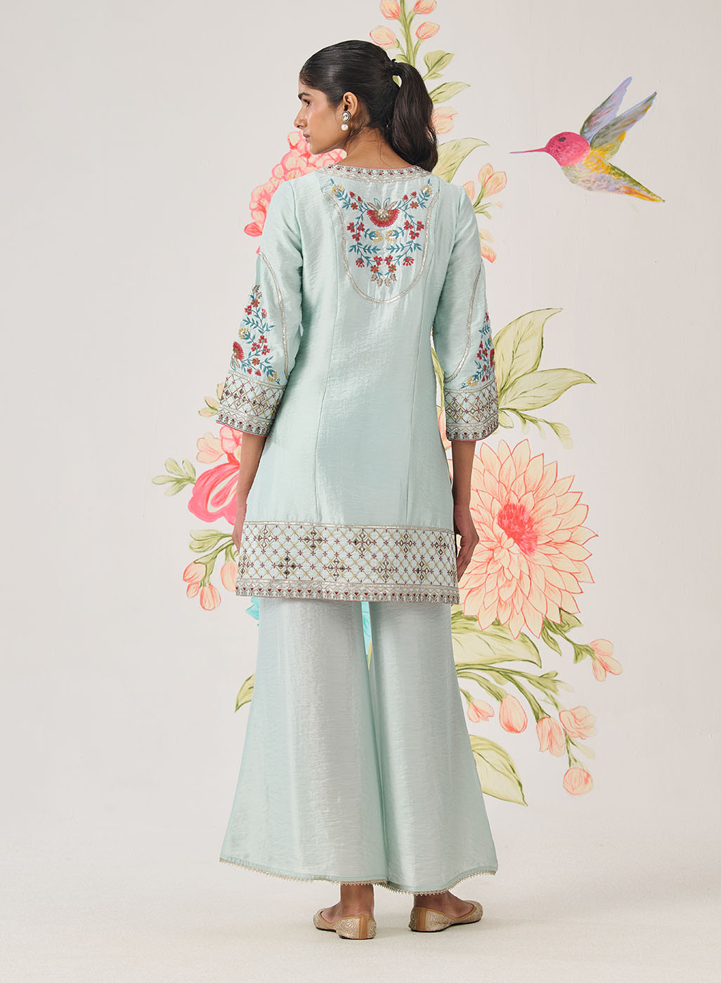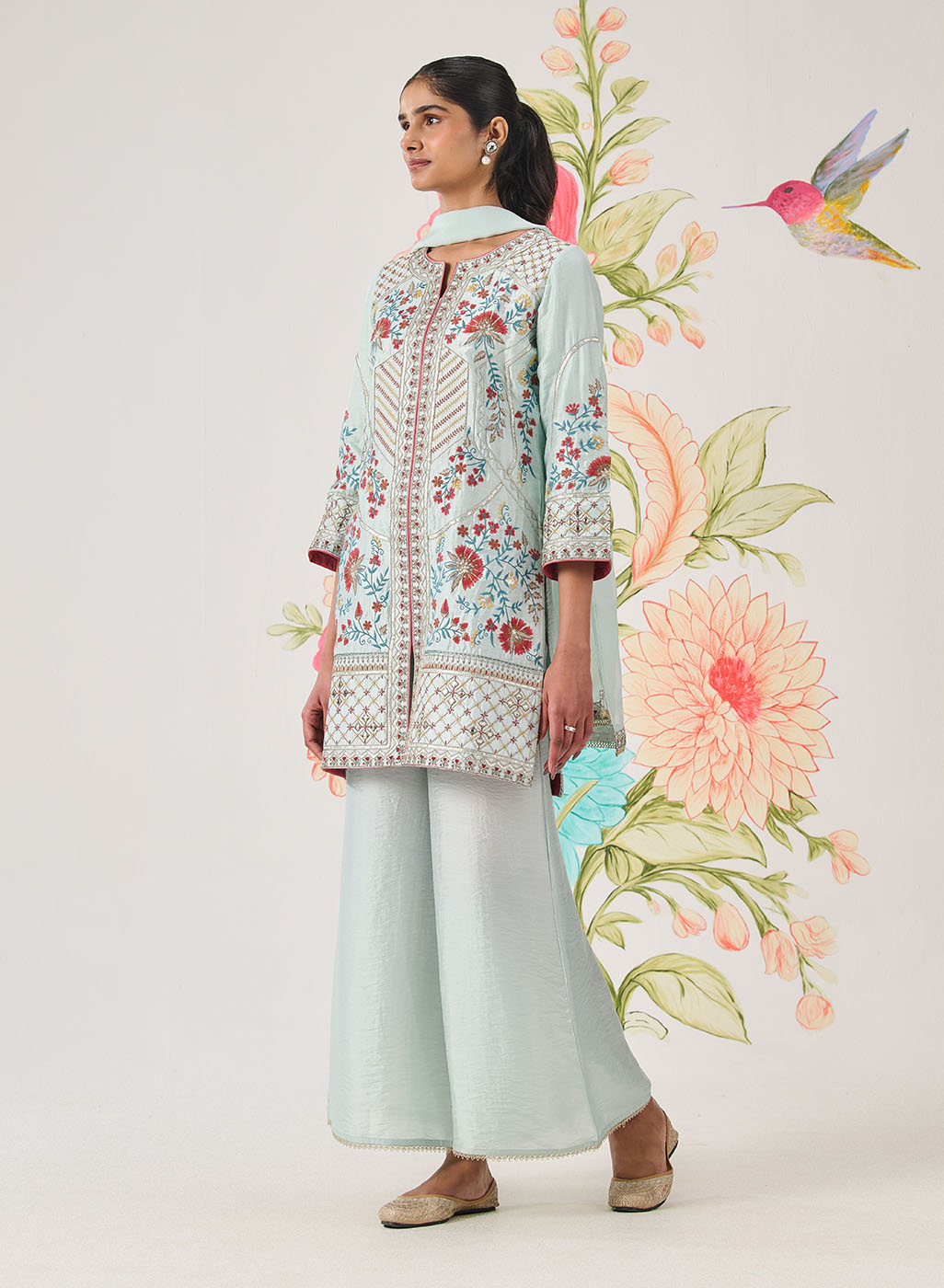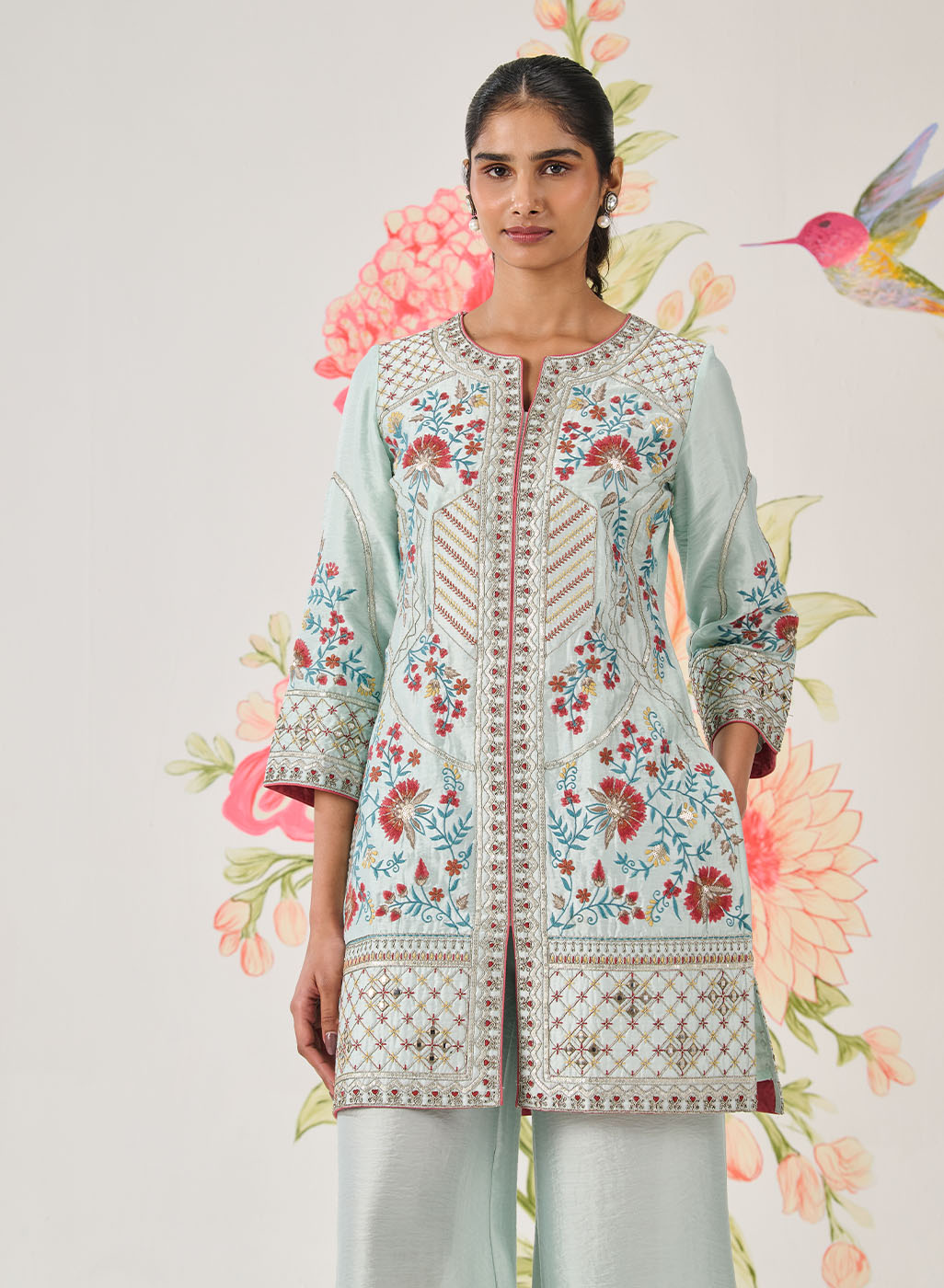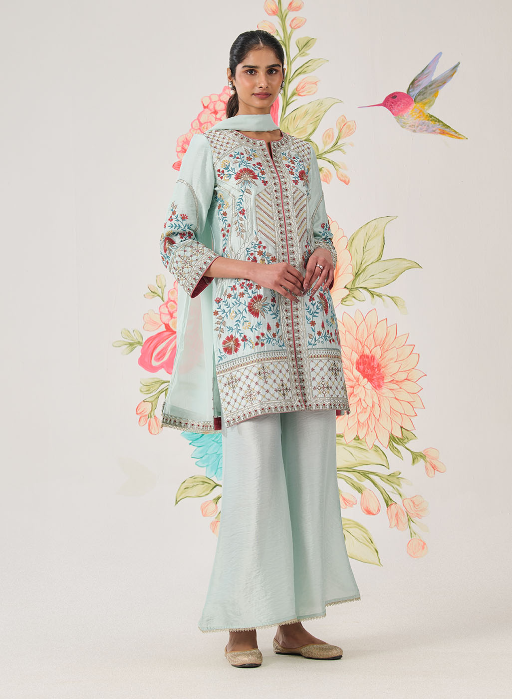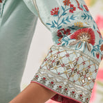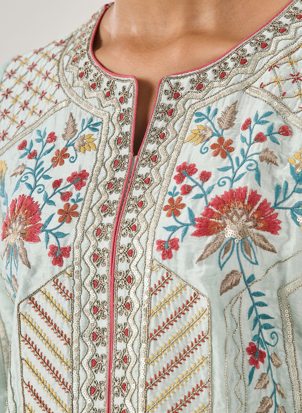 Designed in a serene sky blue, this panelled kurta feels light, graceful, and exquisitely crafted. Intricate floral embroidery flows across the silhouette, accented with delicate jaali work and subtle shimmer. Every detail—from the soft sheen of the fabric to the lace-finished edges—speaks of refined elegance.