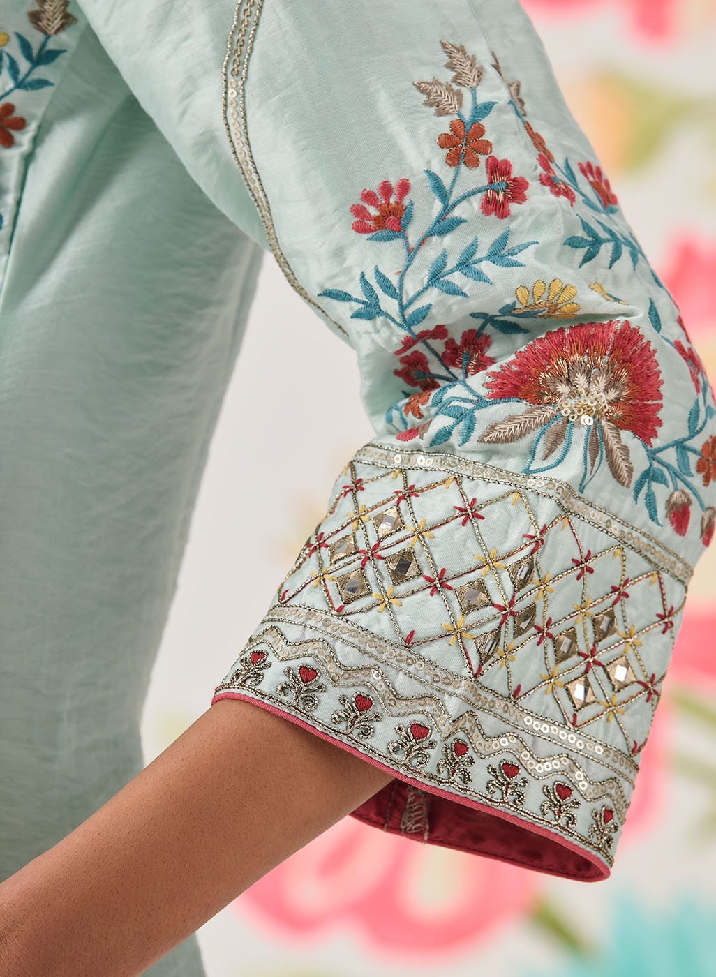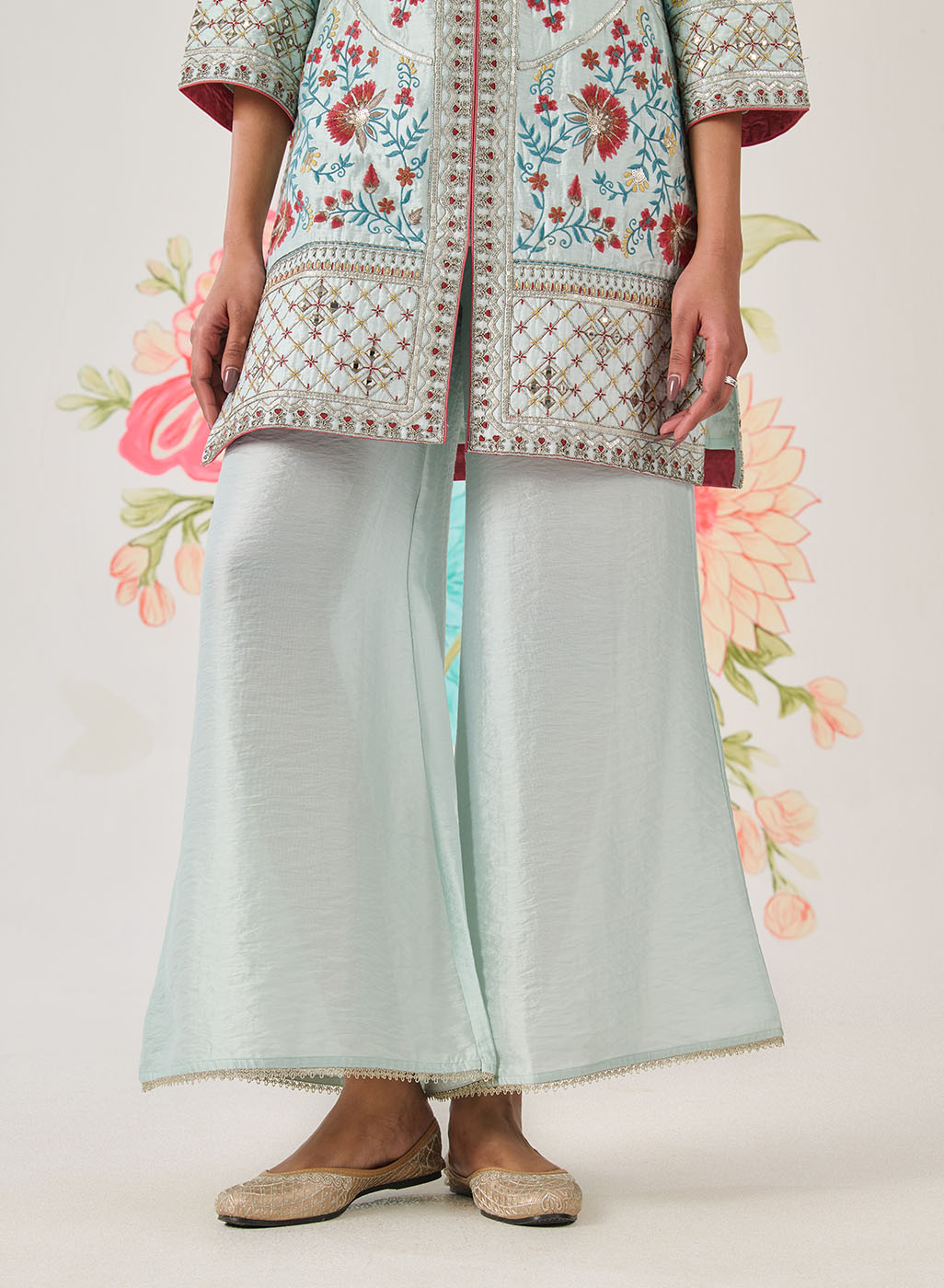 • Metallic dori lace finishes the dupatta and palazzo hems beautifully.