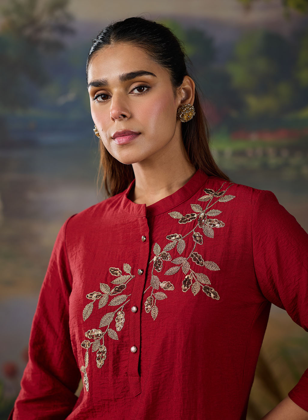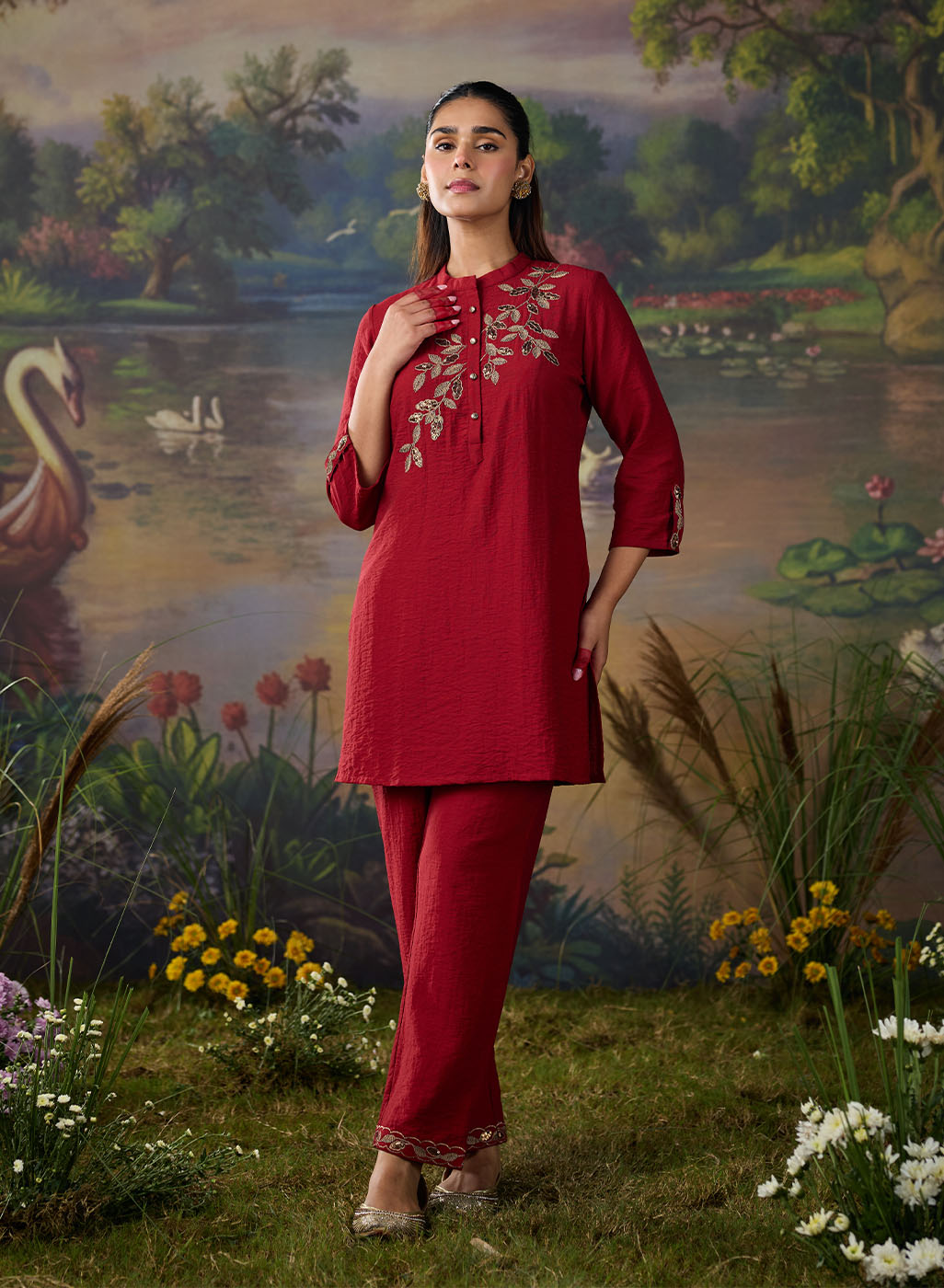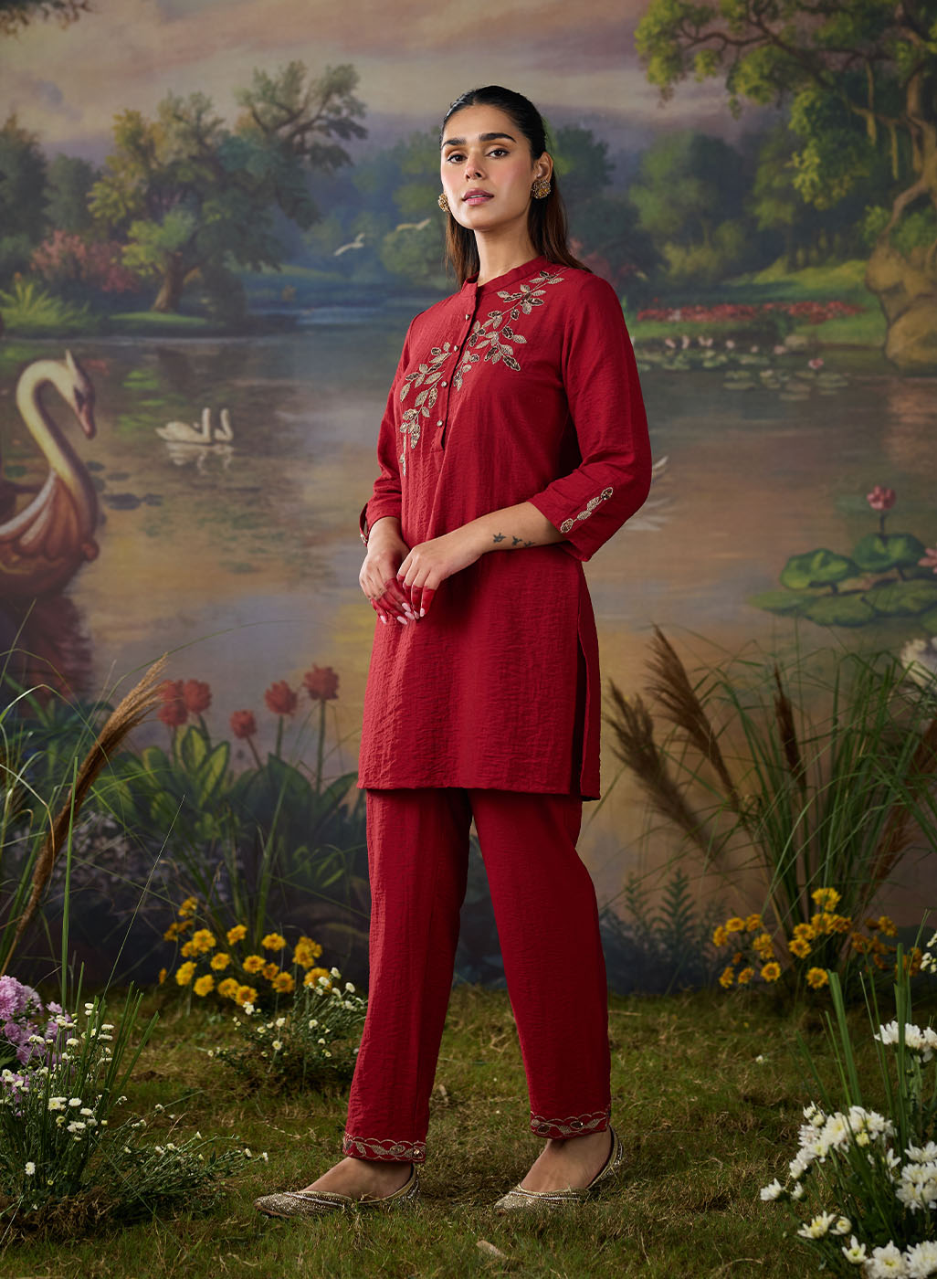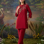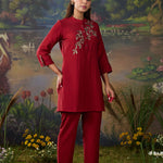 A striking red co-ord set that balances elegance with everyday ease. The straight top and bottoms are elevated by metallic dori embroidery with delicate sequin highlights, lending the ensemble a soft shimmer. The mandarin collar and straight placket sleeves frame the design, while the embroidery—branch-like motif cascading along the neckline and yoke—adds a natural grace. Paired with solid bottoms detailed with embroidery at the hem, this set is perfect for effortless festive sophistication.