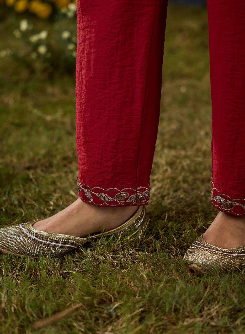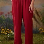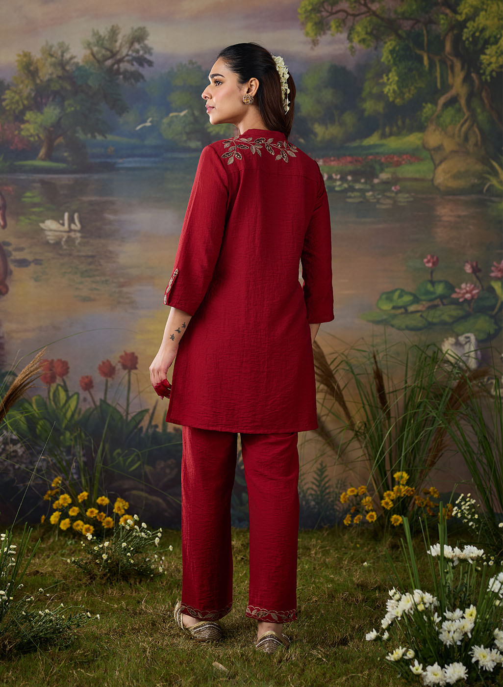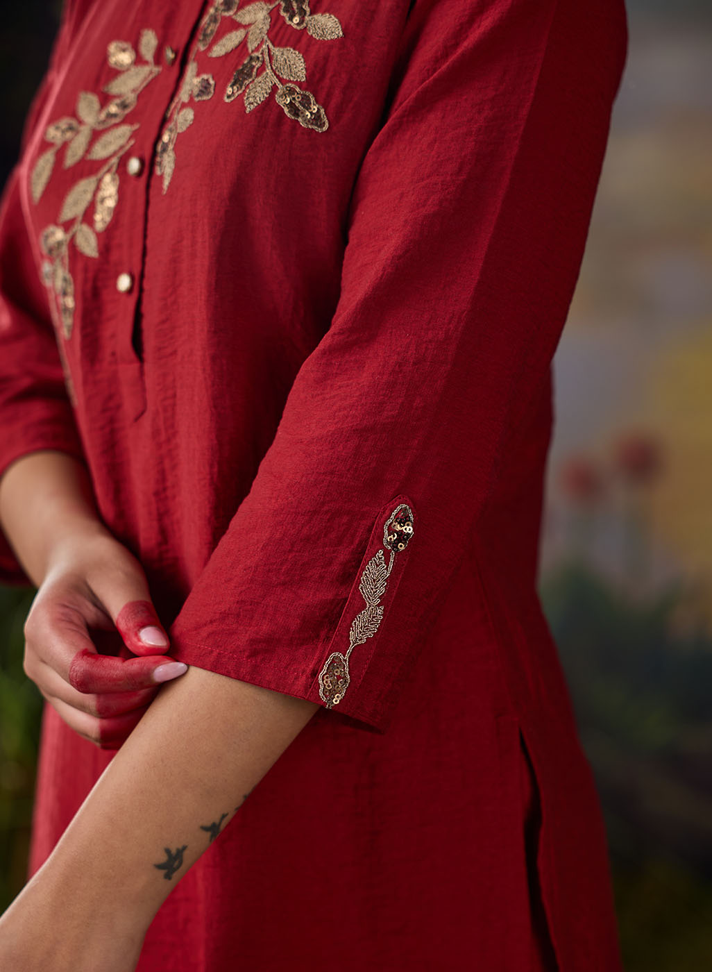 A striking red co-ord set that balances elegance with everyday ease. The straight top and bottoms are elevated by metallic dori embroidery with delicate sequin highlights, lending the ensemble a soft shimmer. The mandarin collar and straight placket sleeves frame the design, while the embroidery—branch-like motif cascading along the neckline and yoke—adds a natural grace. Paired with solid bottoms detailed with embroidery at the hem, this set is perfect for effortless festive sophistication.