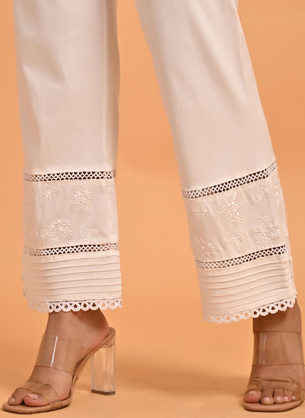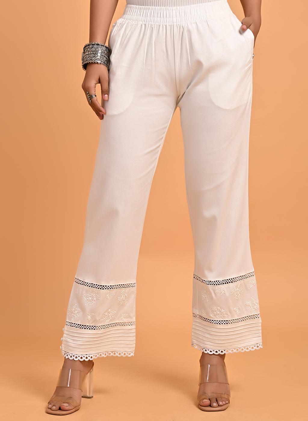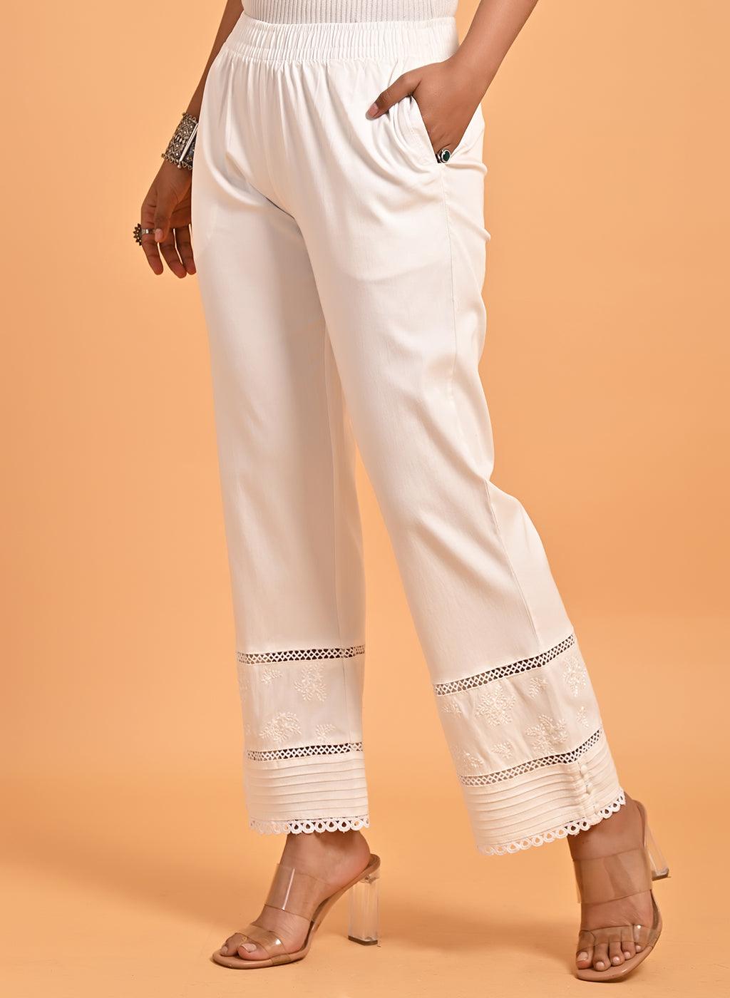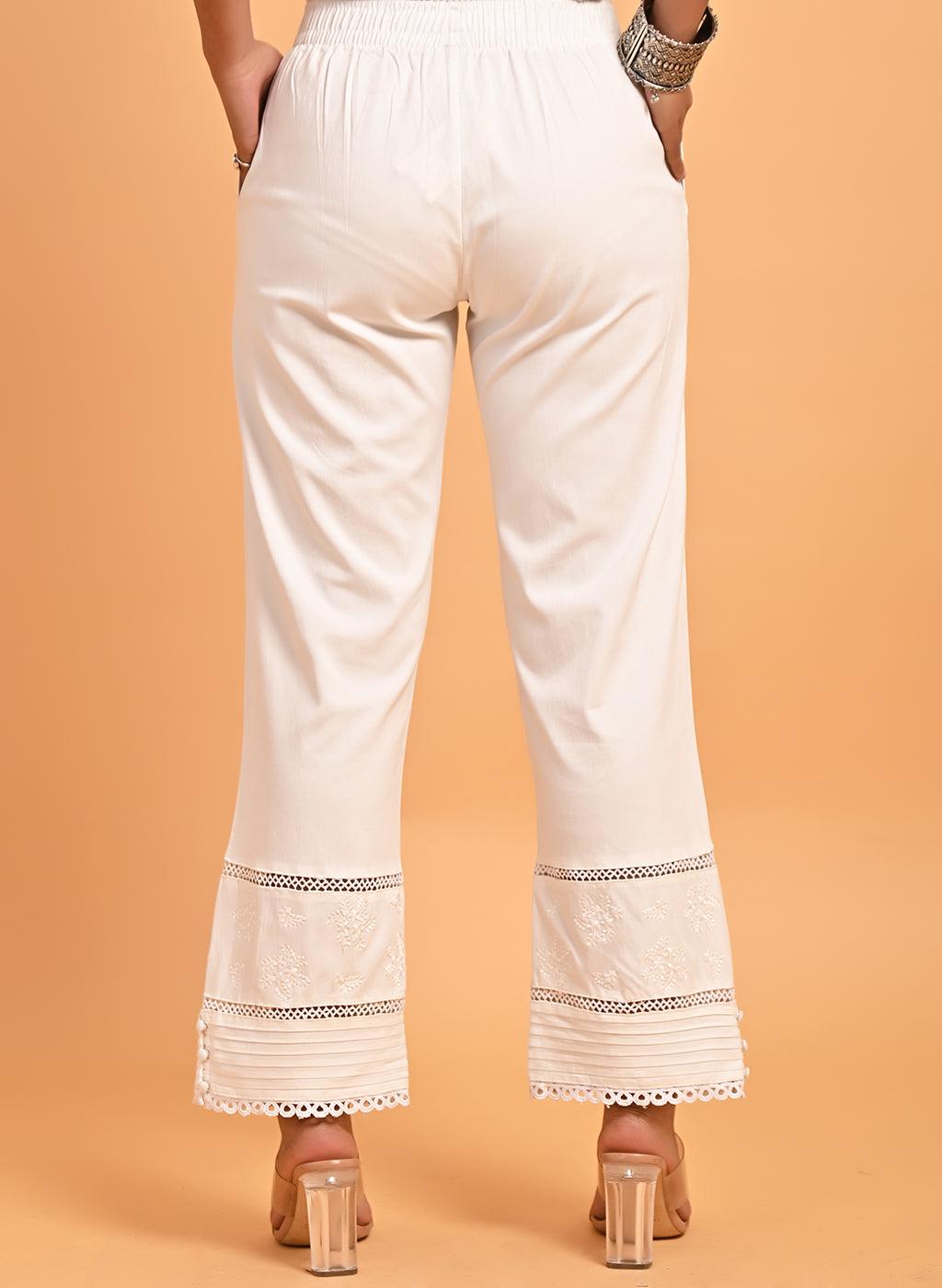 Ira White Embroidered Relaxed Fit Palazzo Pants for Women