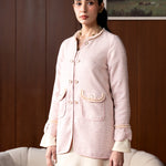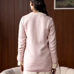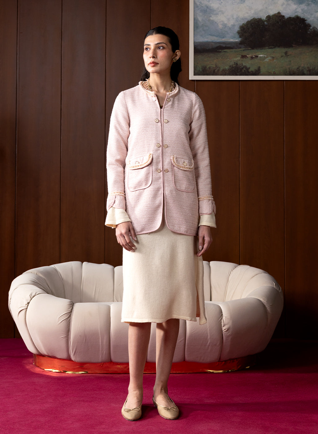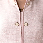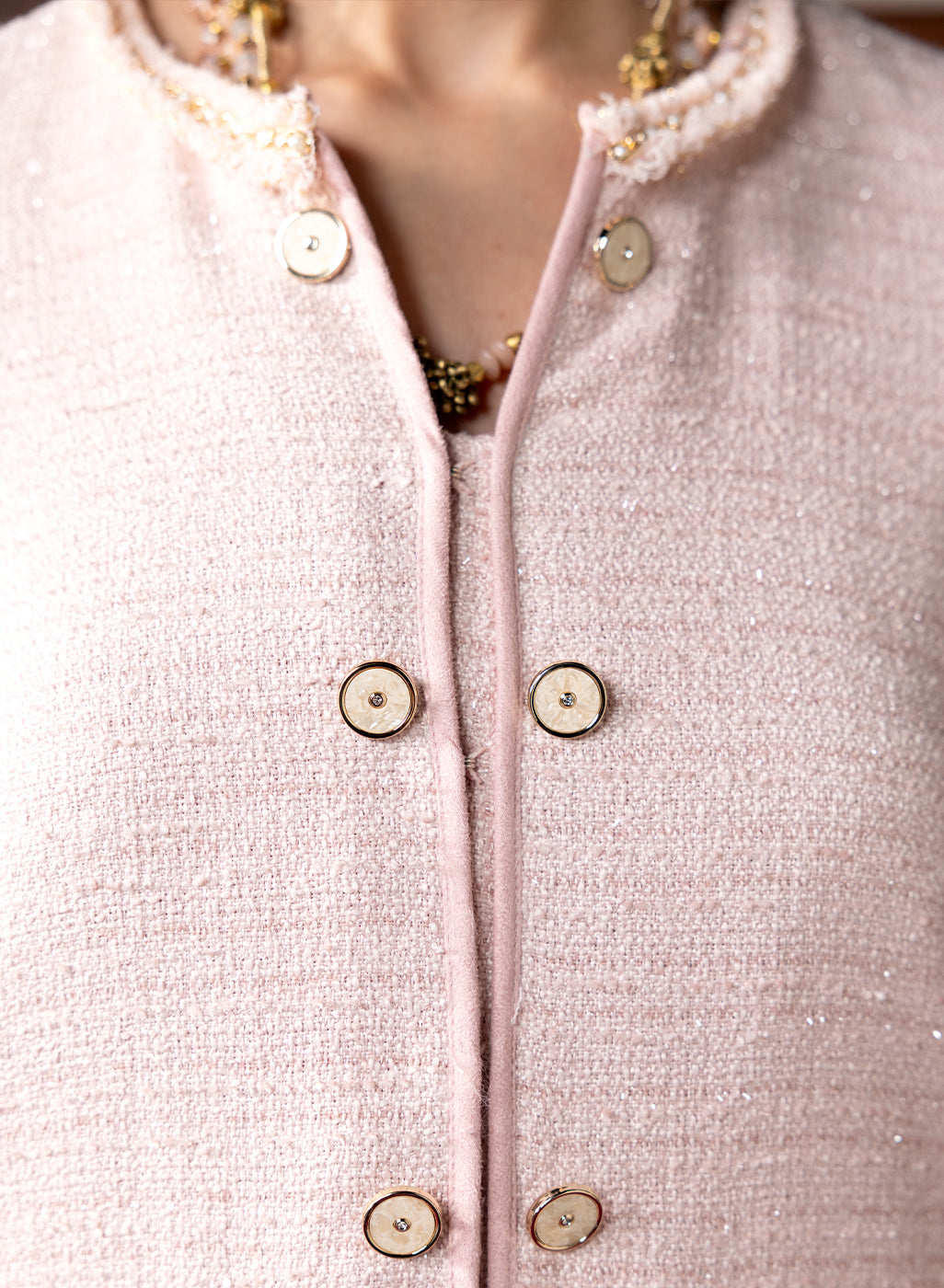 Soft, feminine, and undeniably luxe, this pink boucle jacket brings a romantic twist to winter styling. Its gentle blush tone paired with the textured weave gives it an elevated Parisian charm. The delicate pearl and metal accents add just the right hint of sparkle, making it a statement piece that still feels effortless, elegant, and beautifully refined.