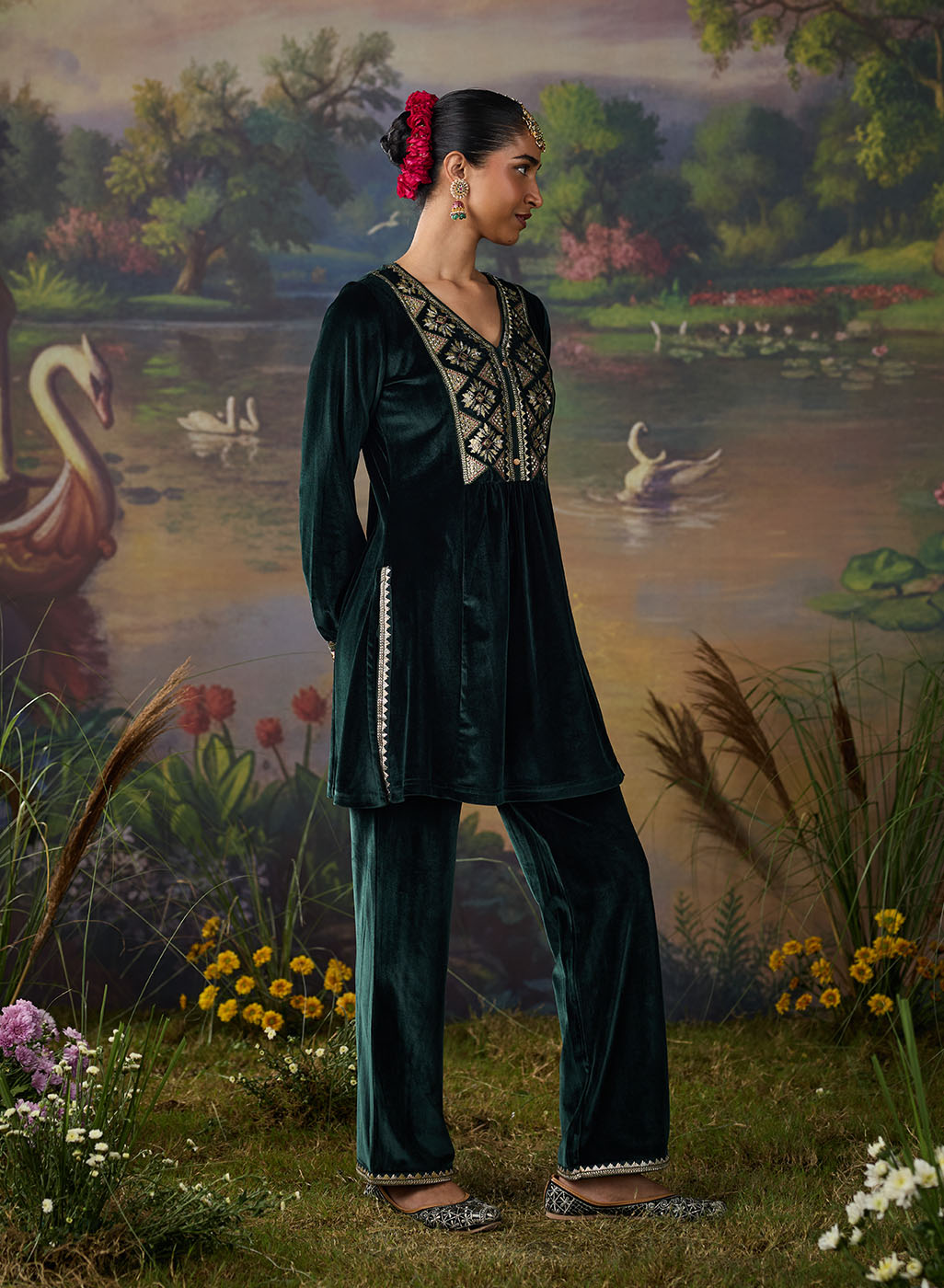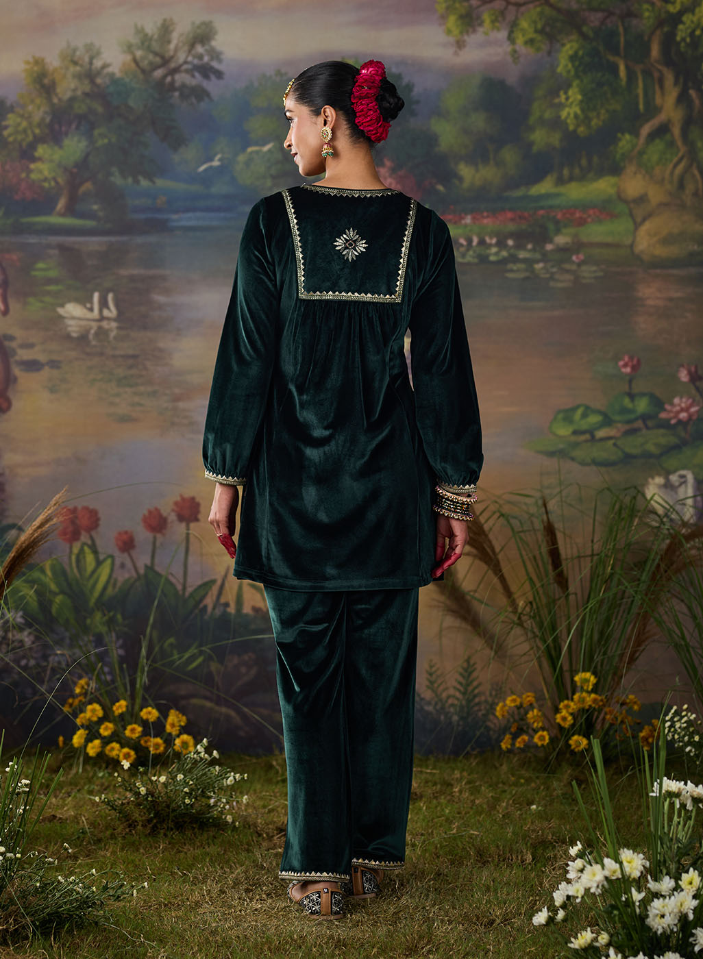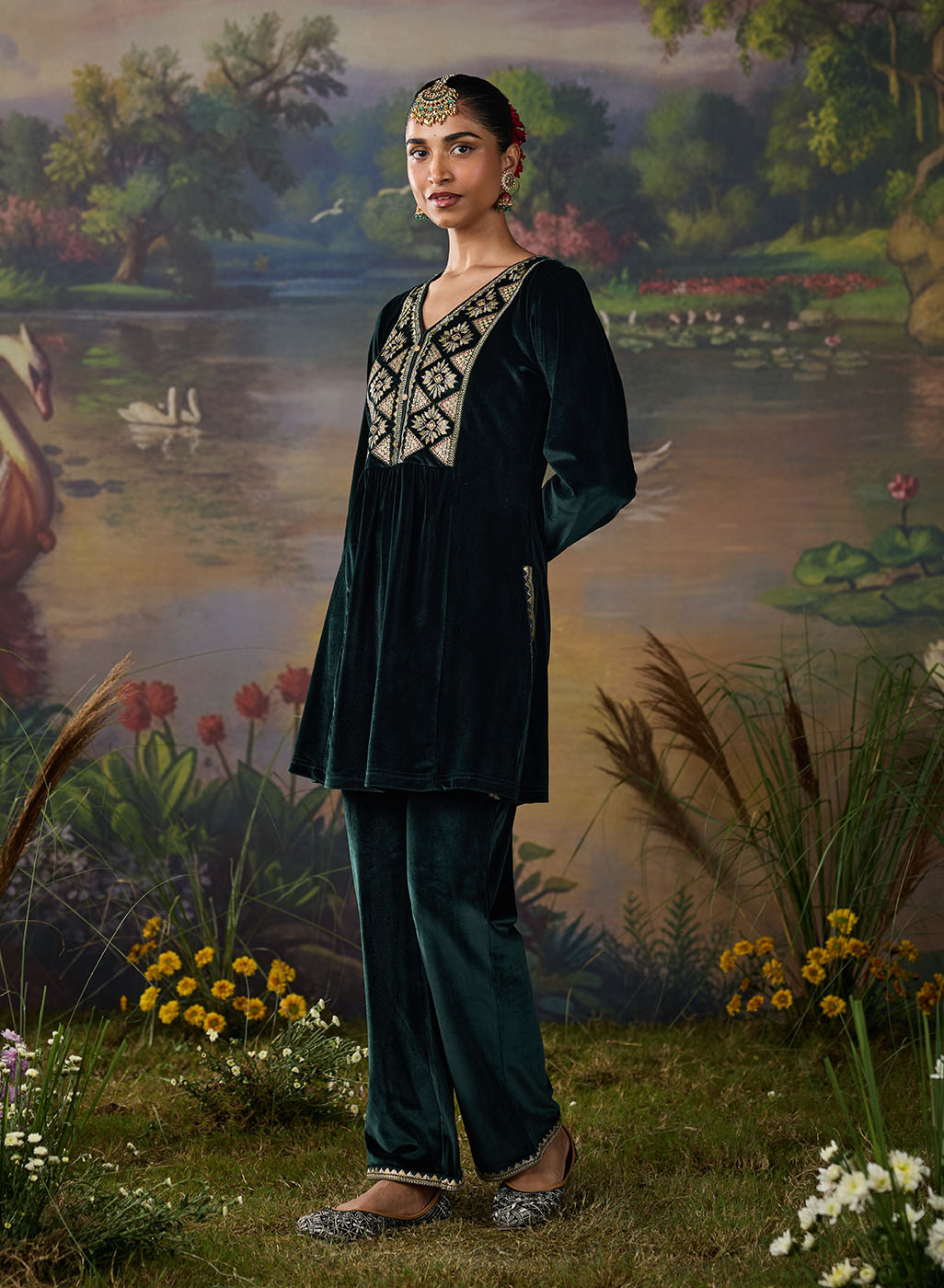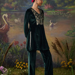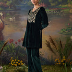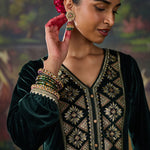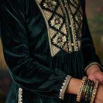 Drenched in the richness of emerald green, this velvet co-ord set redefines festive elegance. The lustrous fabric glows with decadent resham embroidery, accented by zari and foil highlights that illuminate the neckline, back yoke, and sleeve hems. Gathered sleeves and princess-seam panels bring graceful movement, while delicate embroidery accents along the slits and hem add a refined finish. A statement of quiet grandeur, it is perfect for evenings that call for effortless opulence.