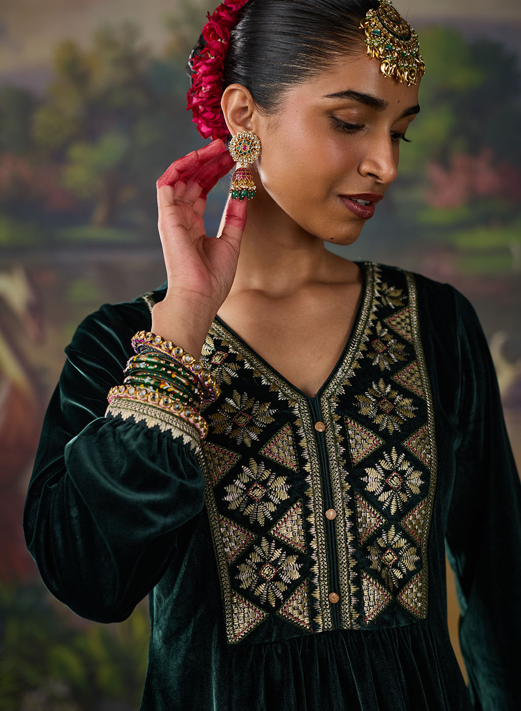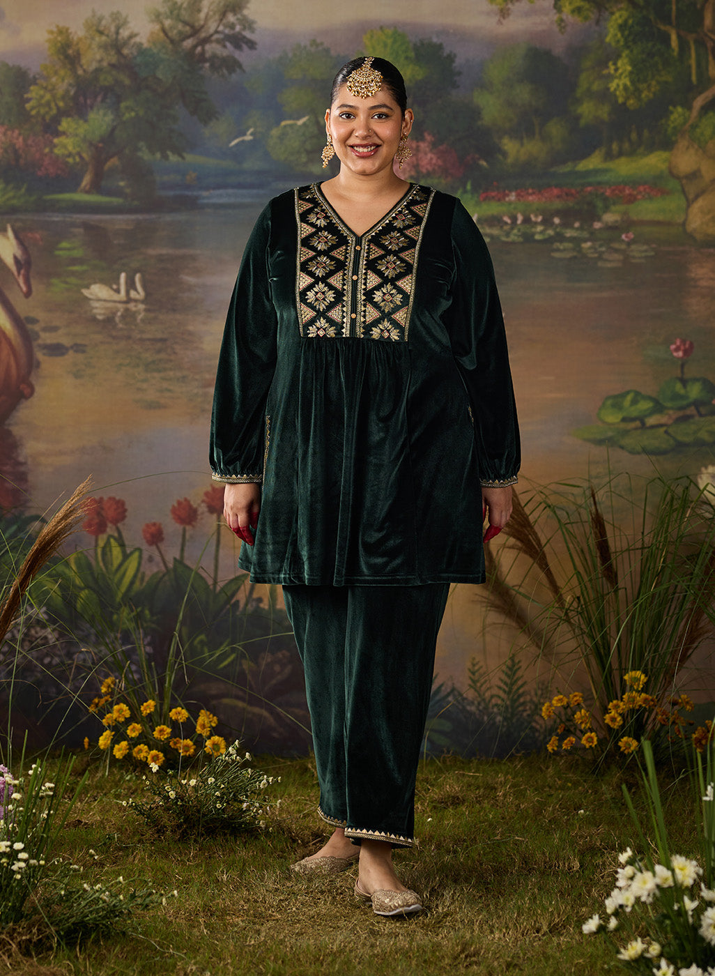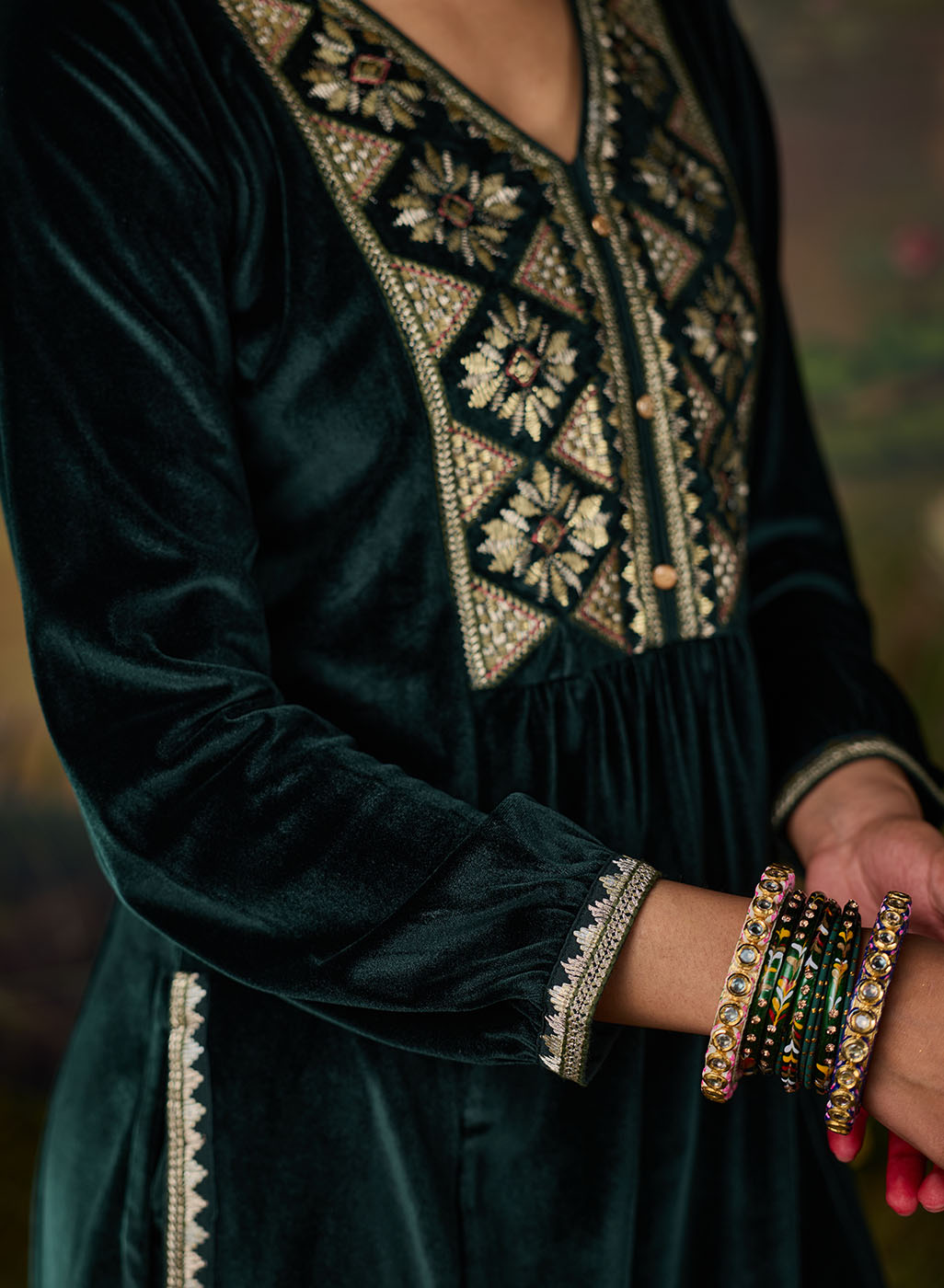 Drenched in the richness of emerald green, this velvet co-ord set redefines festive elegance. The lustrous fabric glows with decadent resham embroidery, accented by zari and foil highlights that illuminate the neckline, back yoke, and sleeve hems. Gathered sleeves and princess-seam panels bring graceful movement, while delicate embroidery accents along the slits and hem add a refined finish. A statement of quiet grandeur, it is perfect for evenings that call for effortless opulence.