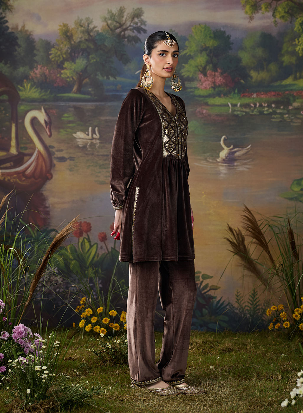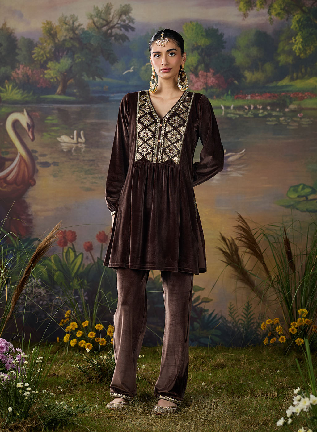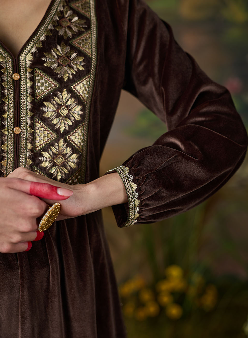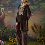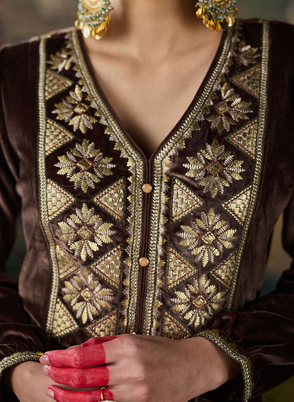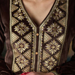 The epitome of opulence, this velvet co-ord set redefines festive elegance. The lustrous fabric glows with decadent resham embroidery, accented by zari and foil highlights that illuminate the neckline, back yoke, and sleeve hems. Gathered sleeves and princess-seam panels bring graceful movement, while delicate embroidery accents along the slits and hem add a refined finish. A statement of quiet grandeur, it is perfect for evenings that call for effortless opulence.