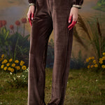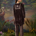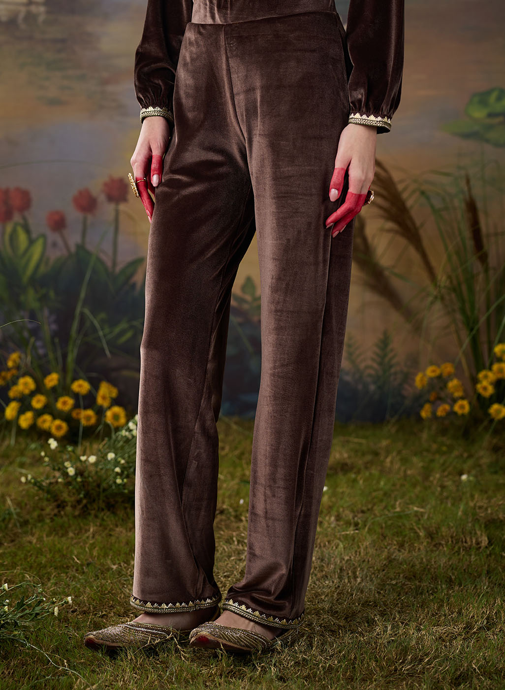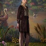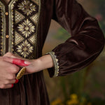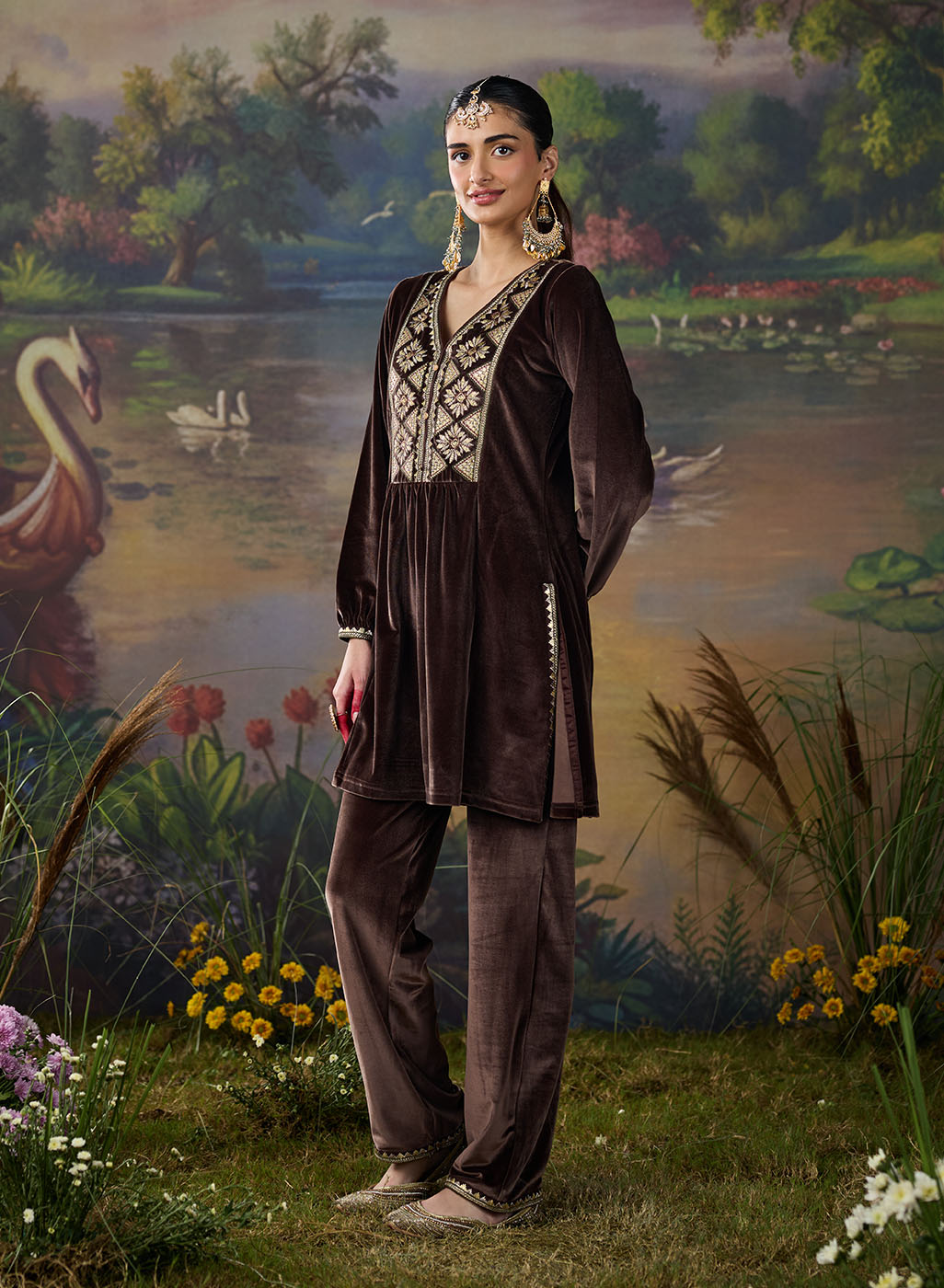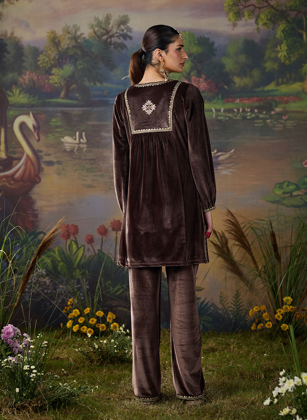 The epitome of opulence, this velvet co-ord set redefines festive elegance. The lustrous fabric glows with decadent resham embroidery, accented by zari and foil highlights that illuminate the neckline, back yoke, and sleeve hems. Gathered sleeves and princess-seam panels bring graceful movement, while delicate embroidery accents along the slits and hem add a refined finish. A statement of quiet grandeur, it is perfect for evenings that call for effortless opulence.