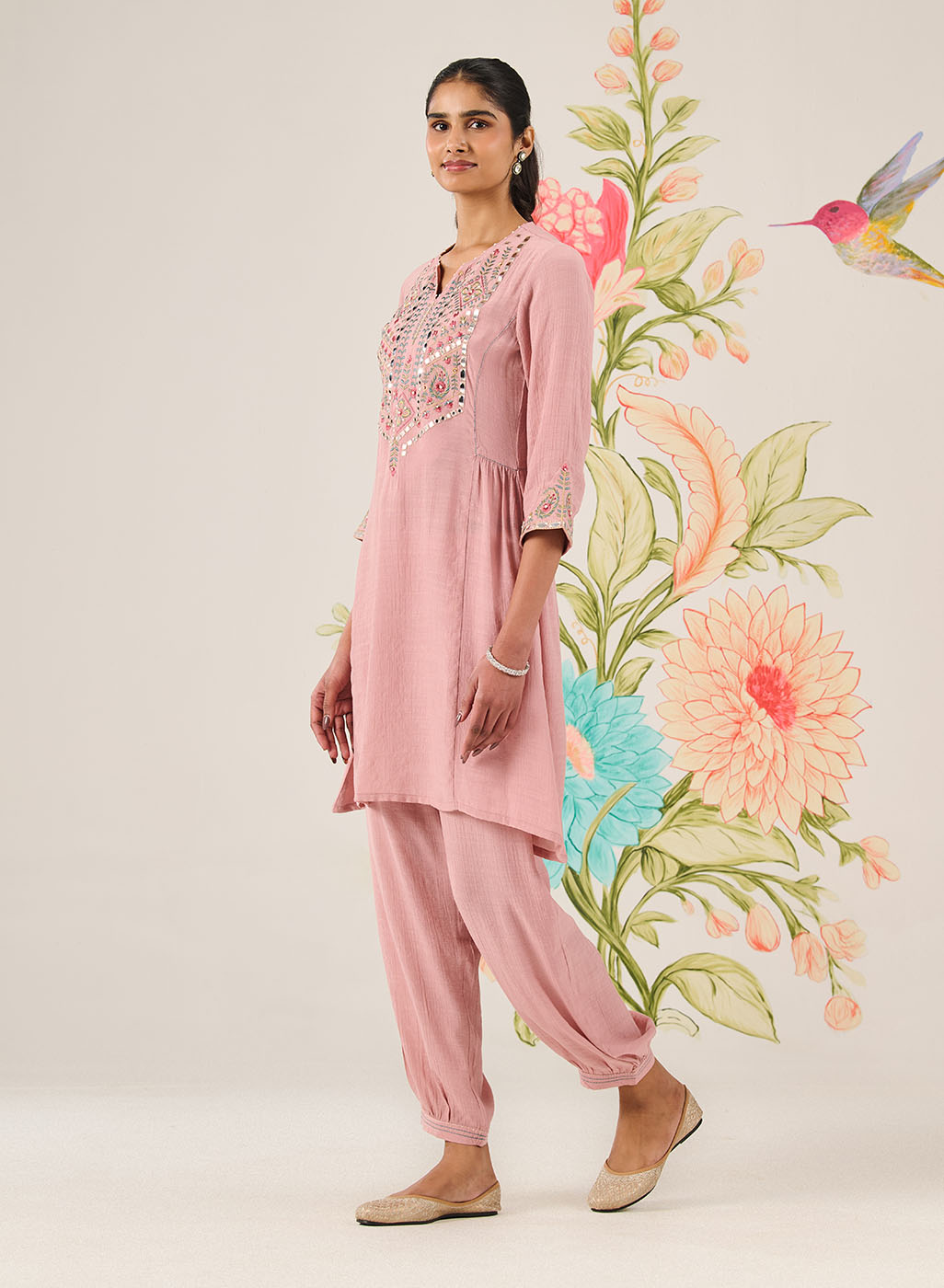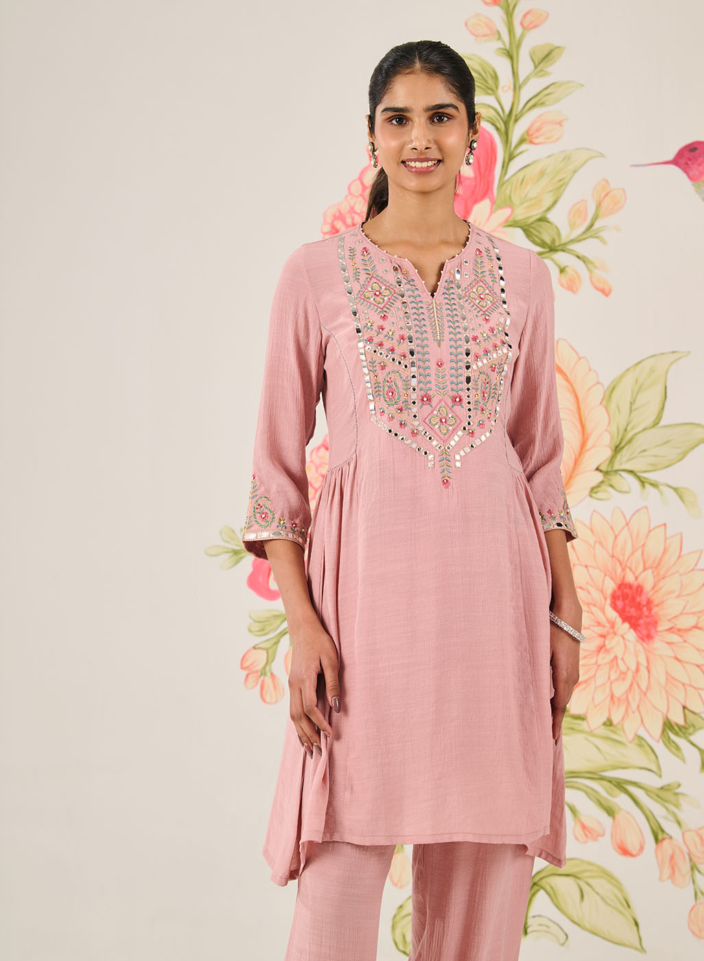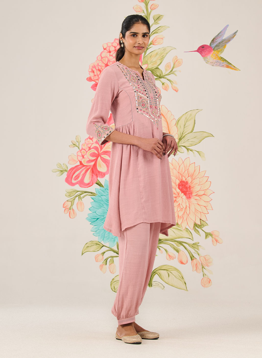 Romantic and festive, this pink co-ord set blends soft colour with intricate craftsmanship. Mirror accents, bead highlights and gathers come together in a silhouette that feels celebratory yet effortlessly wearable.