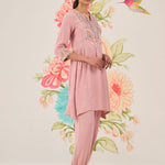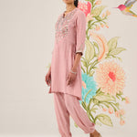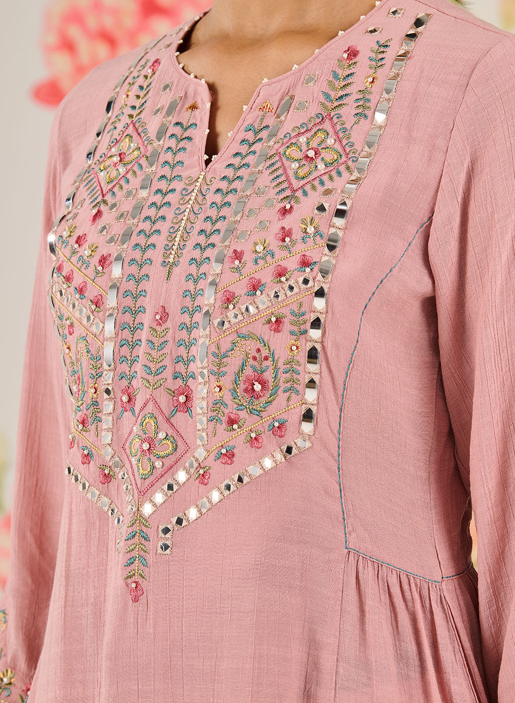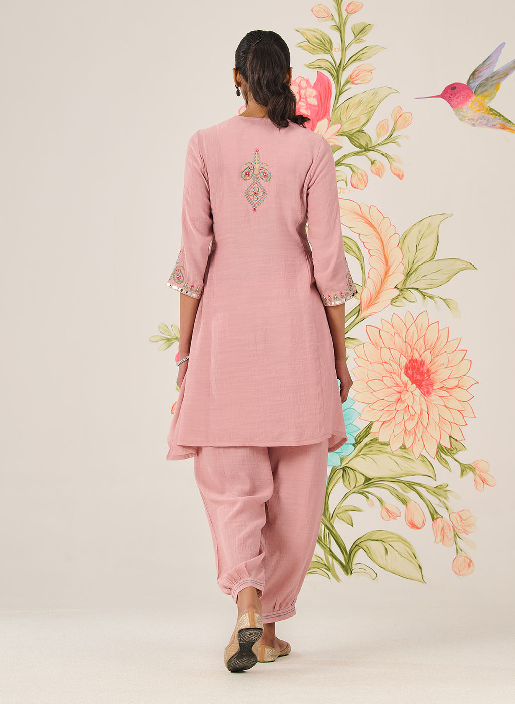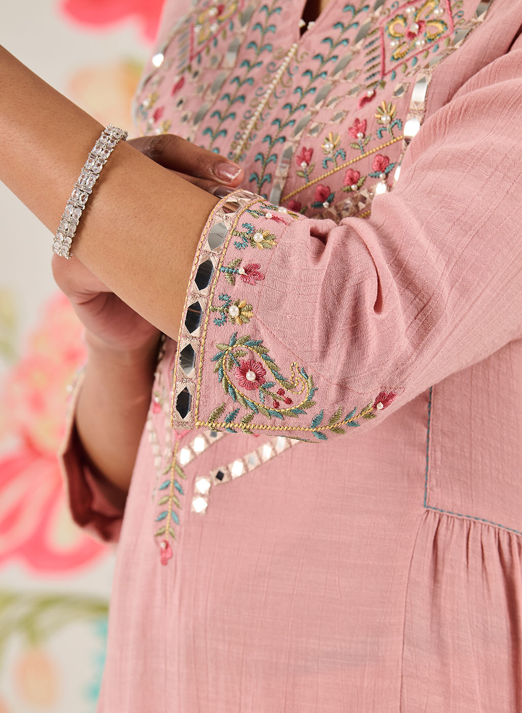 Romantic and festive, this pink co-ord set blends soft colour with intricate craftsmanship. Mirror accents, bead highlights and gathers come together in a silhouette that feels celebratory yet effortlessly wearable.