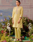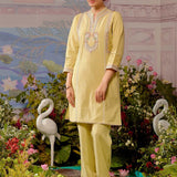 Yellow Schiffili Embroidered Cotton Co-ord Set with 3/4th Sleeves - Lakshita
