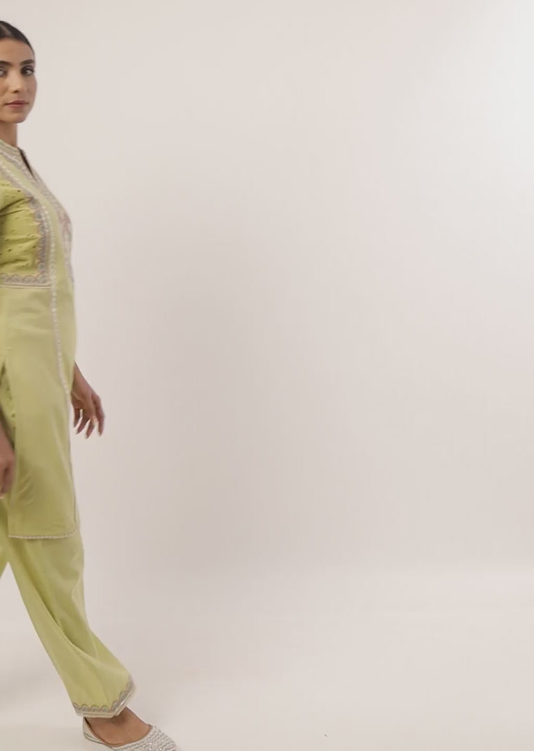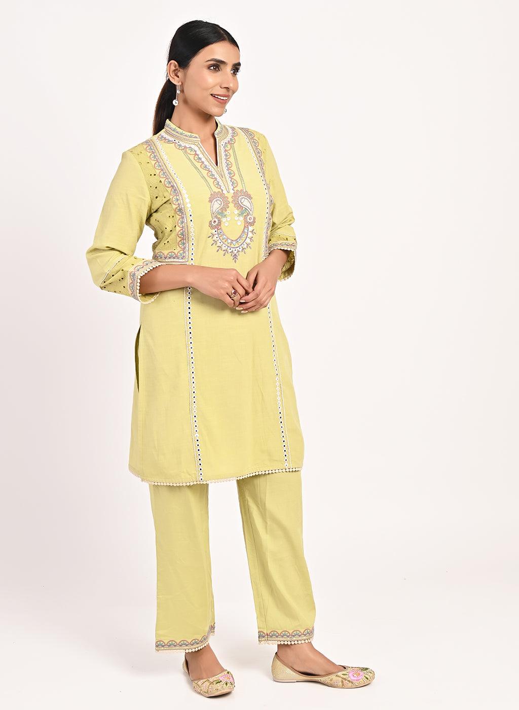 This Light green-coloured Schiffli embroidered co-ord set is precisely what you need to dazzle everyone this season. Accentuated by the dori detail on the front and schiffli embroidery on the sleeves, this cotton co-ord set will make you radiate charm. Complete the look with light makeup for that sophisticated look.