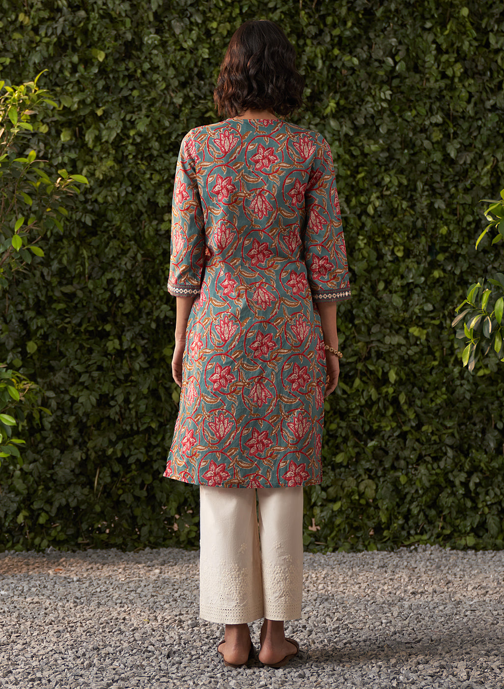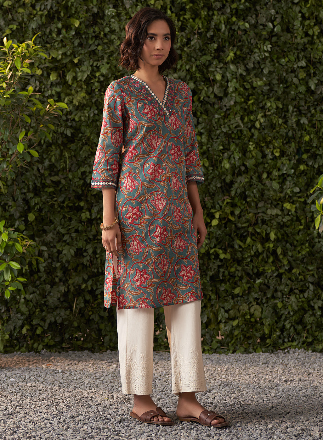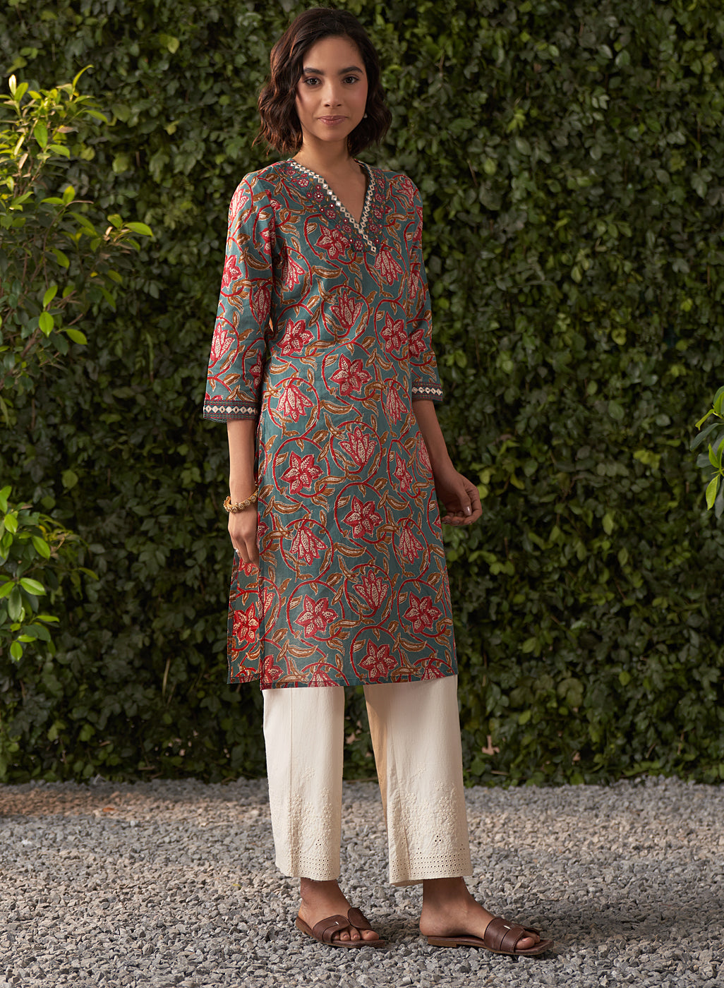 Zaina Emerald Green Printed Cotton Kurta for Women